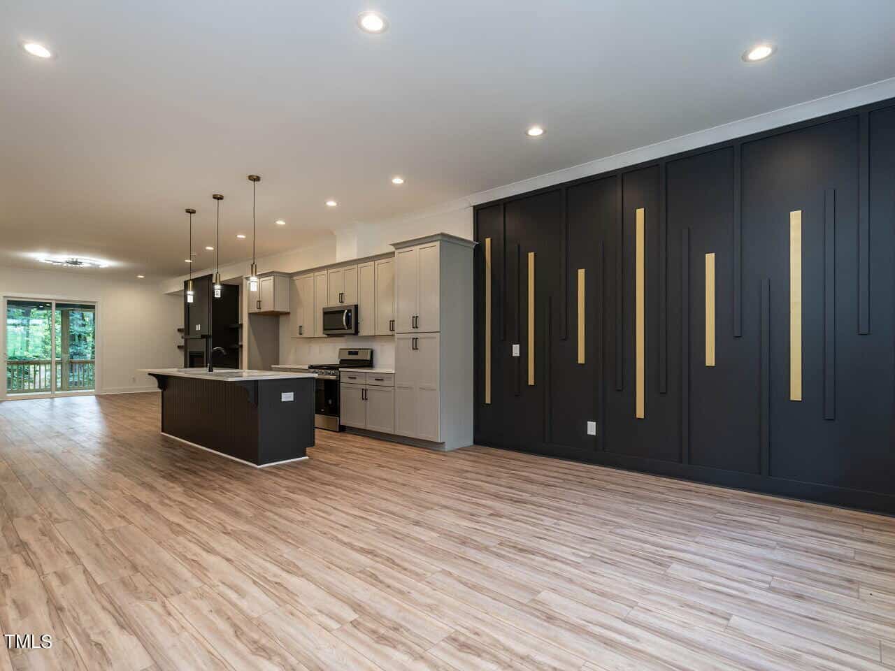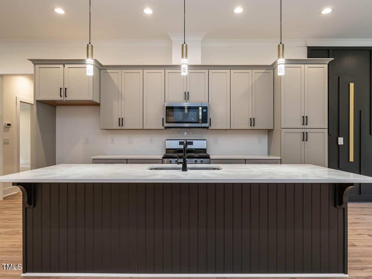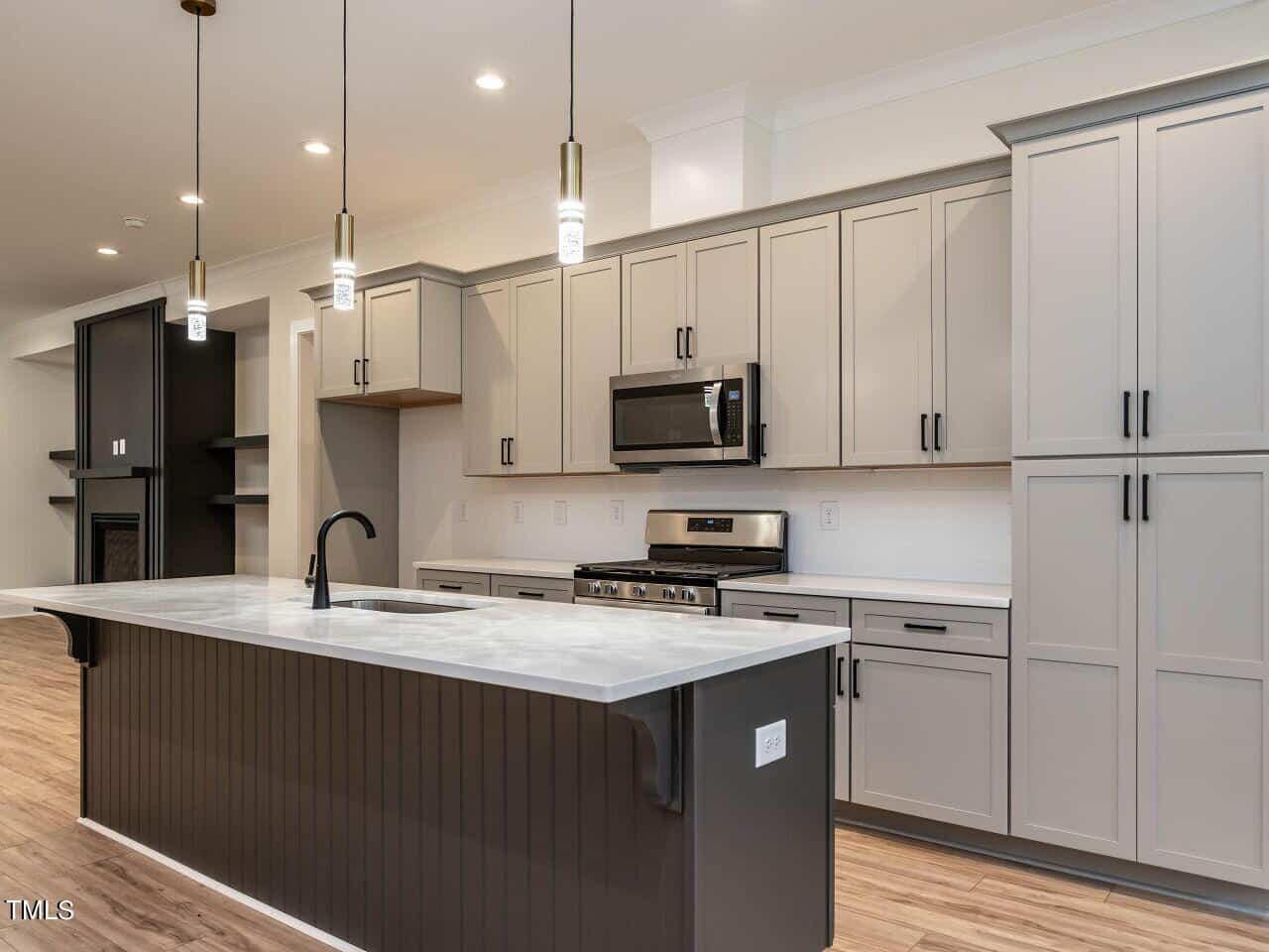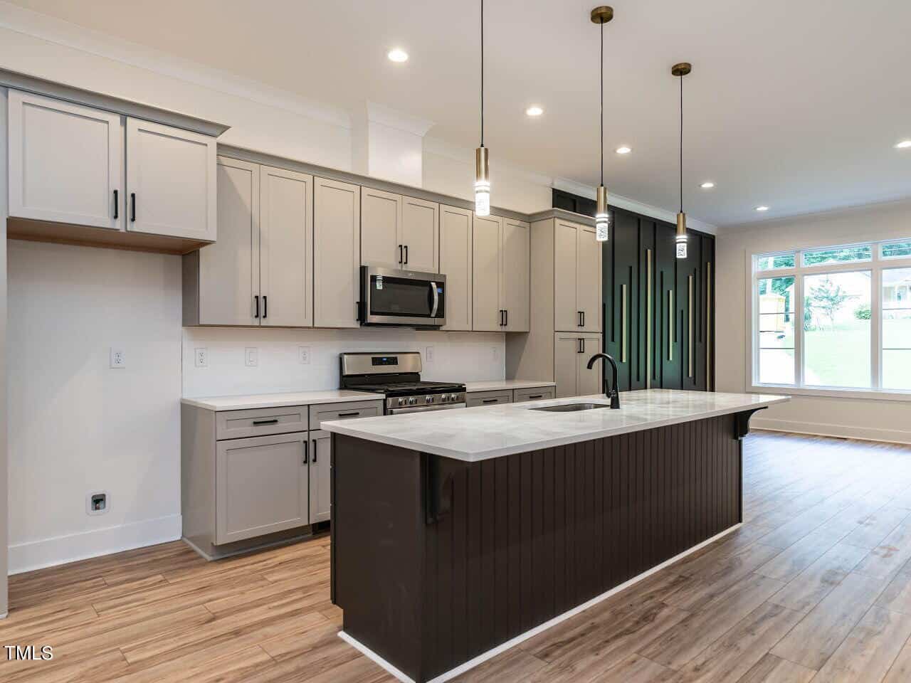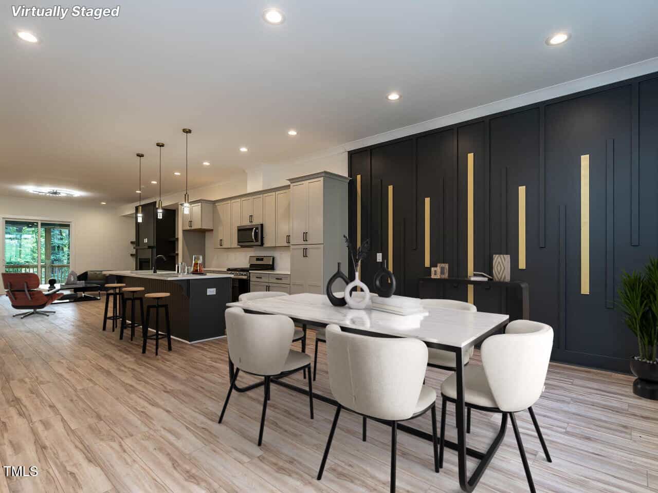 The plan is open offering a spacious dining area highlighted with a custom vertical feature wall as you enter (very attractive and dramatic). This leads to the elegant kitchen with white Quartz counters, a large center island, gas range, beautiful cabinetry and more. The fireplace in the great room is surrounded by inset floor to ceiling built-ins of various heights, very smart design, the room leads to a large screened porch & grilling deck.