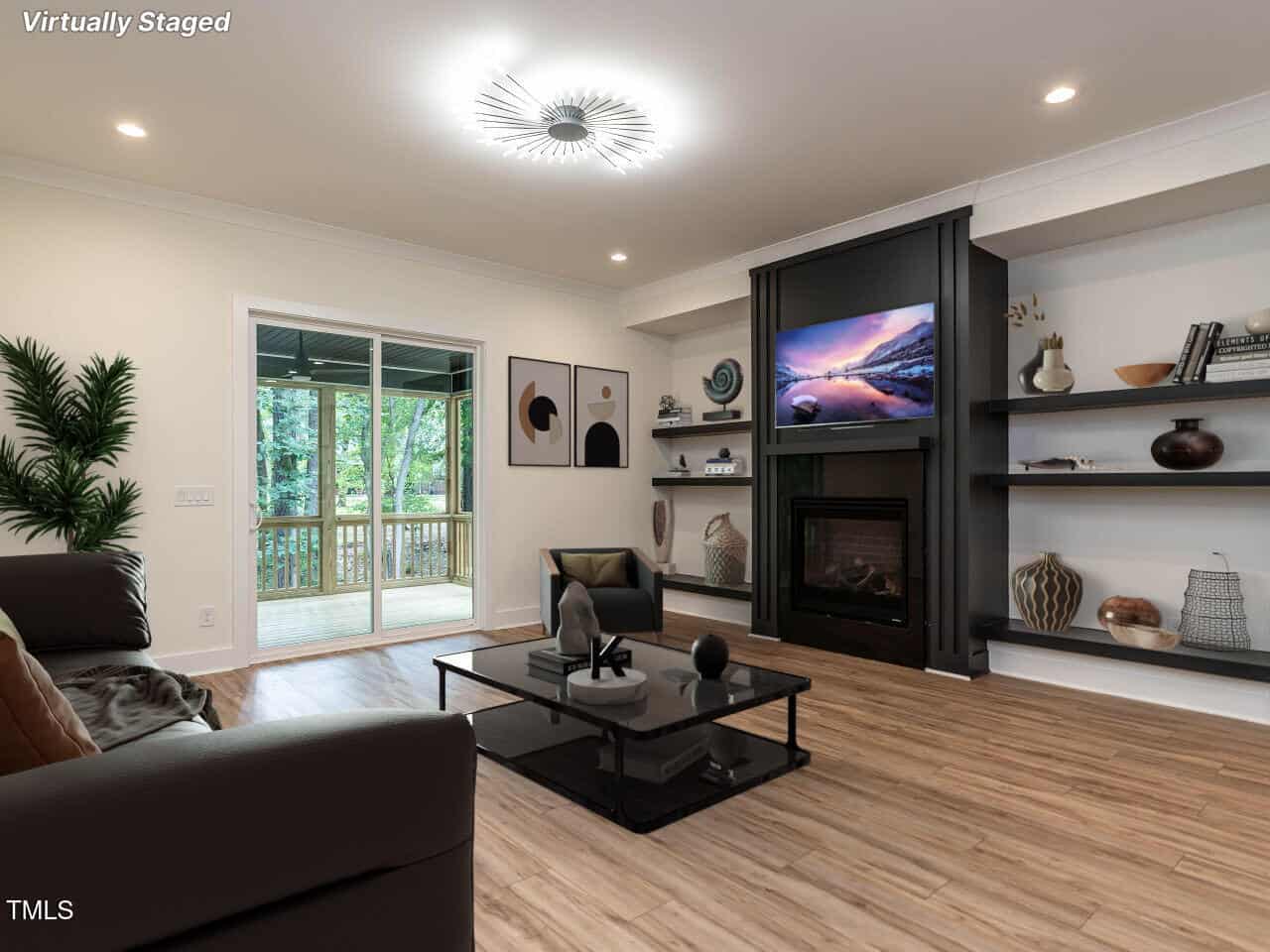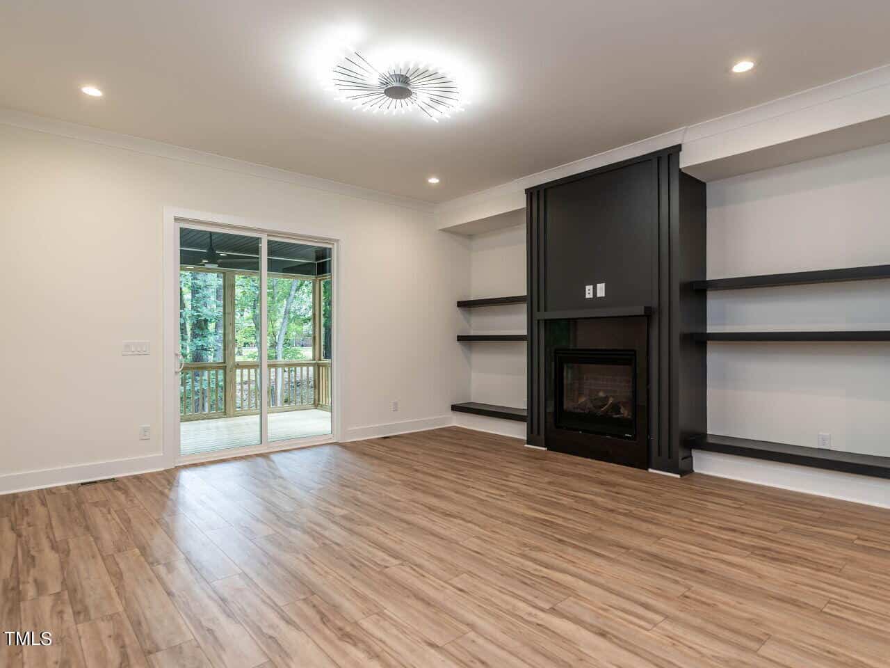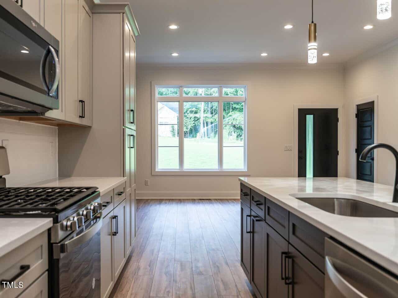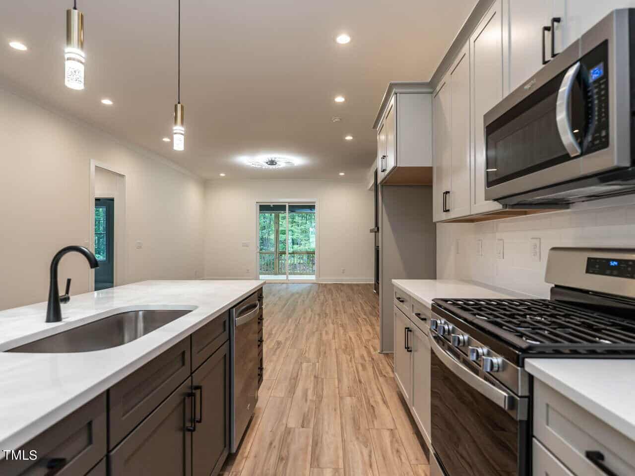 The plan is open offering a spacious dining area highlighted with a custom vertical feature wall as you enter (very attractive and dramatic). This leads to the elegant kitchen with white Quartz counters, a large center island, gas range, beautiful cabinetry and more. The fireplace in the great room is surrounded by inset floor to ceiling built-ins of various heights, very smart design, the room leads to a large screened porch & grilling deck.