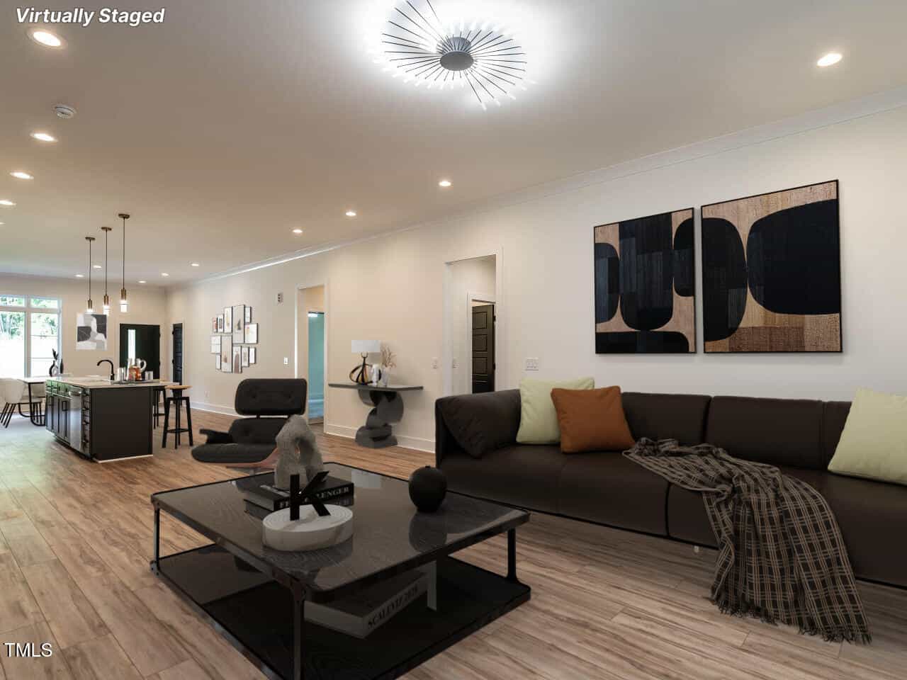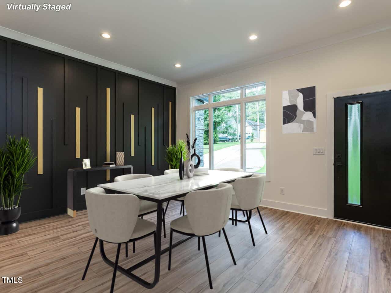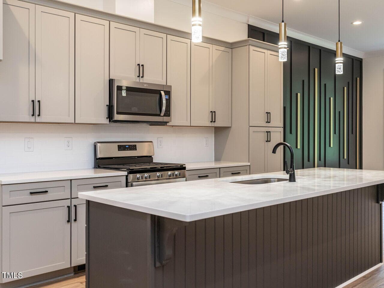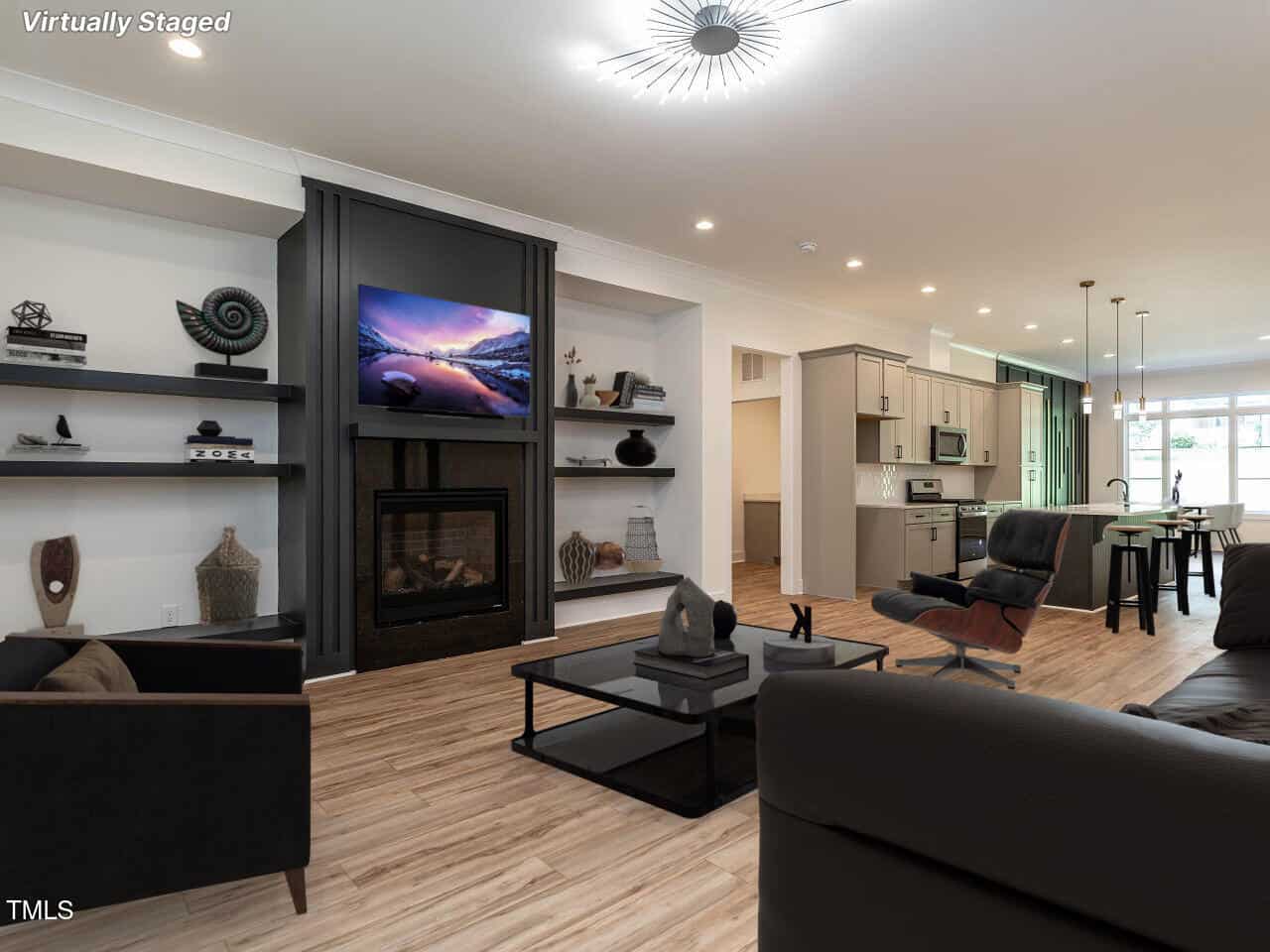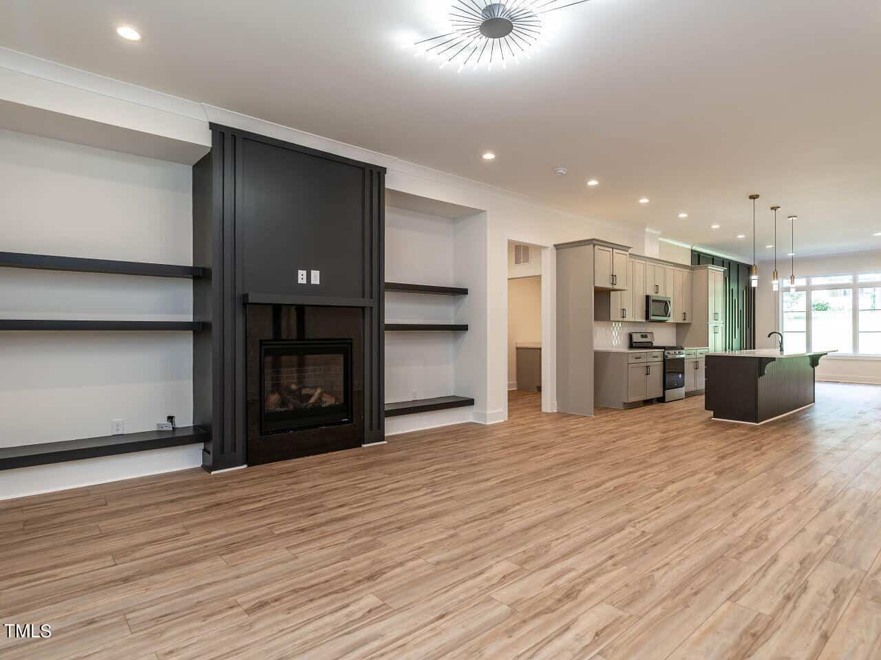 The plan is open offering a spacious dining area highlighted with a custom vertical feature wall as you enter (very attractive and dramatic). This leads to the elegant kitchen with white Quartz counters, a large center island, gas range, beautiful cabinetry and more. The fireplace in the great room is surrounded by inset floor to ceiling built-ins of various heights, very smart design, the room leads to a large screened porch & grilling deck.