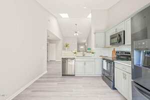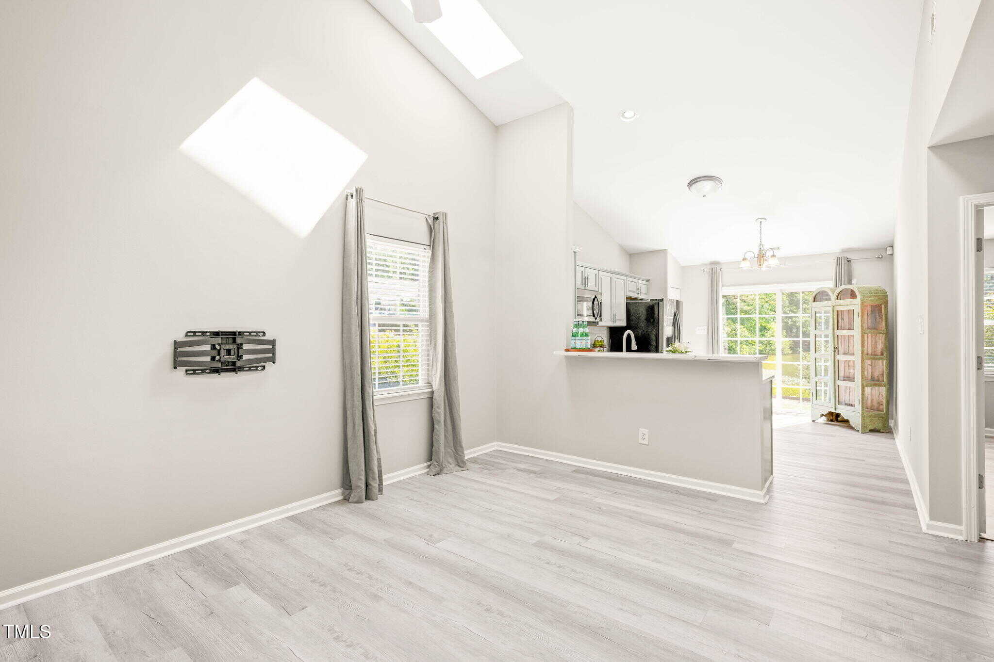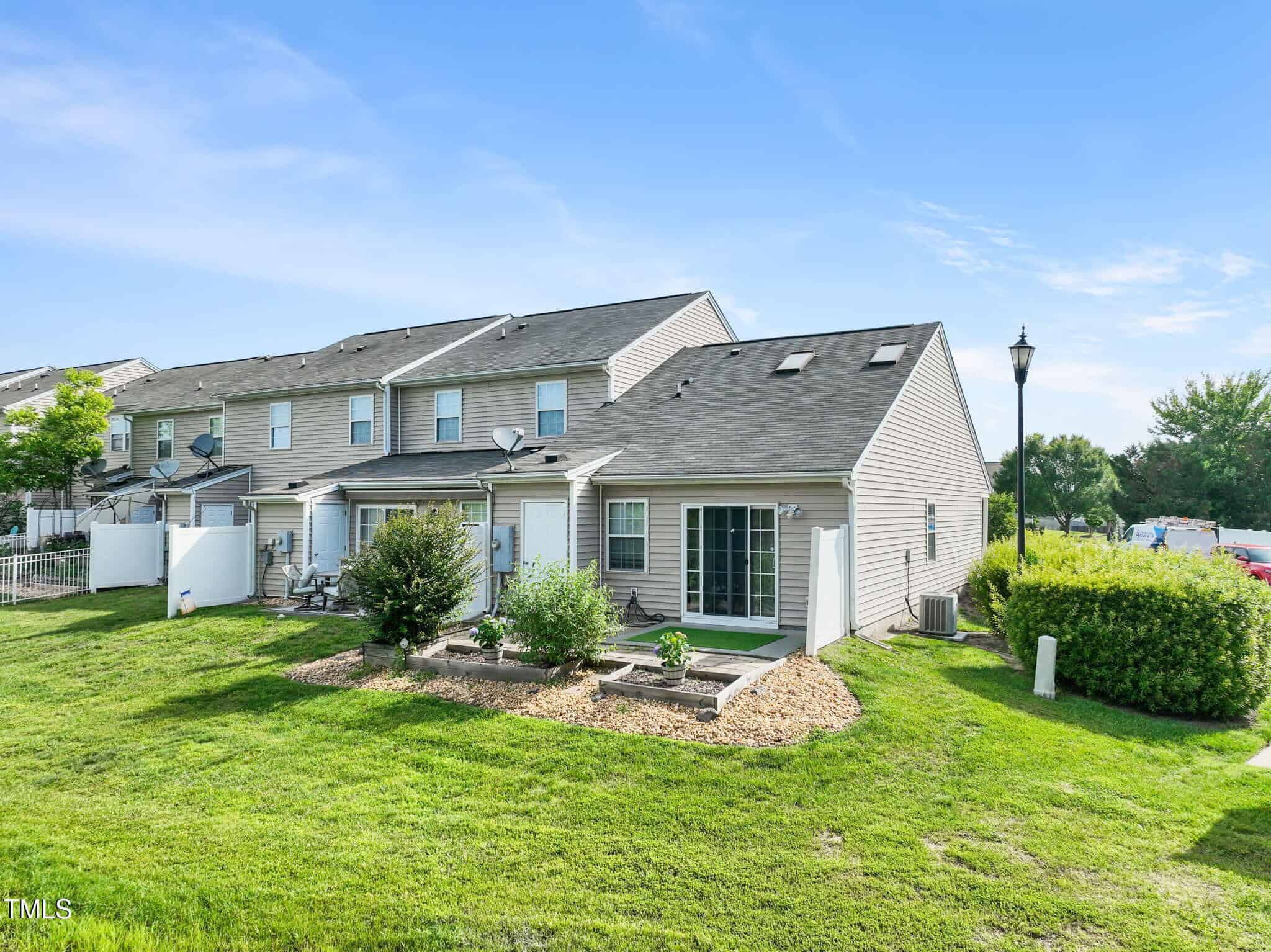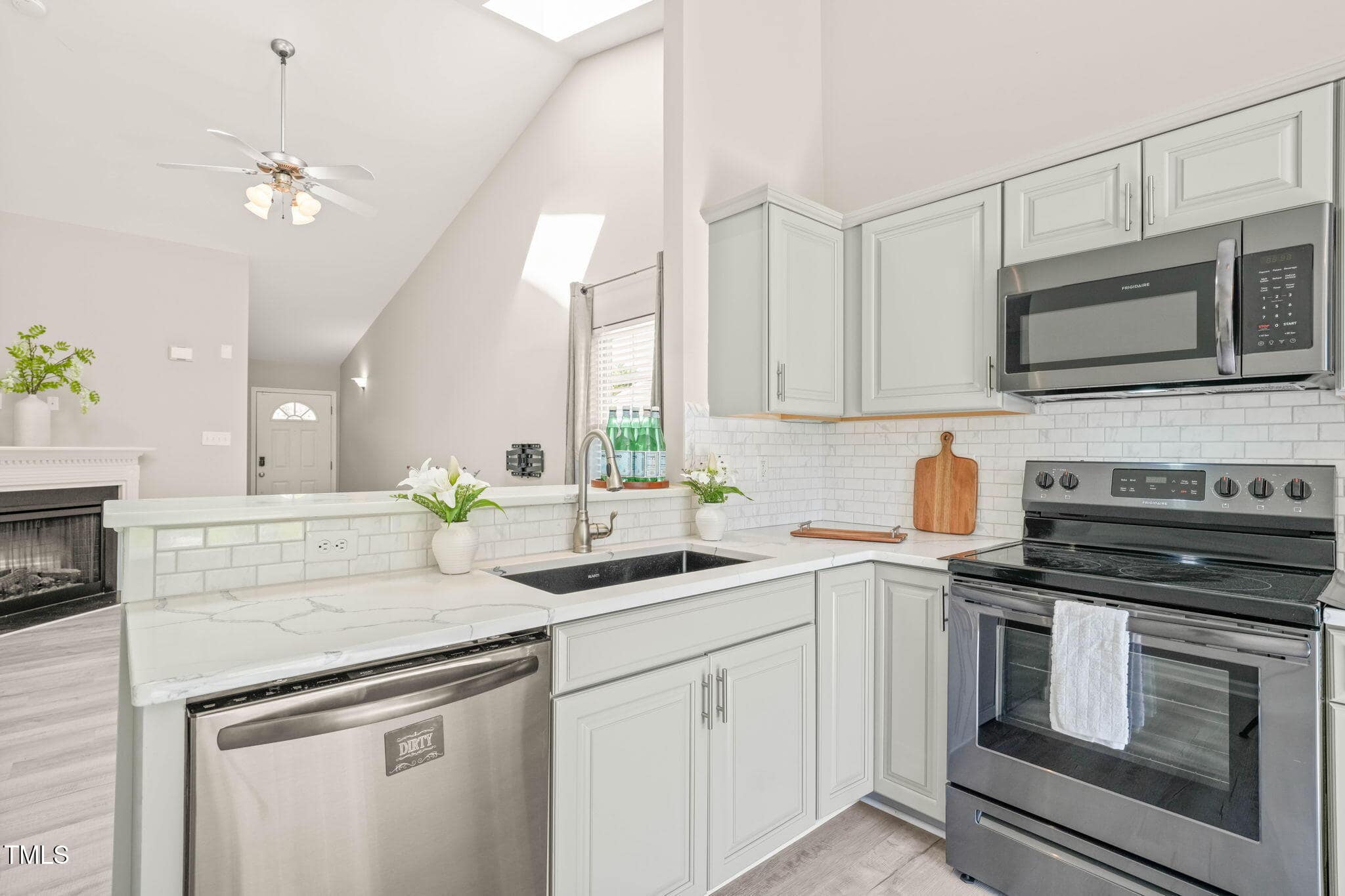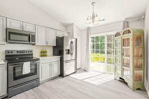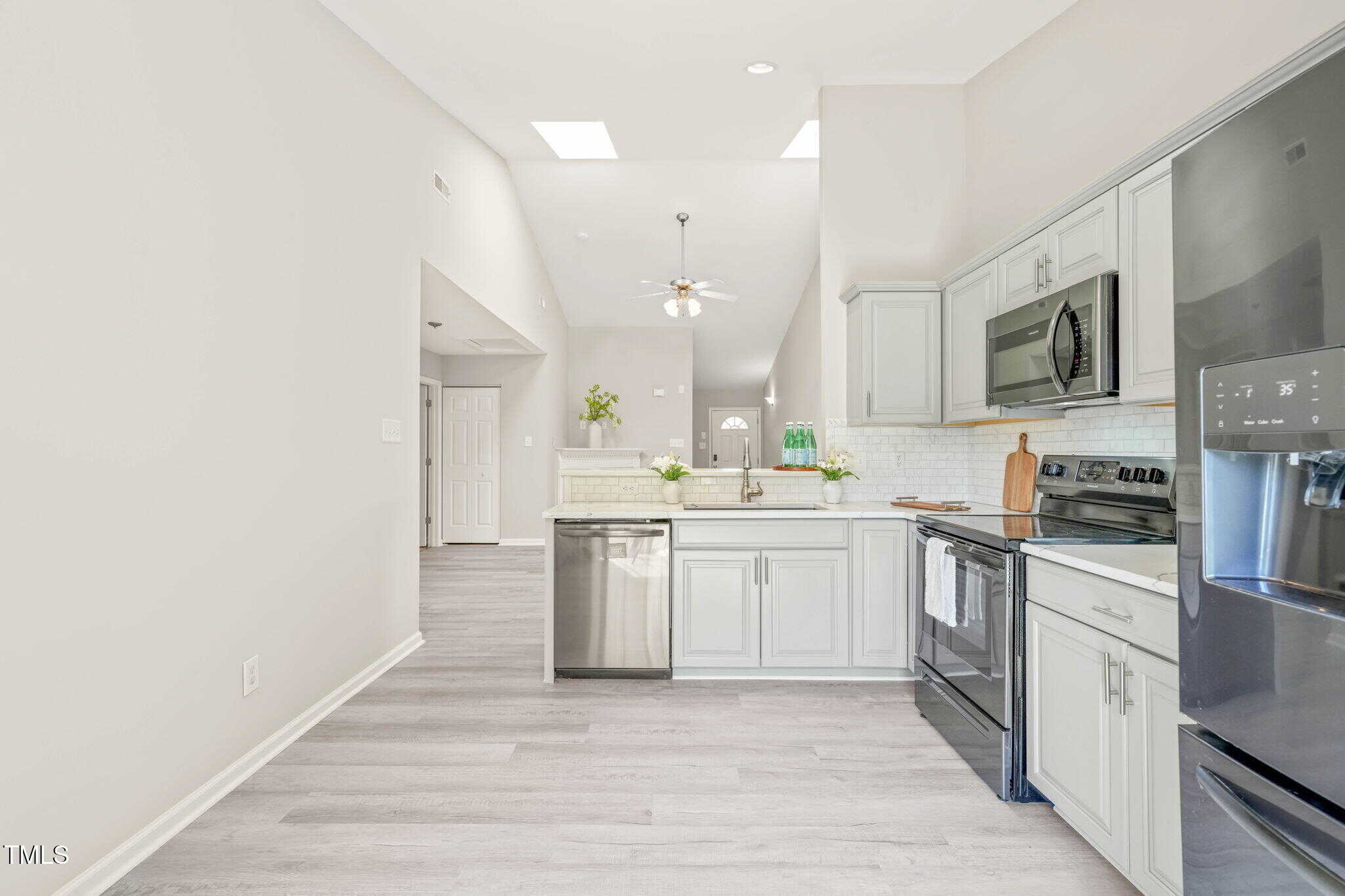 Beautifully renovated, all one level end unit townhome walking distance to Falls Lake Academy! This 2bd/2ba unit has fresh paint, LVP floors, new kitchen cabinets, new bathroom vanities, new toilets, new sinks/faucets, new quartz countertops and tile backsplash all in 2023. New complete kitchen appliance package 2023. New hot water heater 2025. Corner fireplace is electric and can be enjoyed as a visual feature or with heat option.