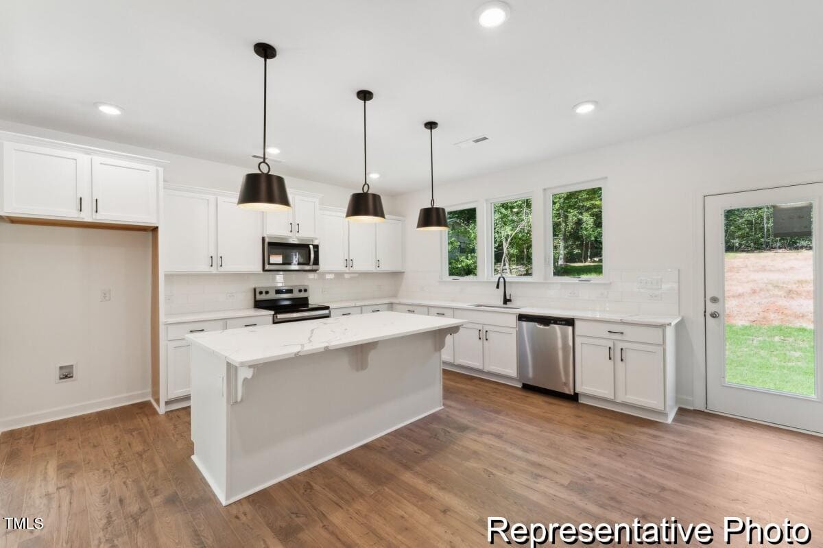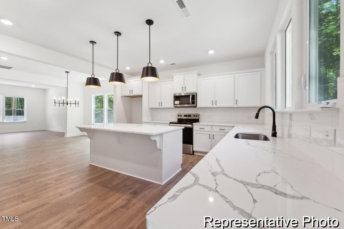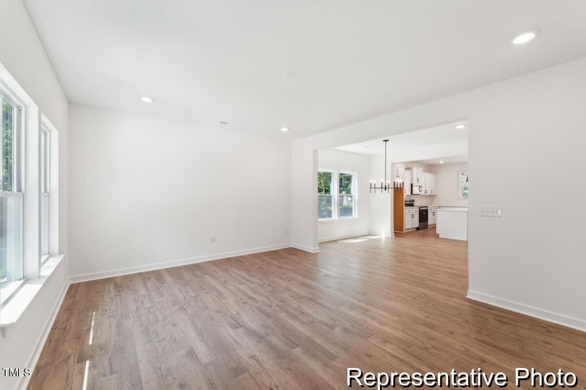 This semi-custom home in the gated, resort-style Lake Royale community offers 3BR/3BA and 2,450 sq ft of thoughtfully designed living space. The Lexa plan features an open great room, dining area, and a stunning kitchen with quartz countertops, upgraded cabinetry, tile backsplash, and stainless steel appliances. A private study with media closet and a screened-in rear deck complete the main level.
