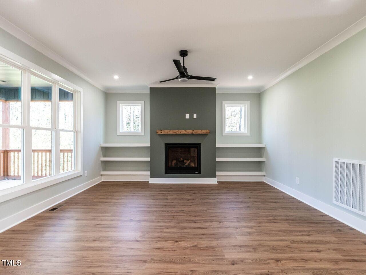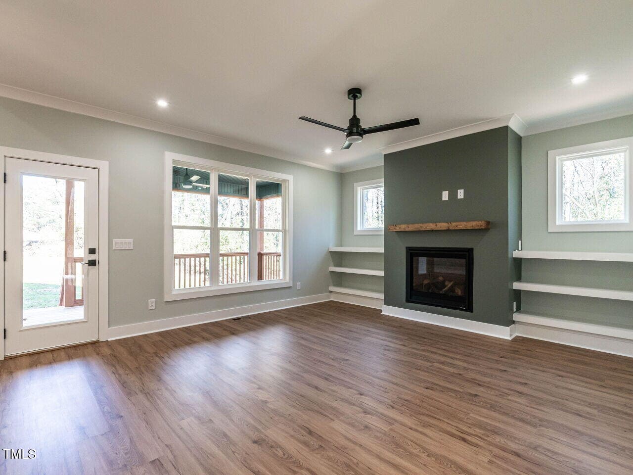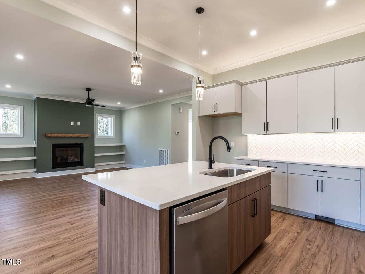 Stunning Mid-Century Modern Home with Thoughtful Design Step into this classic Mid-Century Modern masterpiece, featuring a sleek, neutral interior and a seamless open floor plan. The spacious great room invites you to relax by the gas fireplace, complete with a floating wood mantel and custom shelving on both sides. From here, step out onto the expansive covered back porch, perfect for entertaining or quiet evenings. The chef’s kitchen is a showstopper, with a large center island featuring an oversized sink, dramatic tile backsplash, and undermount lighting that highlights the light-above-cabinetry design. Storage is a breeze with a spacious pantry. The bright and airy dining area overlooks the private, level backyard, offering a serene view for every meal. The primary bedroom is a true retreat, boasting a custom accent wall, a spacious closet with recessed and accent lighting, and an en-suite bathroom that wows with a fully tiled glass walk-in shower (complete with a bench!) and a floating double vanity with undermount lighting. Each guest bedroom is unique, with features like soaring ceilings, oversized windows, and generous custom closets. The high functionality continues with a well-appointed laundry room that includes a drying bar and storage shelves, plus plenty of extra storage with two linen closets and a hallway coat closet. The oversized two-car garage impresses with a finished interior, high ceilings, and a large window in the vaulted area, adding even more natural light to this home. This home perfectly blends style, functionality, and comfort.