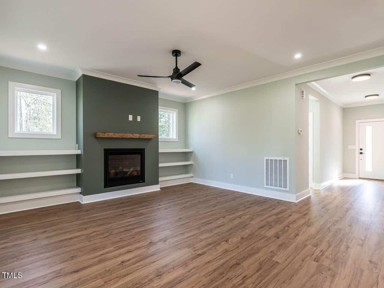 Step into this classic Mid-Century Modern masterpiece, featuring a sleek, neutral interior and a seamless open floor plan. The spacious great room invites you to relax by the gas fireplace, complete with a floating wood mantel and custom shelving on both sides. From here, step out onto the expansive covered back porch, perfect for entertaining or quiet evenings.