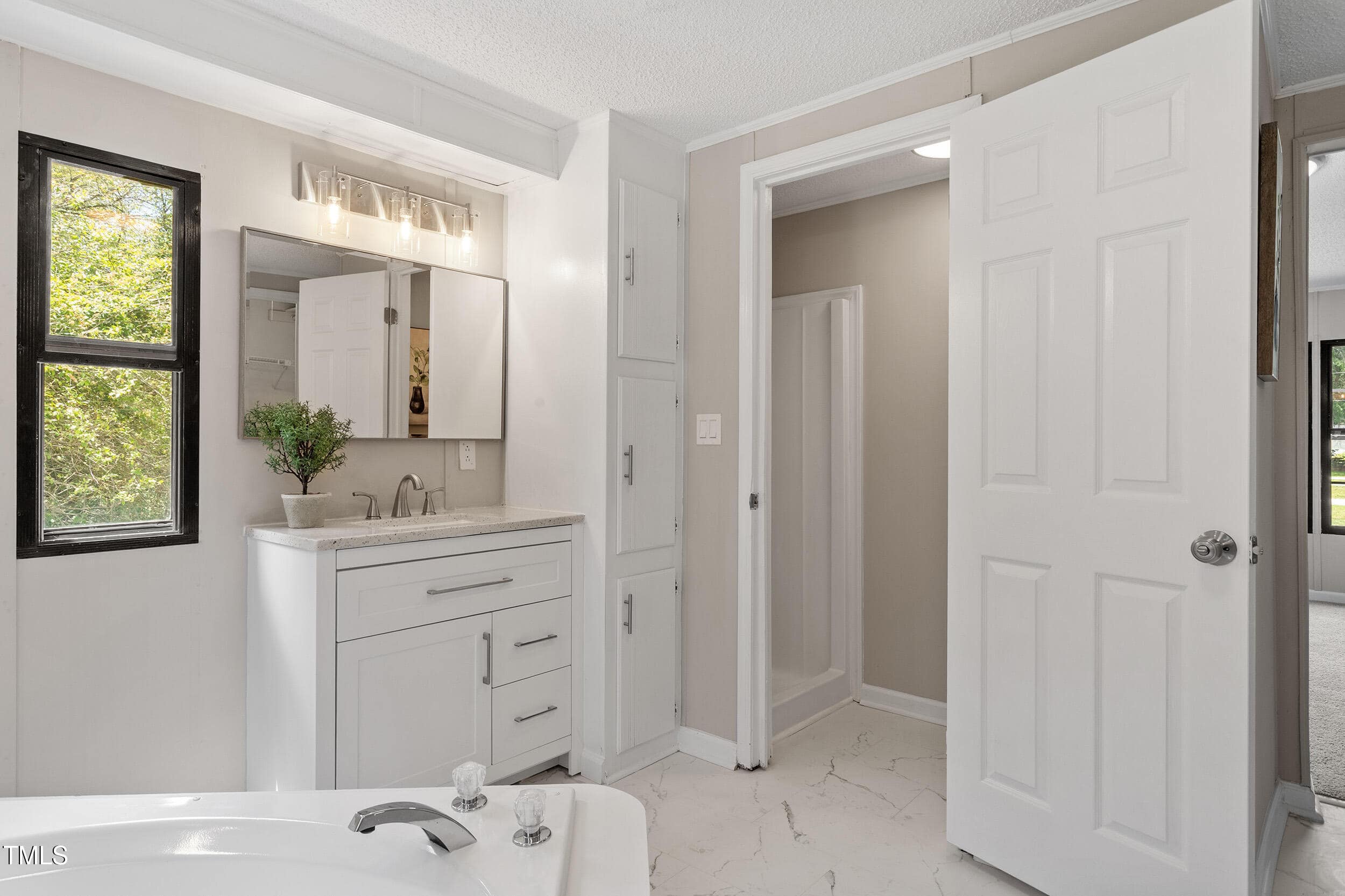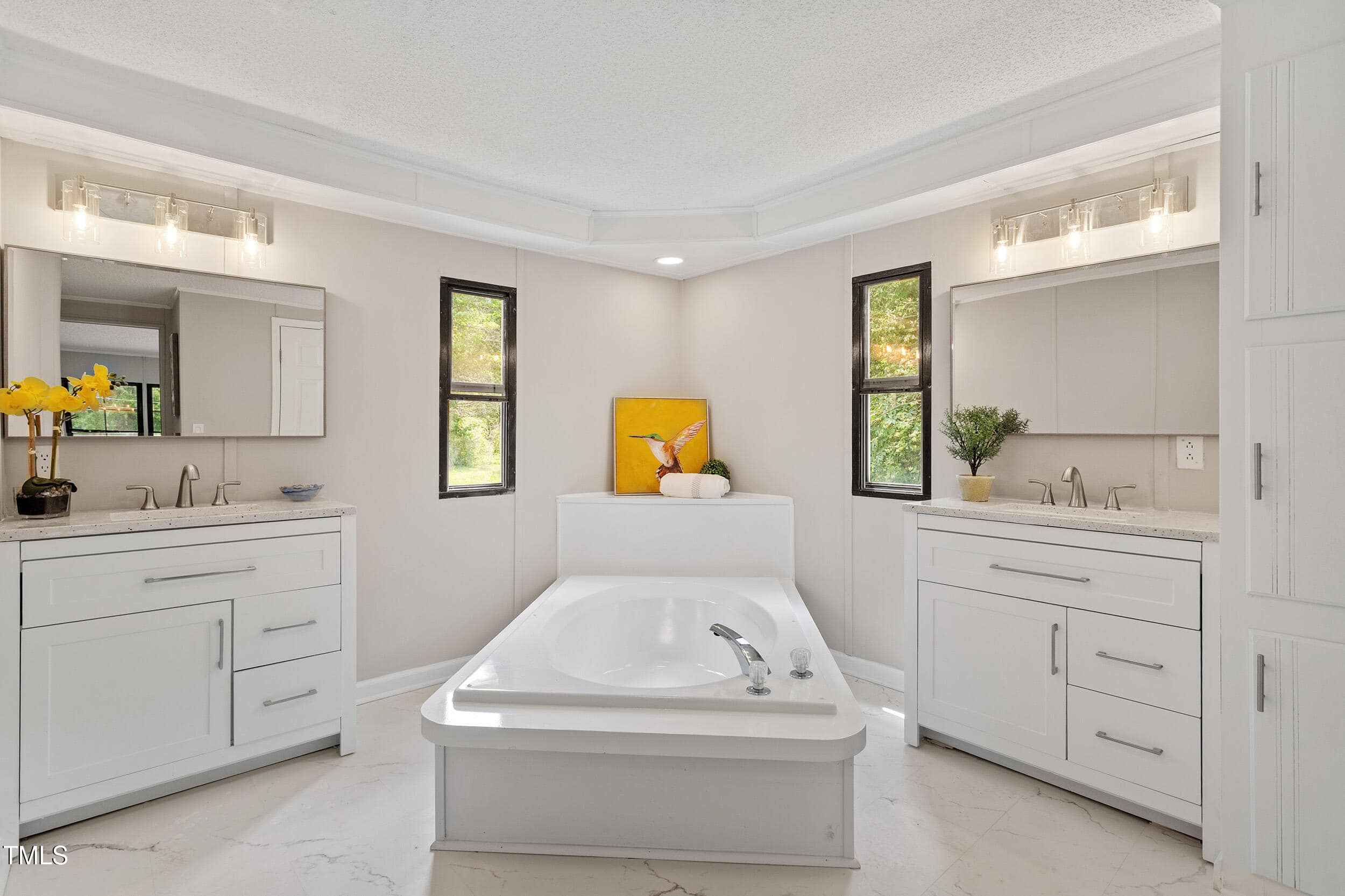 Wide plank hardwood like flooring in main living areas; new interior paint and PLUSH carpet. Stunning Primary Suite with dual vanity, HUGE WIC, soaking tub and walk-in shower.