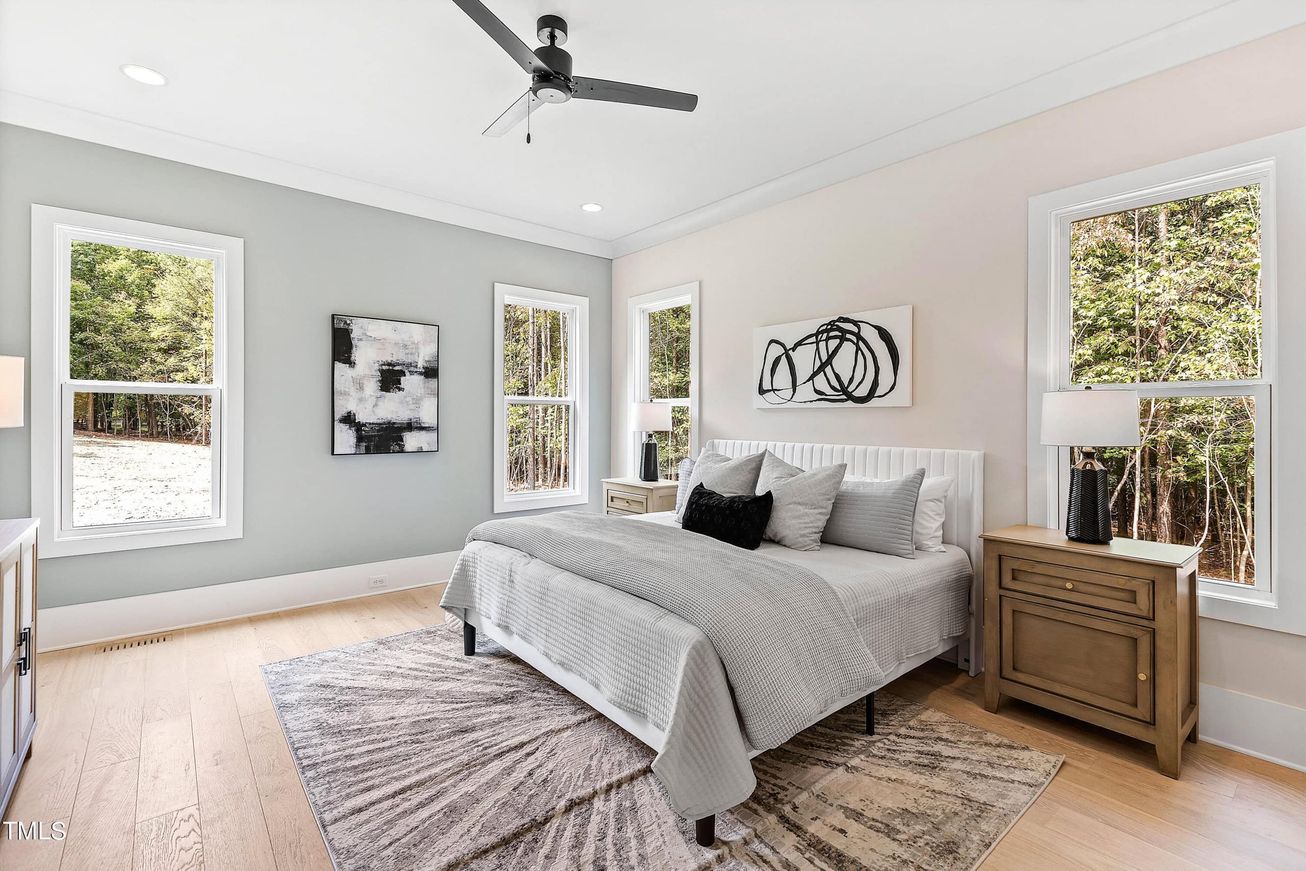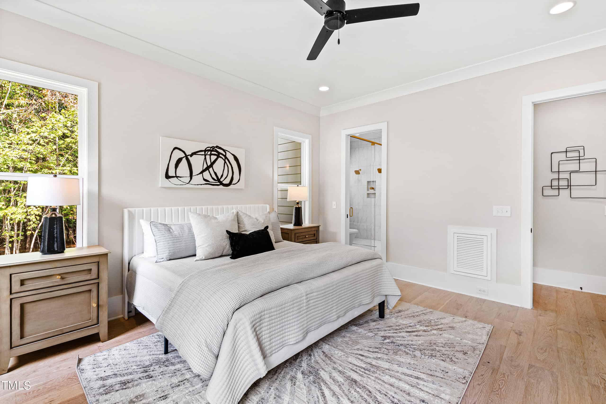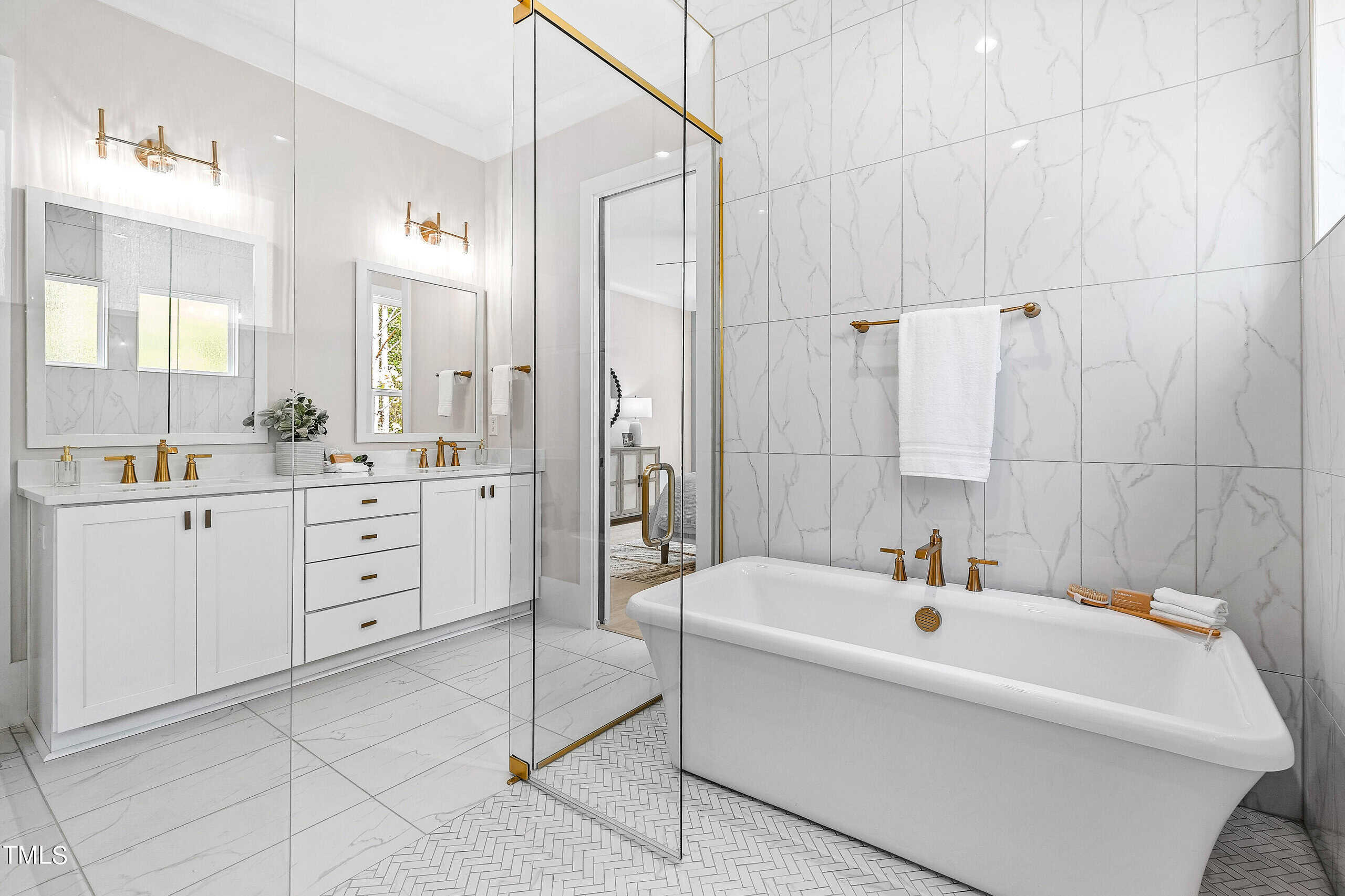 1st Flr Primary Suite: Accent Wall & Ceiling Fan! Zero Entry Wet Room w/Huge Windows, Spa Style Shwr & Freestanding Tub! Cstm Painted Dual Vanity w/Dsgnr Sconce Lighting! WIC w/Custom Sheving!