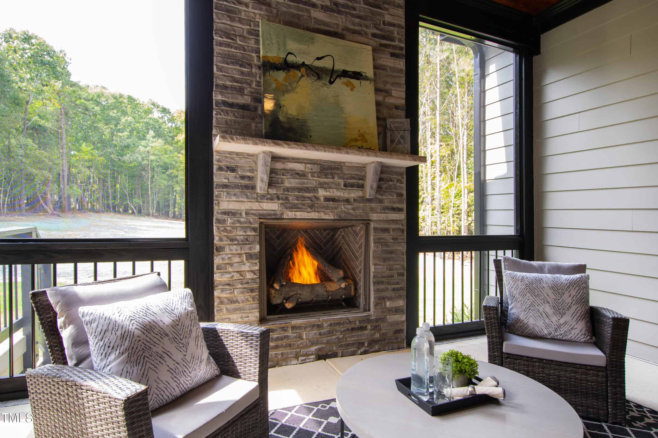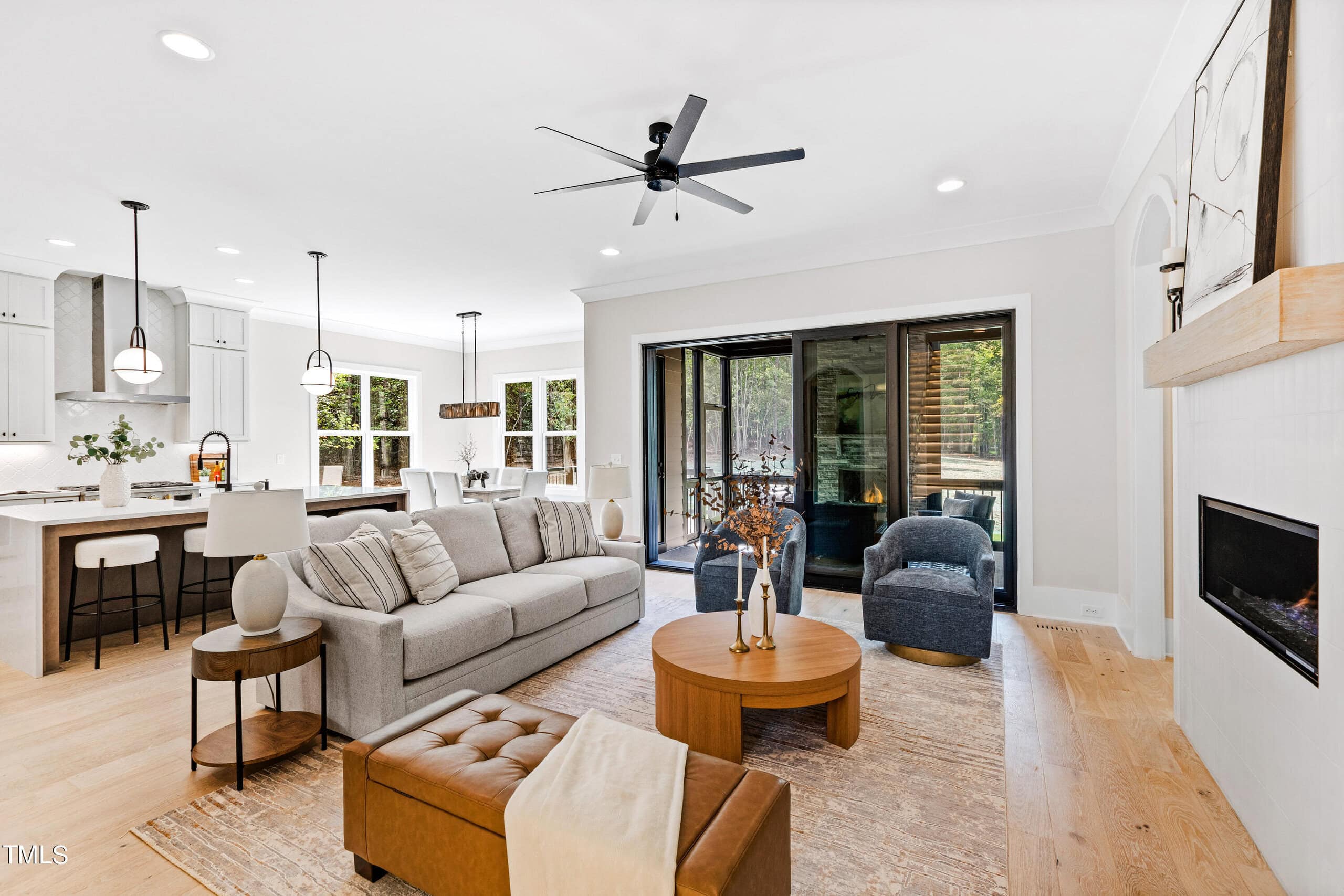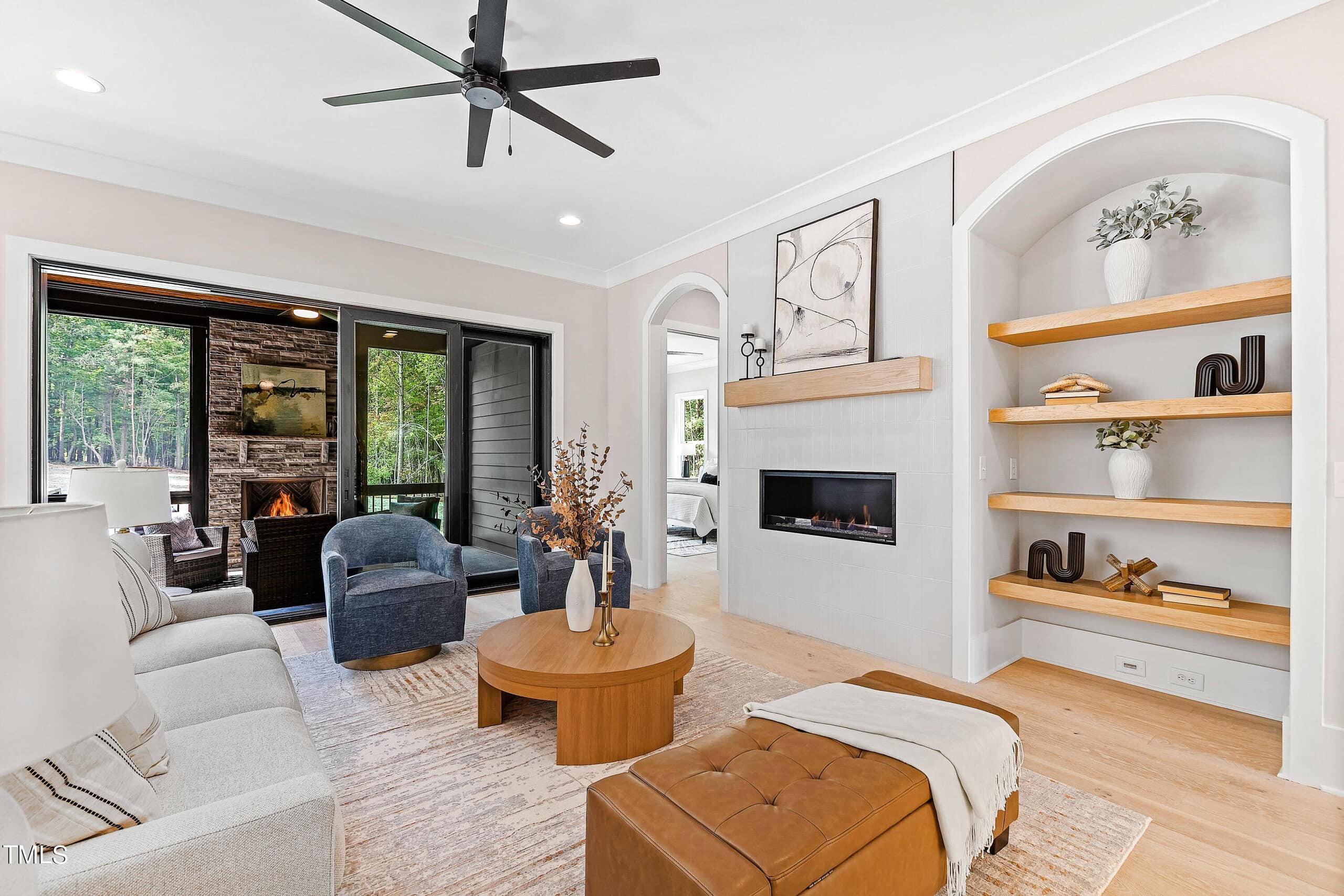 Fam Rm: Built ins w/Floating Shelves Surrounding 42” Linear Fireplace w/Site Built Poplar Mantle! 12′ Slider to Scrnd Porch w/Stone Fireplace & BBQ Deck!