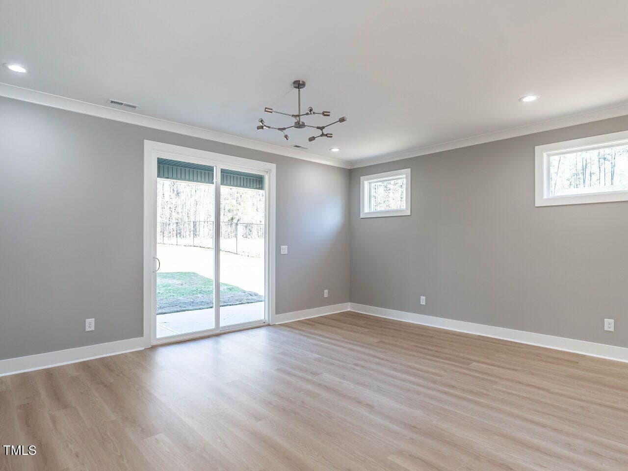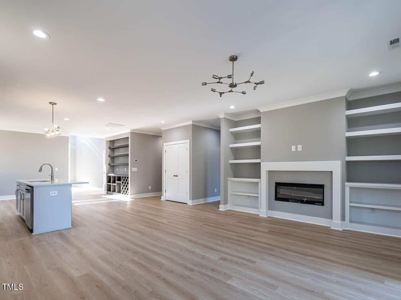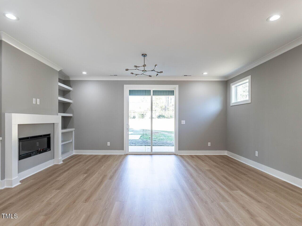The family room continues the theme of sophistication with custom trim framing a sleek linear fireplace. Step outside to the spacious covered porch, where you can unwind and take in breathtaking sunsets over the expansive, flat rear yard—ideal for recreation or future landscaping.