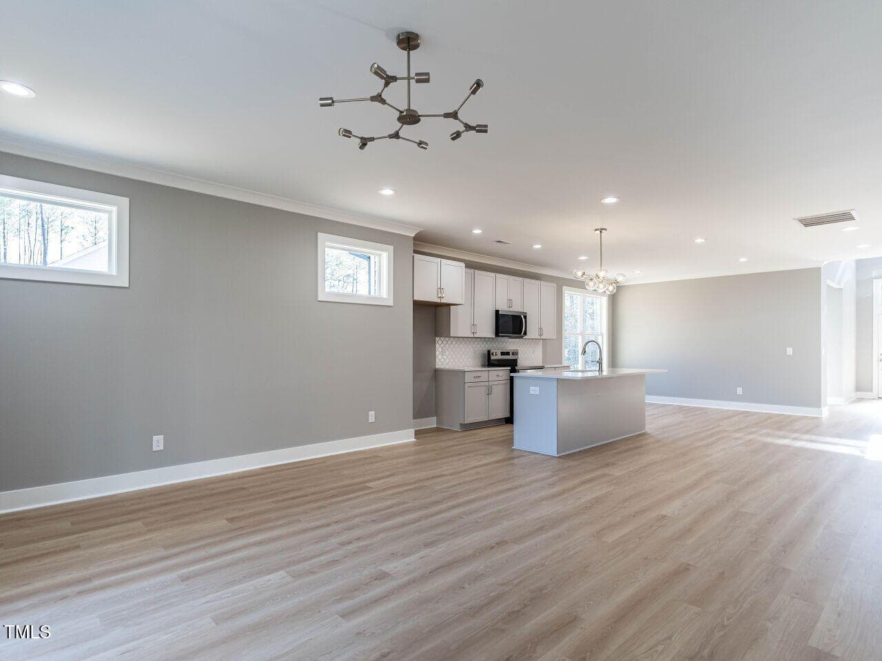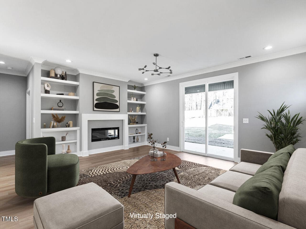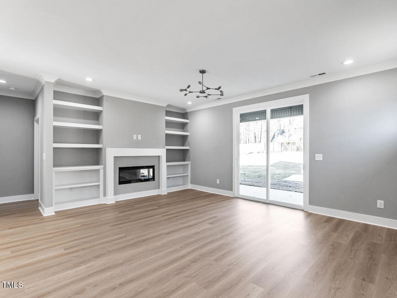 The family room continues the theme of sophistication with custom trim framing a sleek linear fireplace. Step outside to the spacious covered porch, where you can unwind and take in breathtaking sunsets over the expansive, flat rear yard—ideal for recreation or future landscaping.