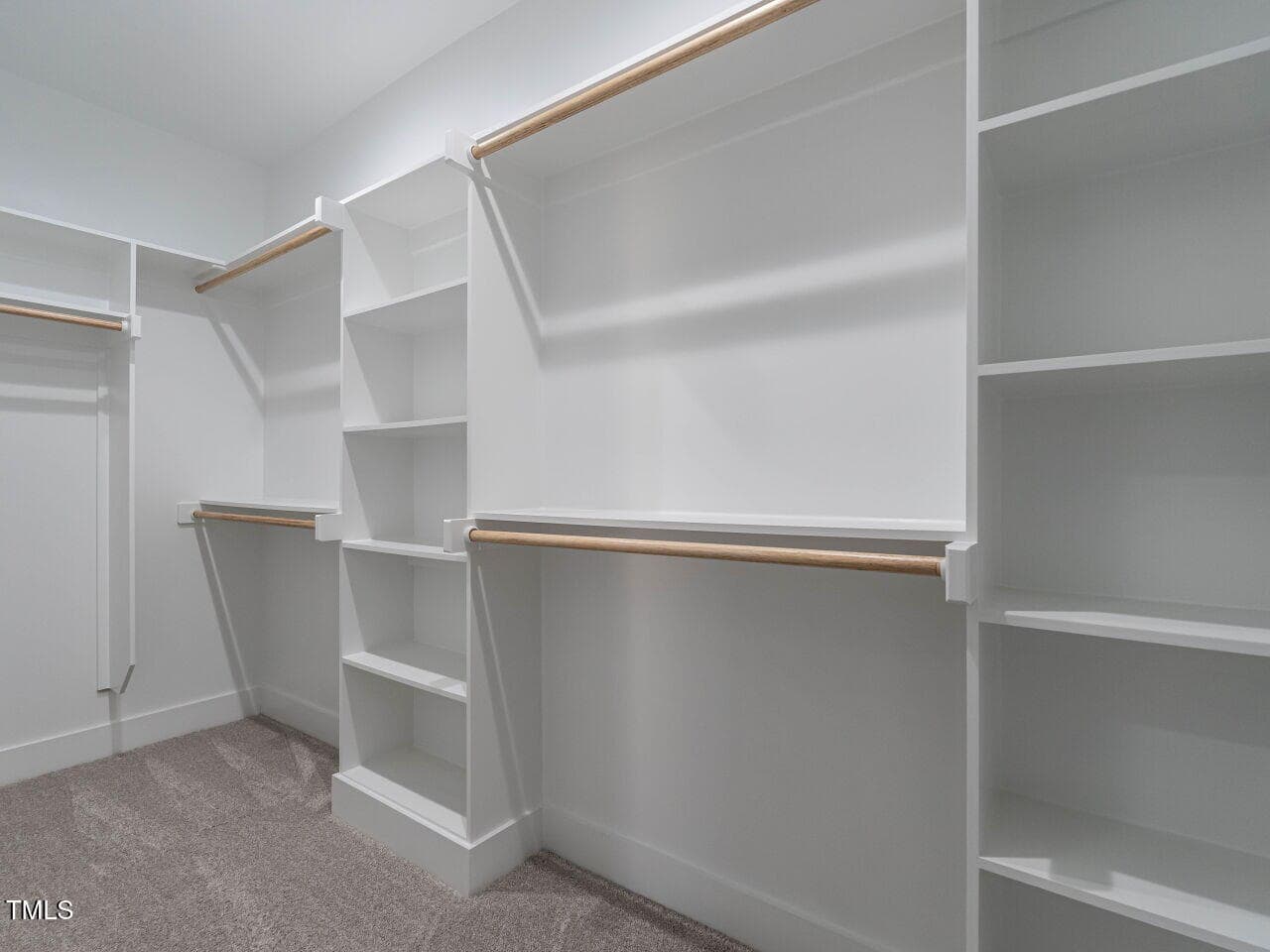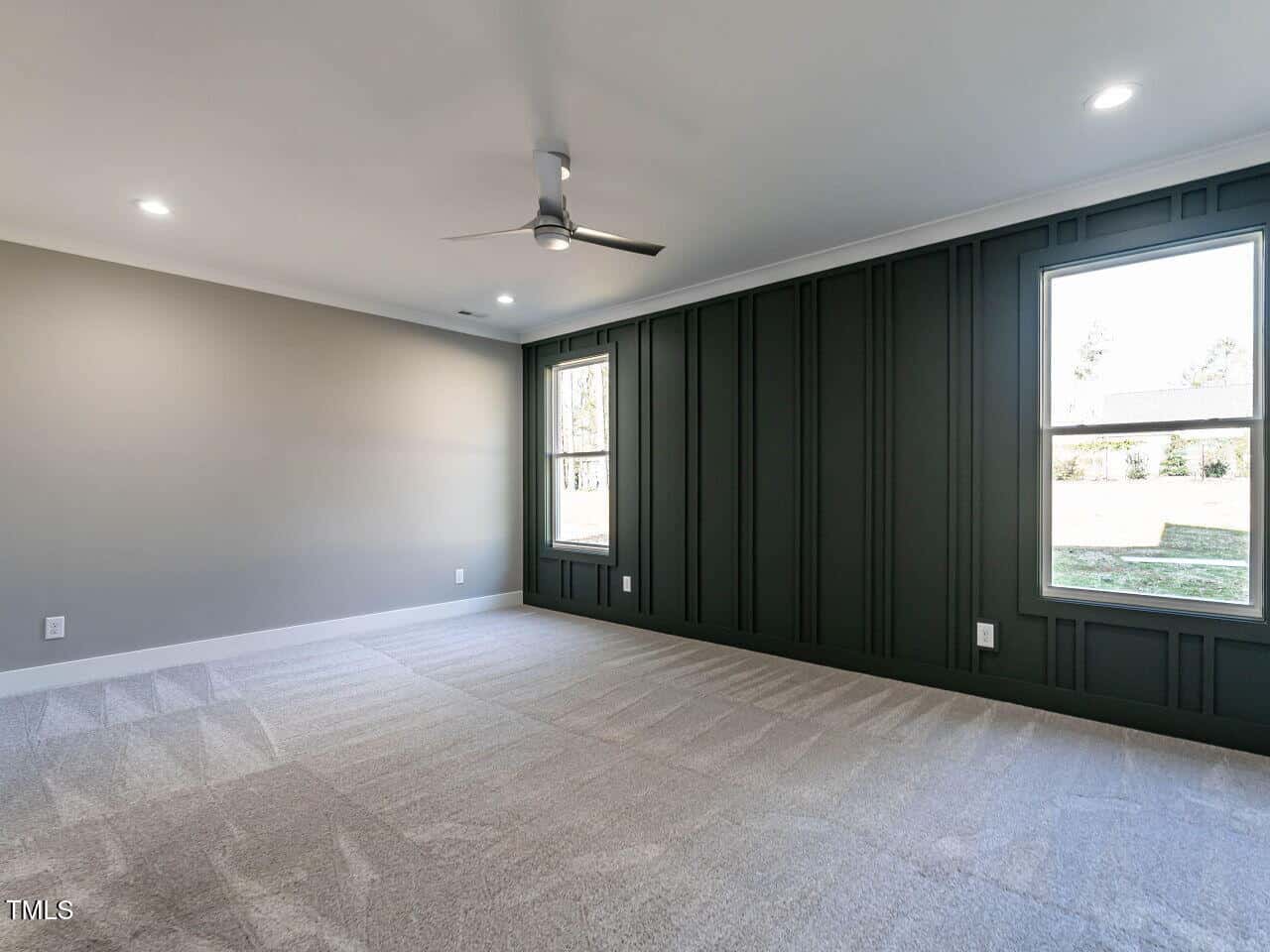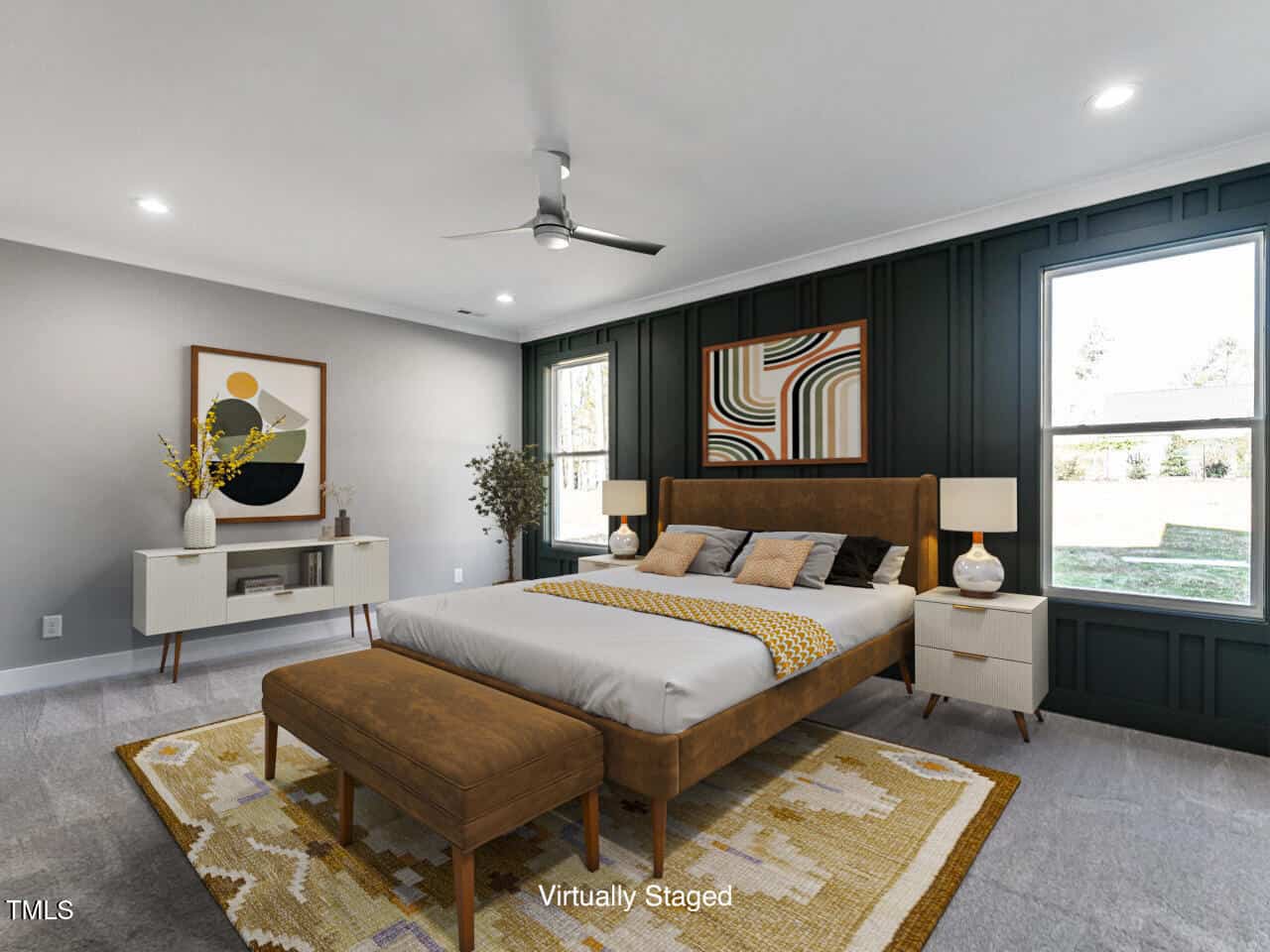 The primary suite offers a tranquil retreat with a bold, dark gray accent wall that adds contrast and depth. The en-suite bath includes double vanities, a luxurious walk-in shower, and a custom-designed closet providing ample storage. Each secondary bedroom also features custom-built closets, combining style with functionality.
