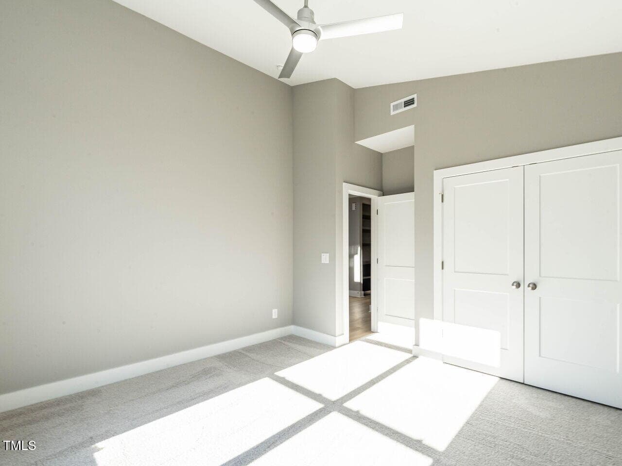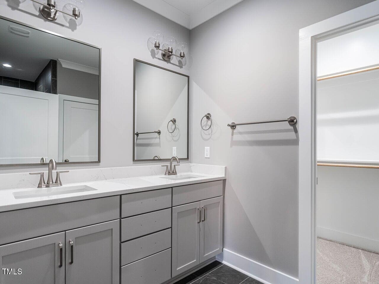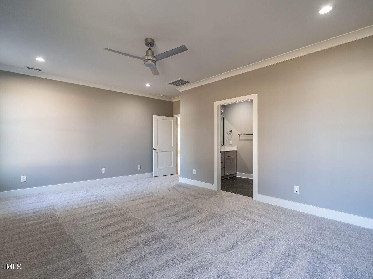 The primary suite offers a tranquil retreat with a bold, dark gray accent wall that adds contrast and depth. The en-suite bath includes double vanities, a luxurious walk-in shower, and a custom-designed closet providing ample storage. Each secondary bedroom also features custom-built closets, combining style with functionality.