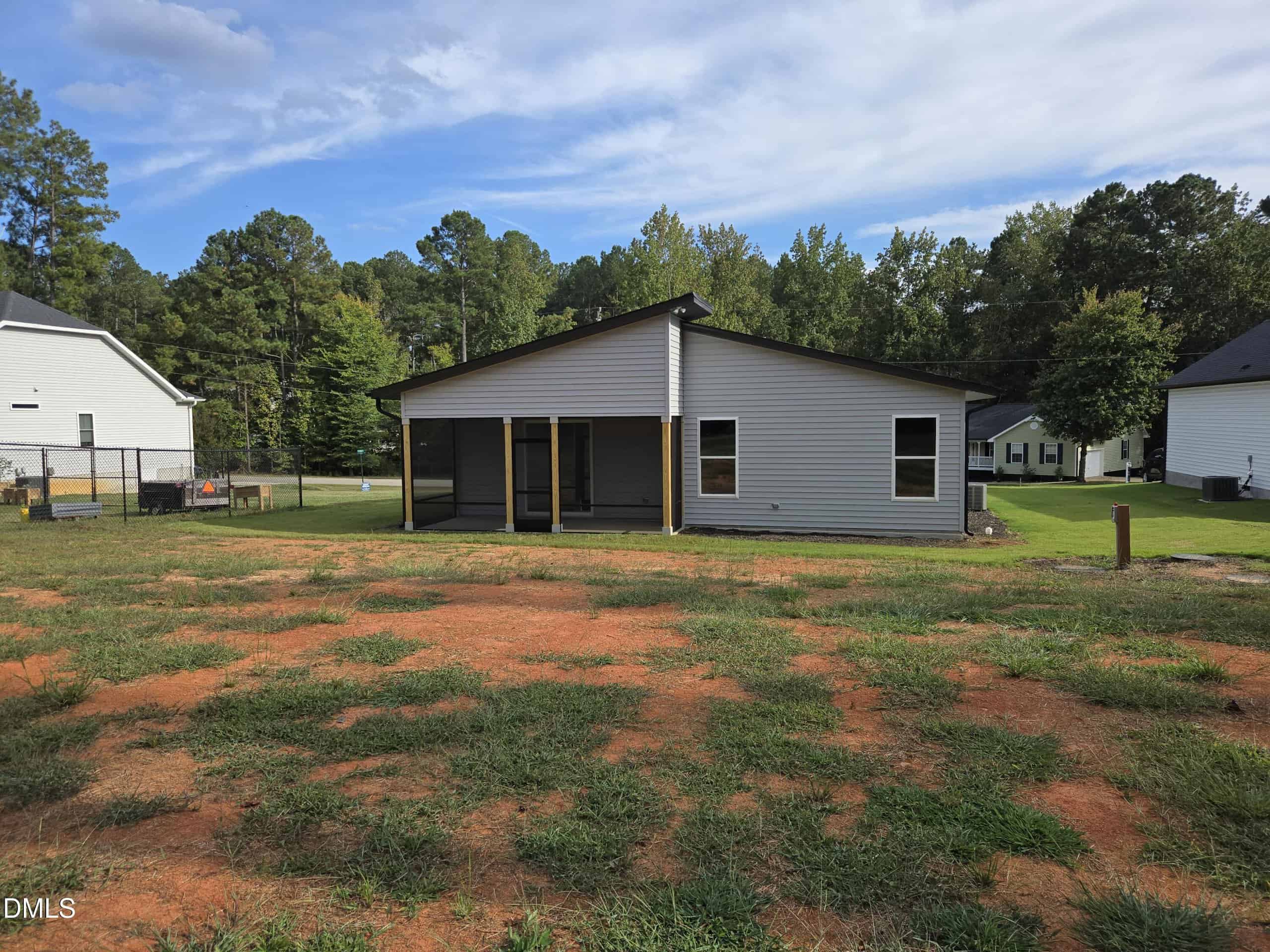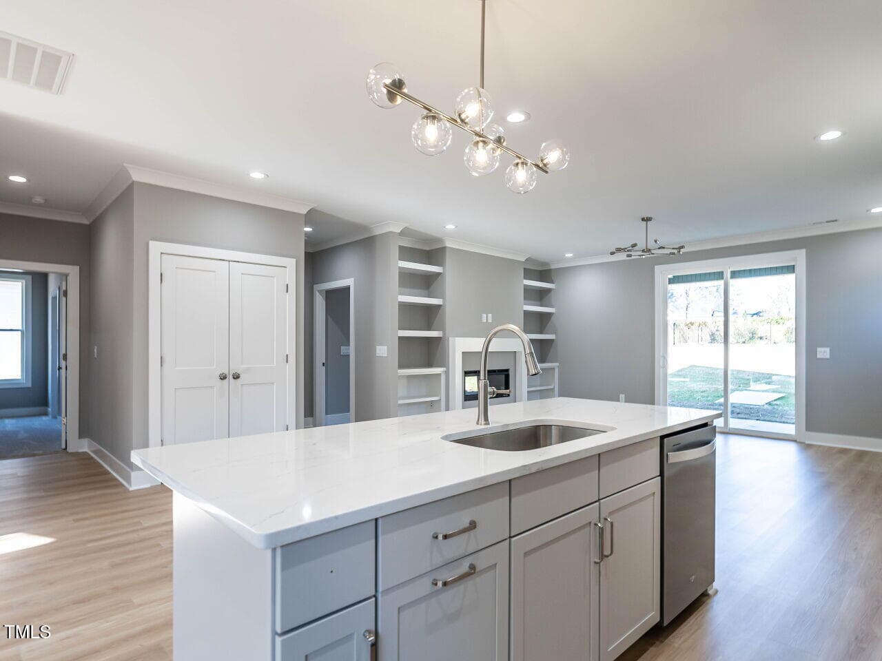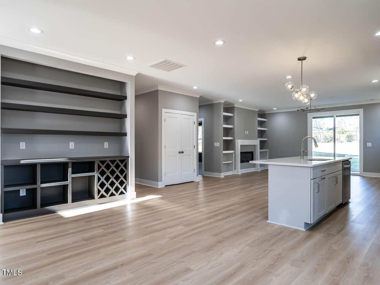 With a quick close – Builder offering $1,000 in buyer closing costs. Step into this stunning open-concept home, where thoughtful design meets modern elegance. The soaring ceilings and expansive windows in the foyer flood the space with natural light, setting the tone for the rest of the house. The heart of the home, the kitchen, boasts a center island with seating for four, perfect for casual meals or entertaining. Large floor to ceiling pantry cabinets being added to the kitchen, will be installed soon. Adjacent, the dining area features a striking accent wall with custom trim work and shelving, creating a unique and inviting atmosphere. The family room continues the theme of sophistication with custom trim framing a sleek linear fireplace. Step outside to the spacious covered porch, where you can unwind and take in breathtaking sunsets over the expansive, flat rear yard—ideal for recreation or future landscaping. The primary suite offers a tranquil retreat with a bold, dark gray accent wall that adds contrast and depth. The en-suite bath includes double vanities, a luxurious walk-in shower, and a custom-designed closet providing ample storage. Each secondary bedroom also features custom-built closets, combining style with functionality. This home includes a finished and painted two-car garage and is backed by a 10-year Limited Home Warranty for added peace of mind. Experience the perfect blend of style, comfort, and craftsmanship in this extraordinary Lilium Homes creation. Beautiful Mid-Century Modern Home by Lilium Homes.