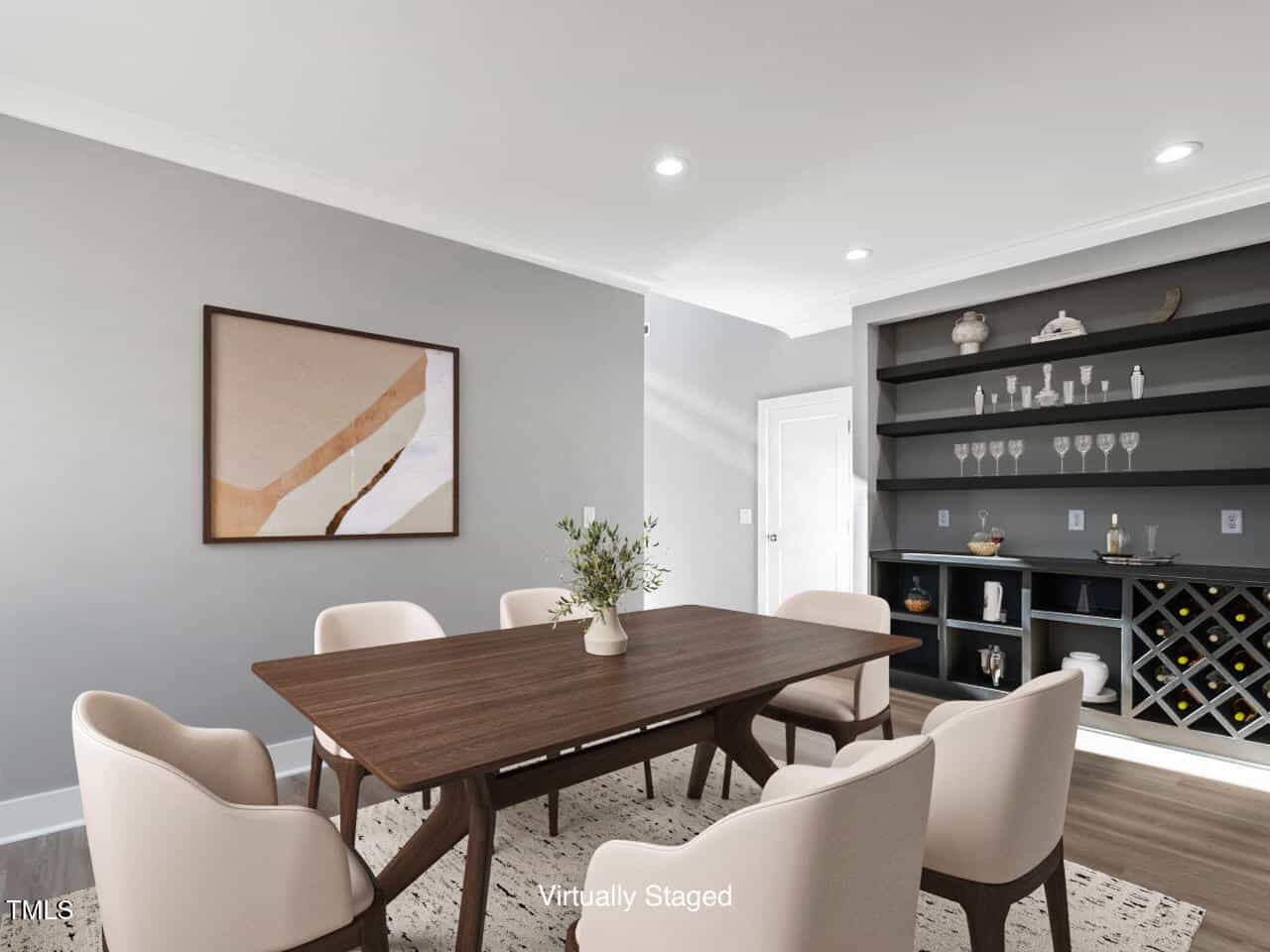 The heart of the home, the kitchen, boasts a center island with seating for four, perfect for casual meals or entertaining. Large floor to ceiling pantry cabinets being added to the kitchen, will be installed soon. Adjacent, the dining area features a striking accent wall with custom trim work and shelving, creating a unique and inviting atmosphere.