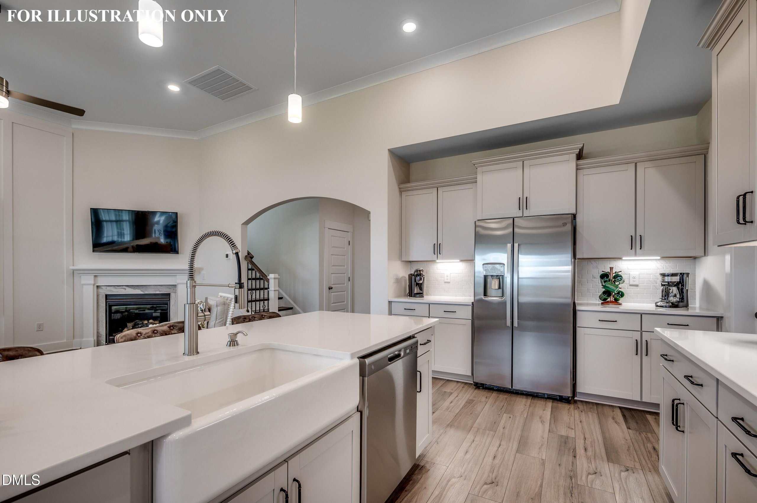 Primary suite and guest suite on the main level! ”Lounge Greige” LVP flooring throughout the downstairs open areas! The kitchen features a 12-foot ceiling, ”bianco calacatta” quartz countertops, a 9-foot center island, gorgeous custom cabinets with soft close feature, tile backsplash, stainless steel appliances including a gas cooktop, built-in oven/microwave combo and crown molding!