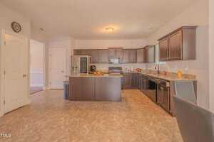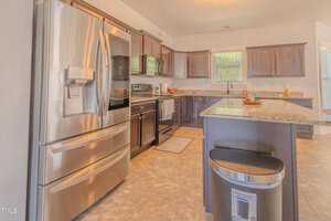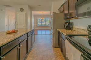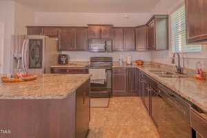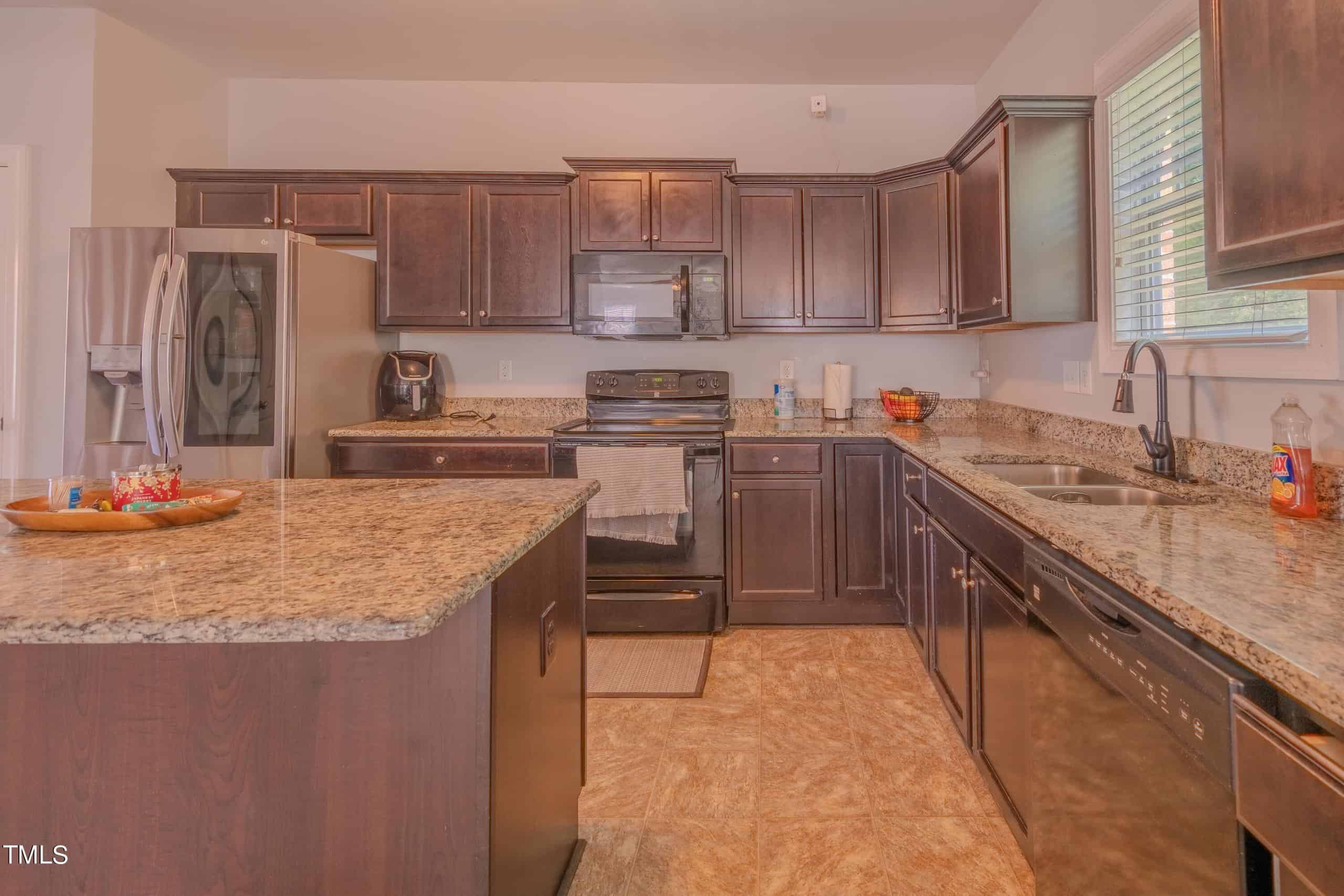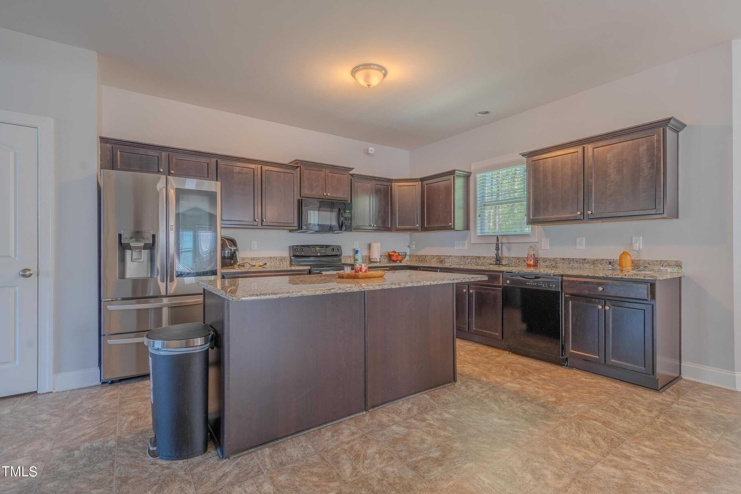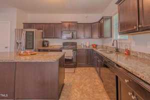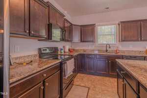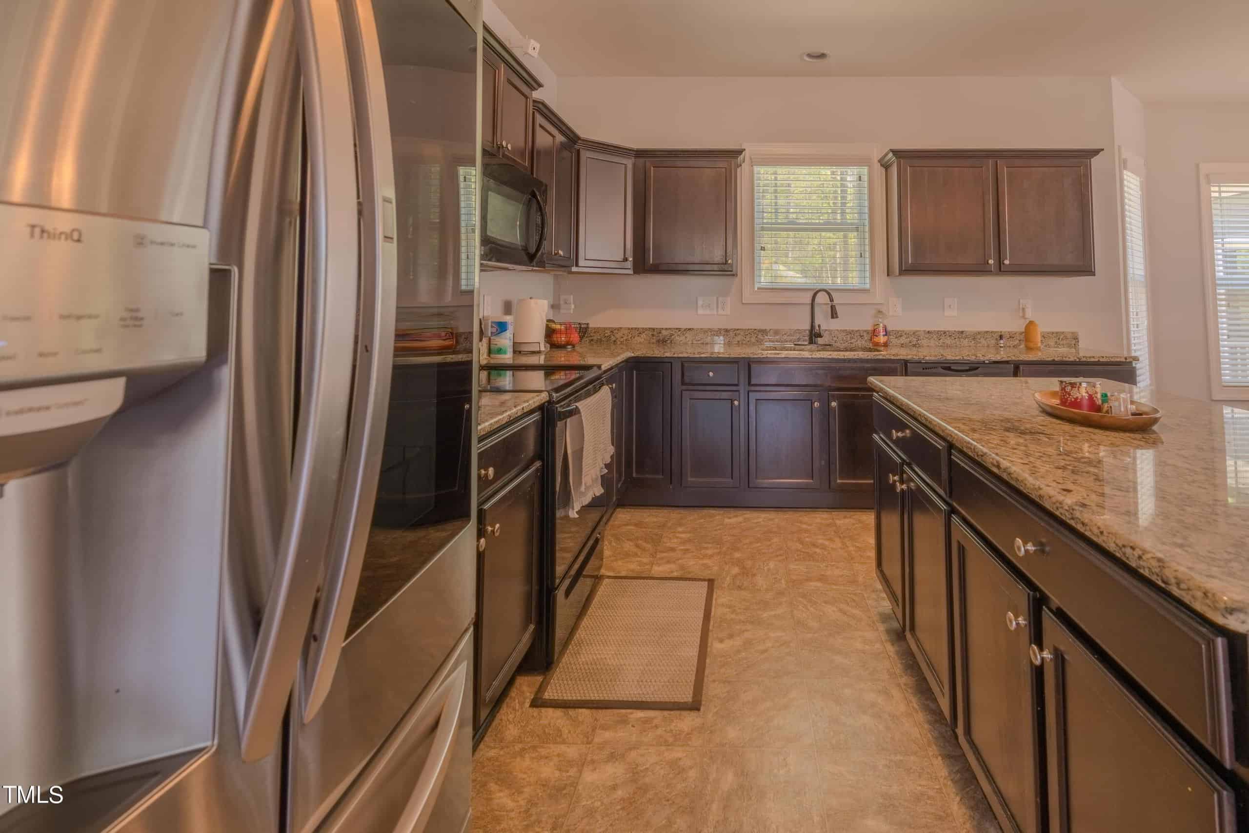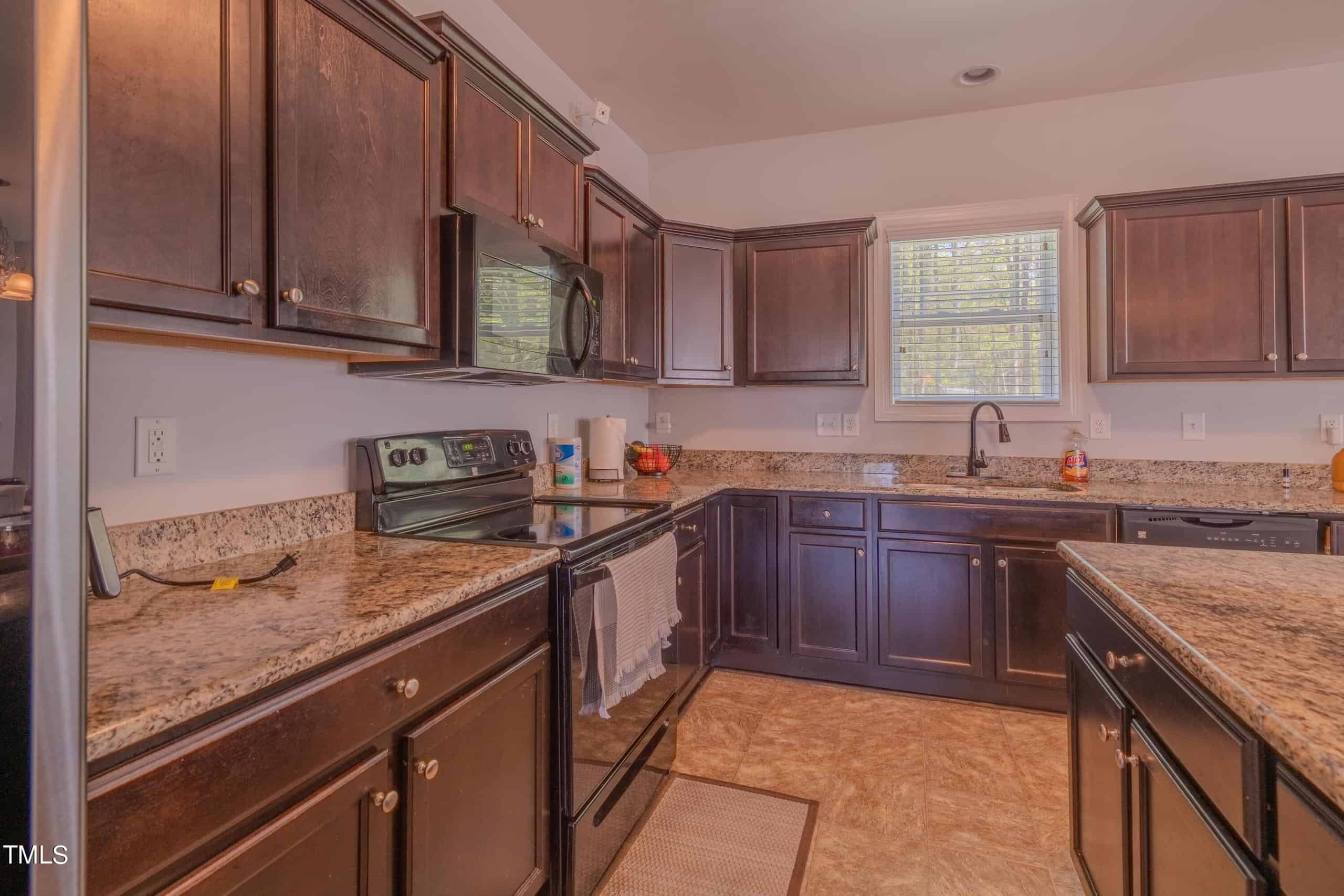 The heart of the home lies in the beautifully appointed kitchen, where rich espresso stained cabinets complement the sleek granite countertops. A center island with barstool seating invites casual conversations, while brushed nickel lighting adds a modern flair.