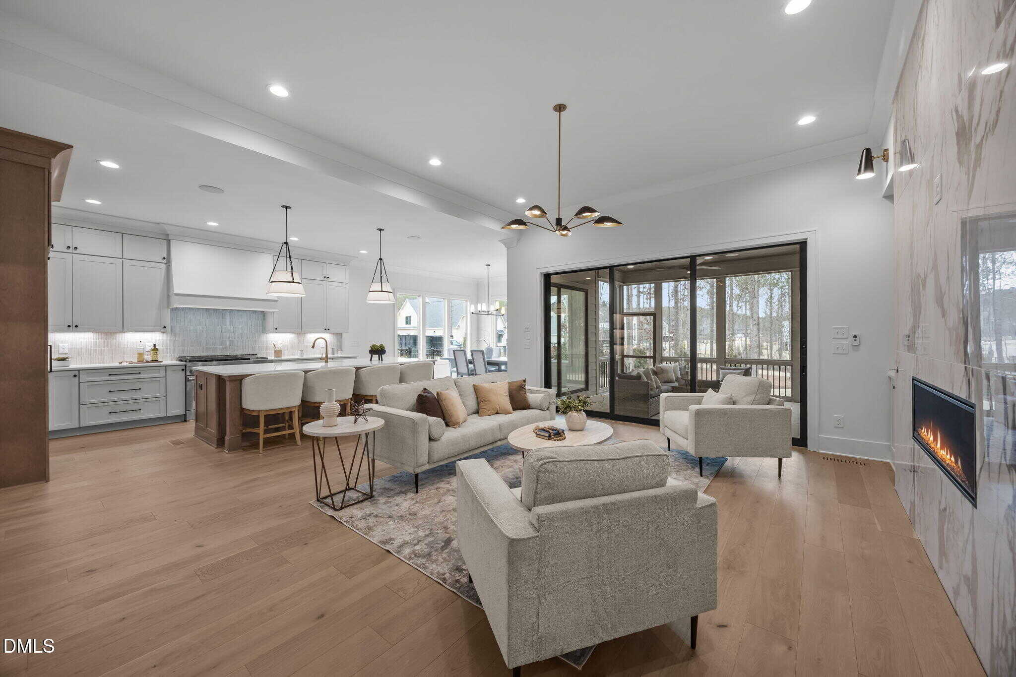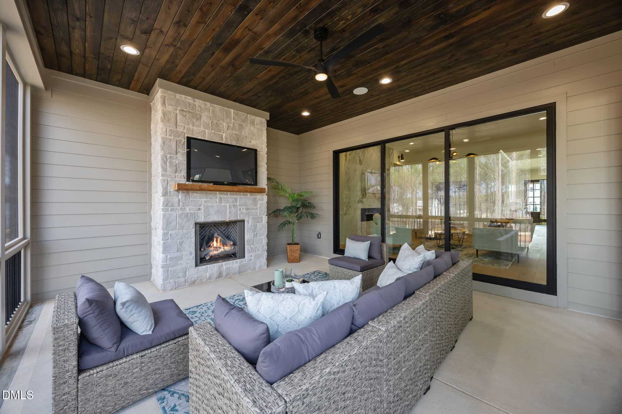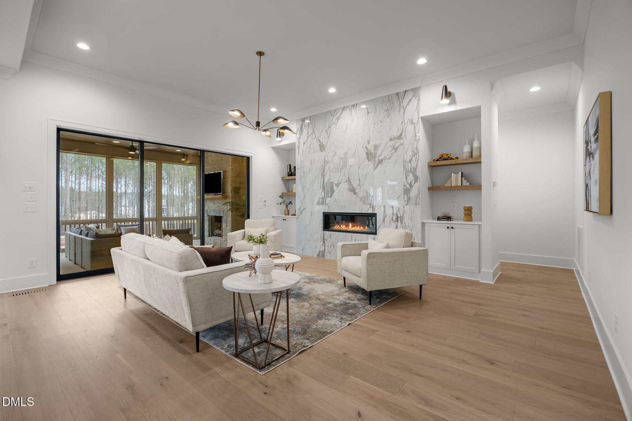 Family room: with clean, modern lines offering a linear fireplace with framed with built-in cabinets and rich stained wood shelves, designer sconces and 12′ glass sliders to the screened porch with speakers with volume control and stone surround fireplace, all overlooking the fully sodded and fenced in backyard!