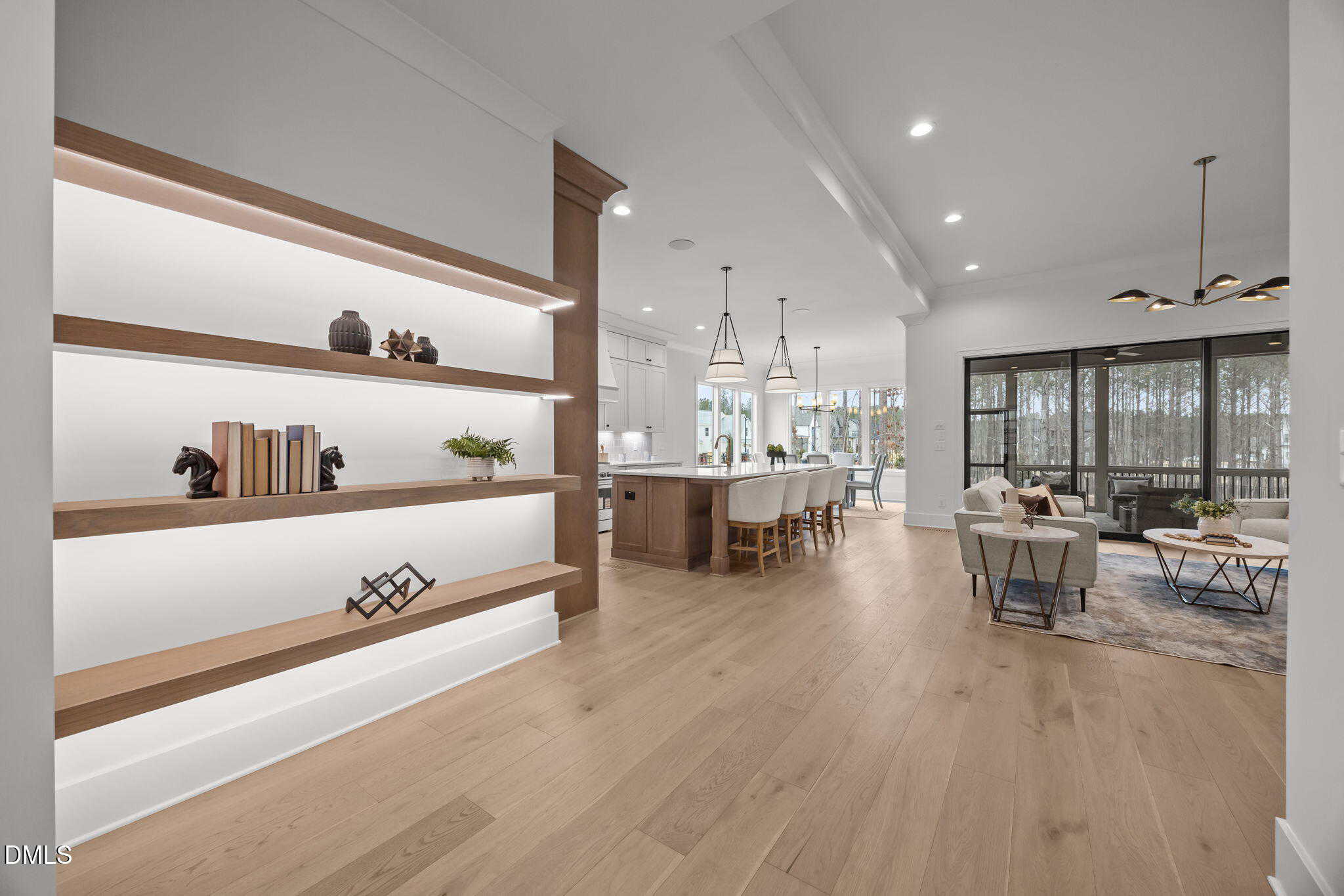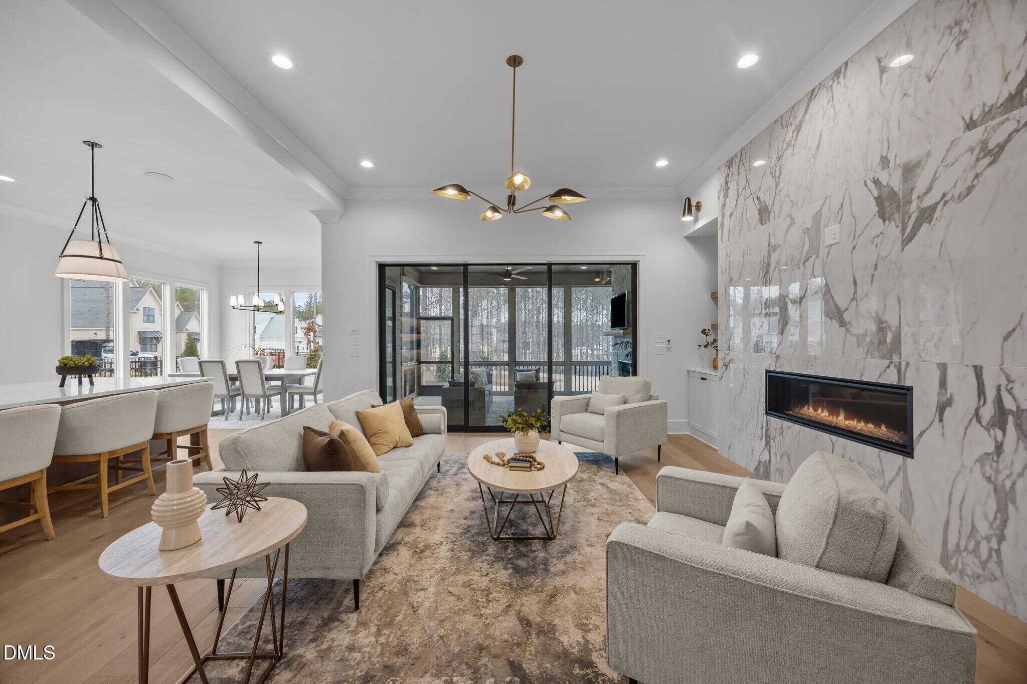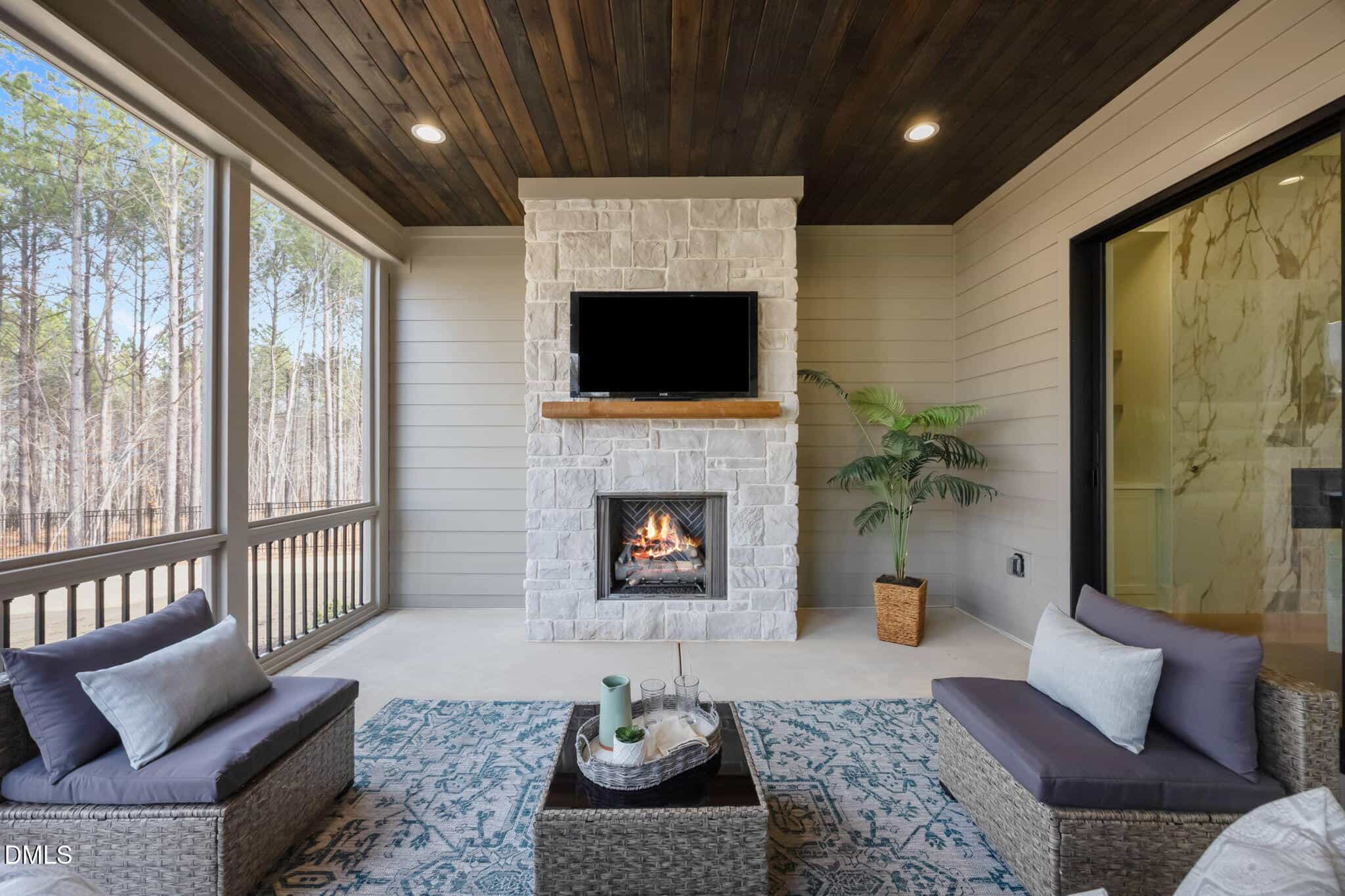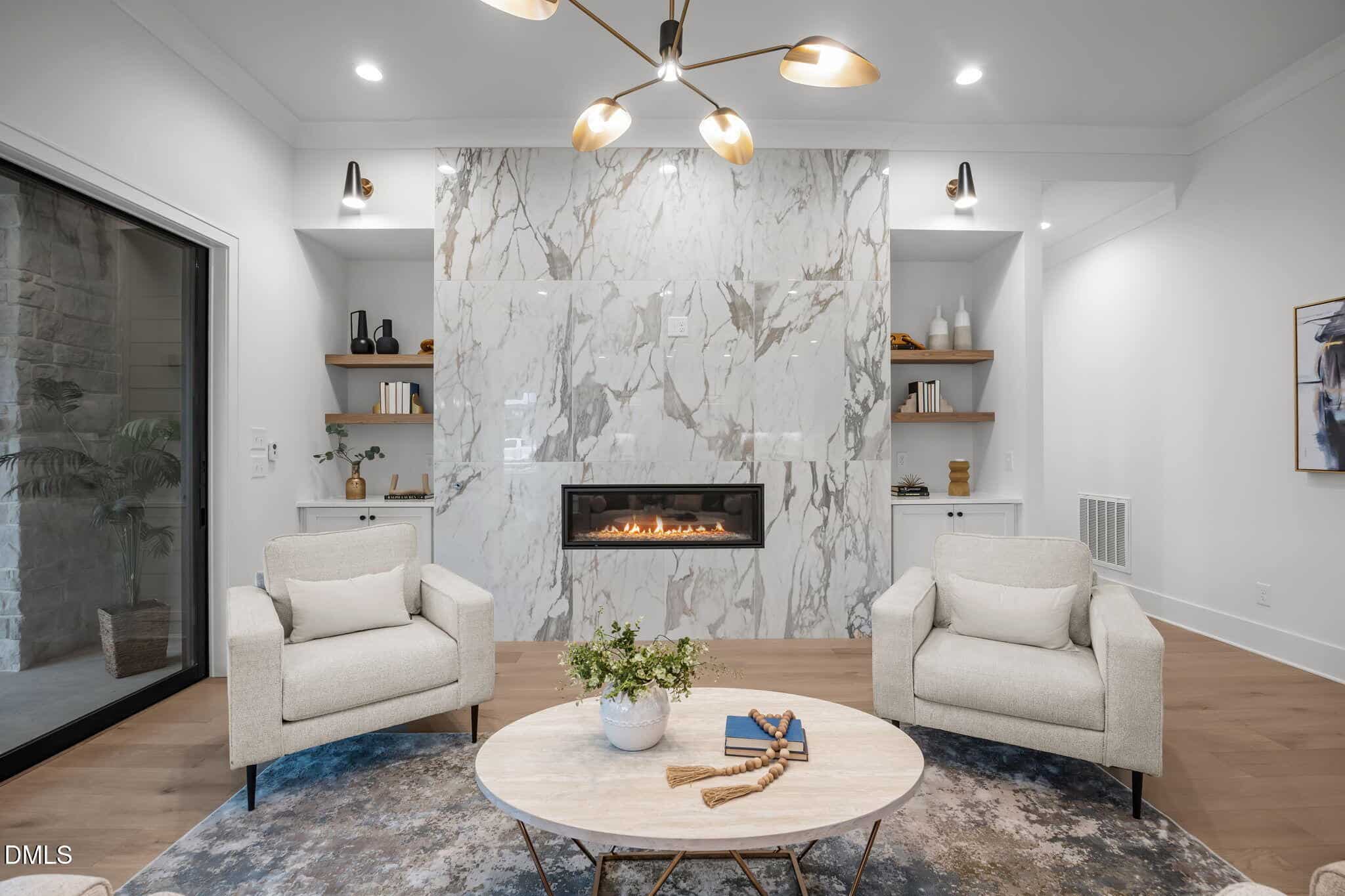 Family room: with clean, modern lines offering a linear fireplace with framed with built-in cabinets and rich stained wood shelves, designer sconces and 12′ glass sliders to the screened porch with speakers with volume control and stone surround fireplace, all overlooking the fully sodded and fenced in backyard!