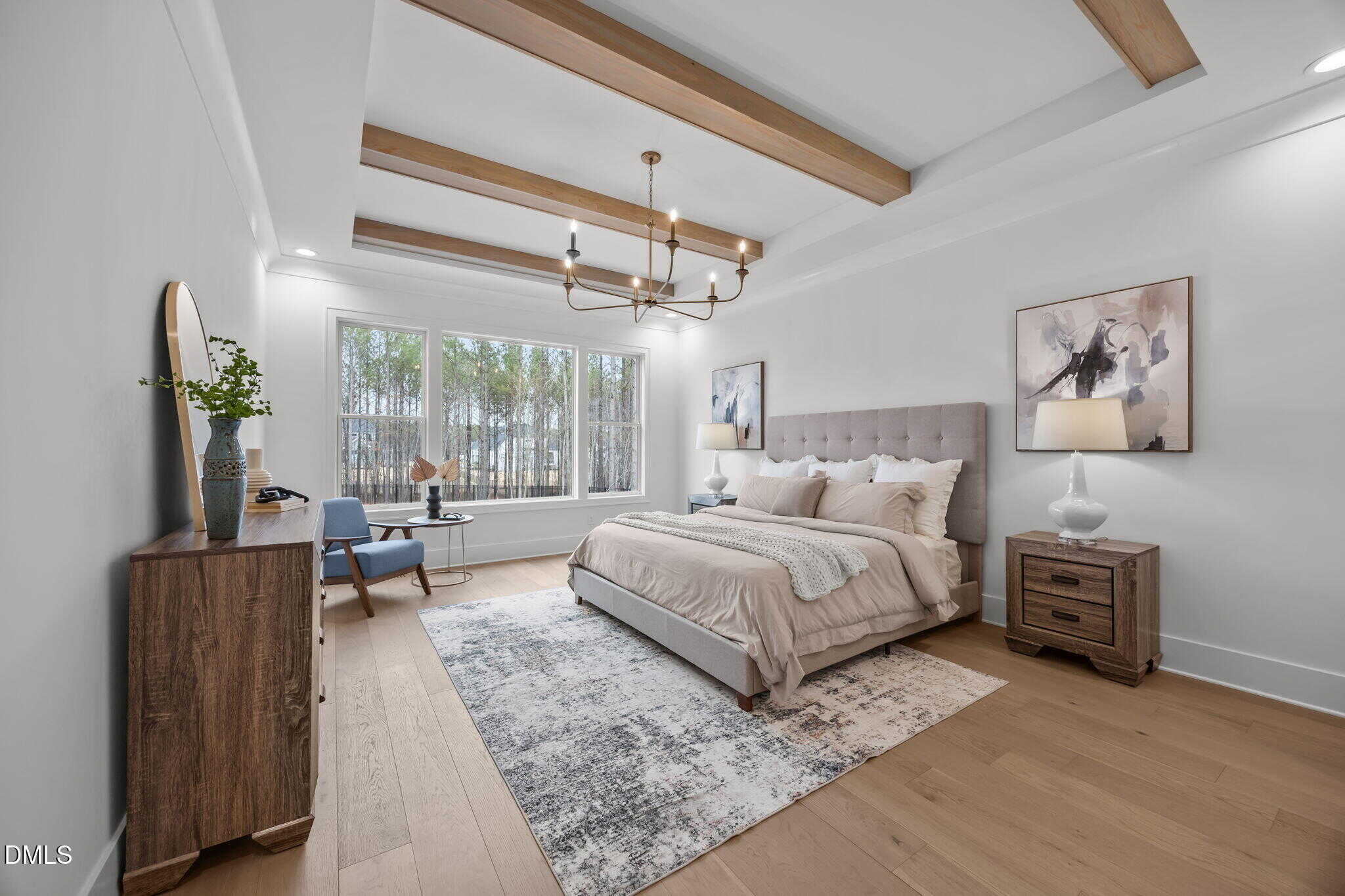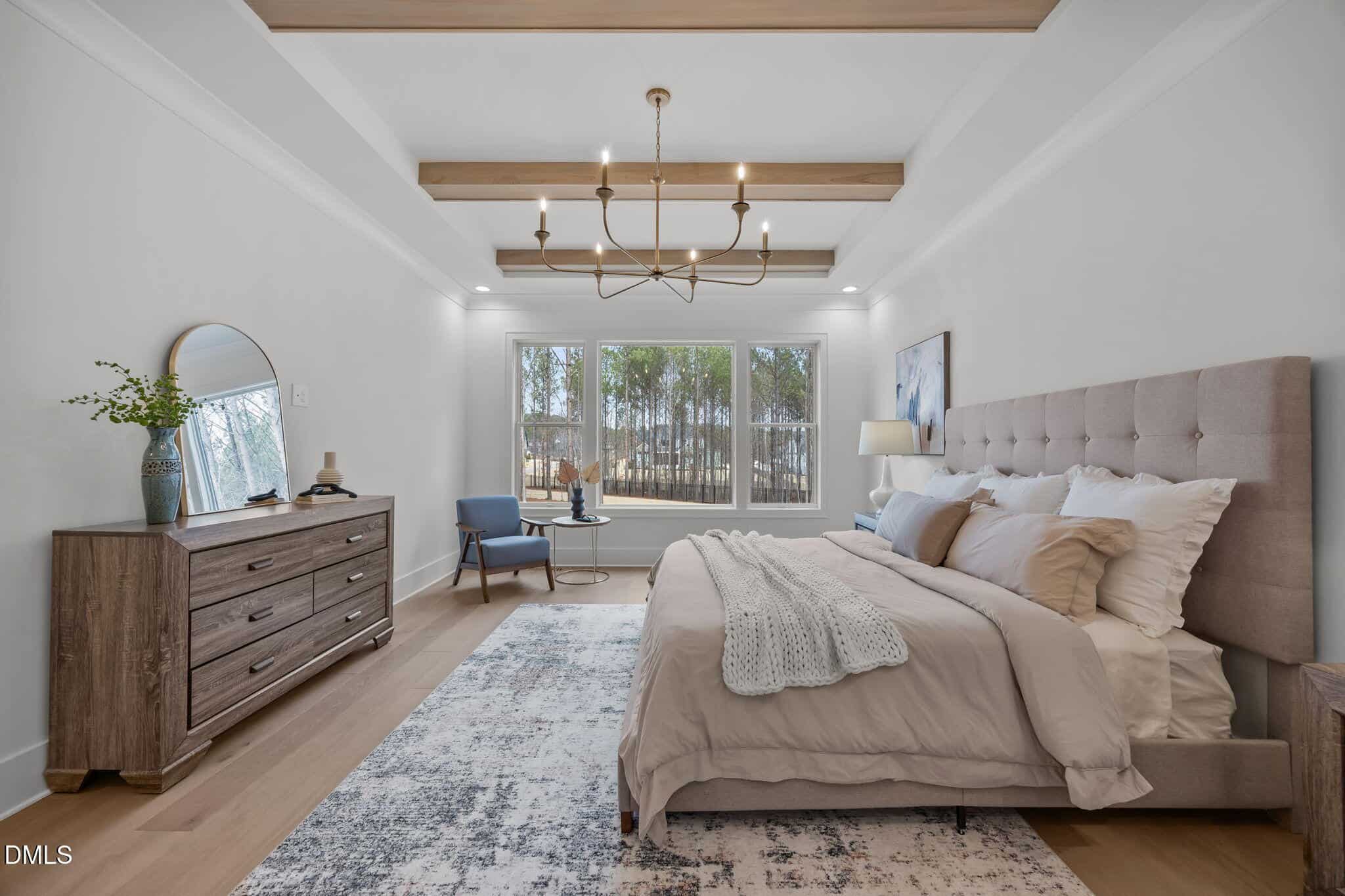 Primary suite: features a tray ceiling with stained beams, designer chandelier and a luxurious en-suite bath with herringbone laid tile flooring, dual vanity with quartz top and hanging pendants, zero entry tile to ceiling surround shower with frameless glass and custom ledge, a freestanding tub and walk in closet with direct access to the laundry room.
