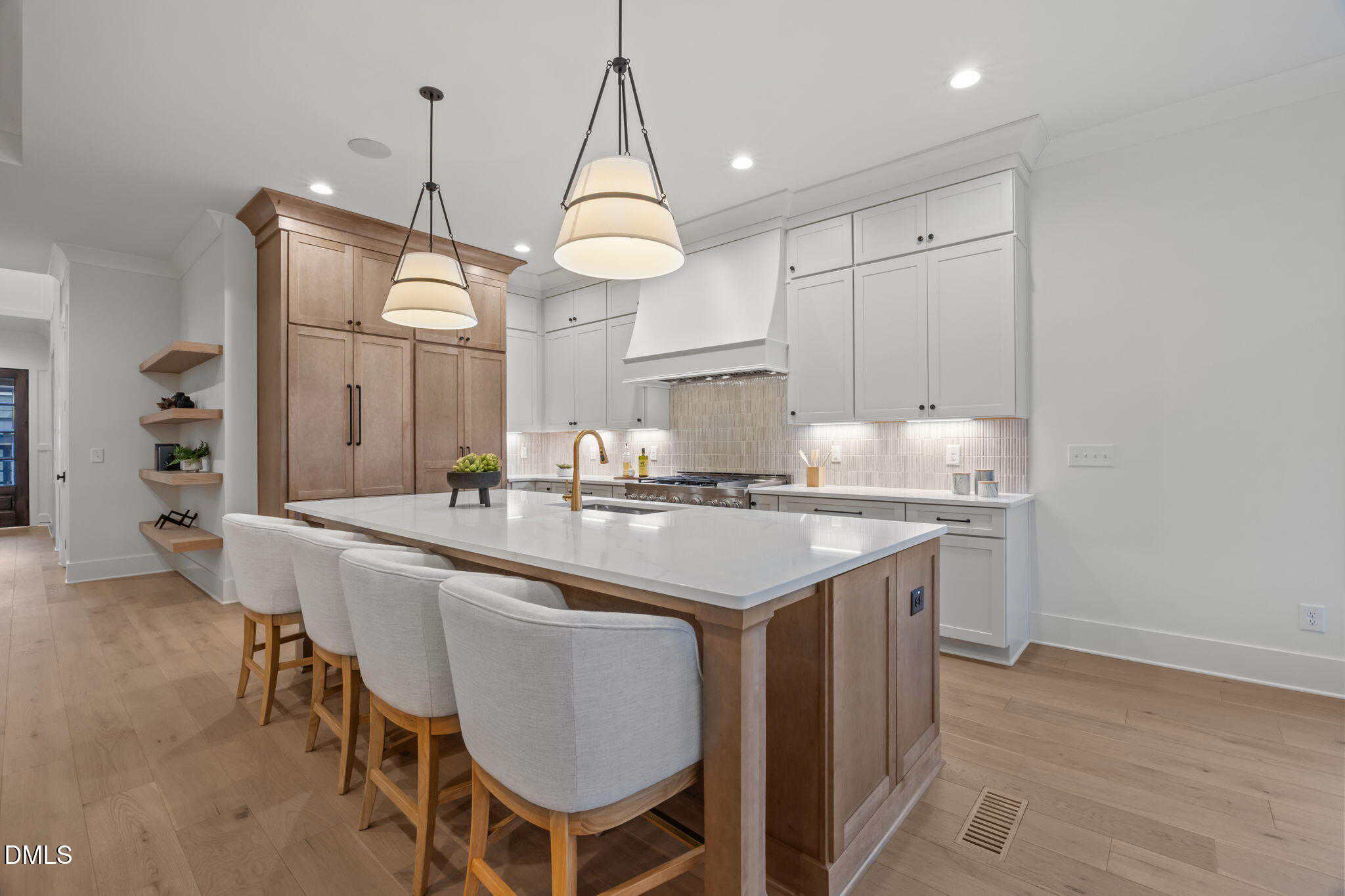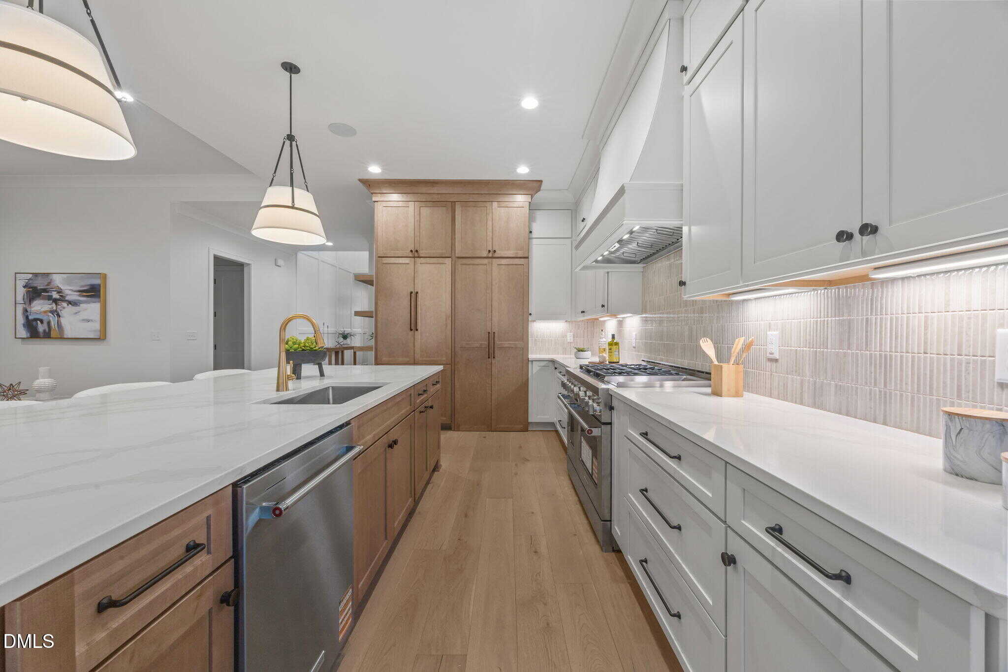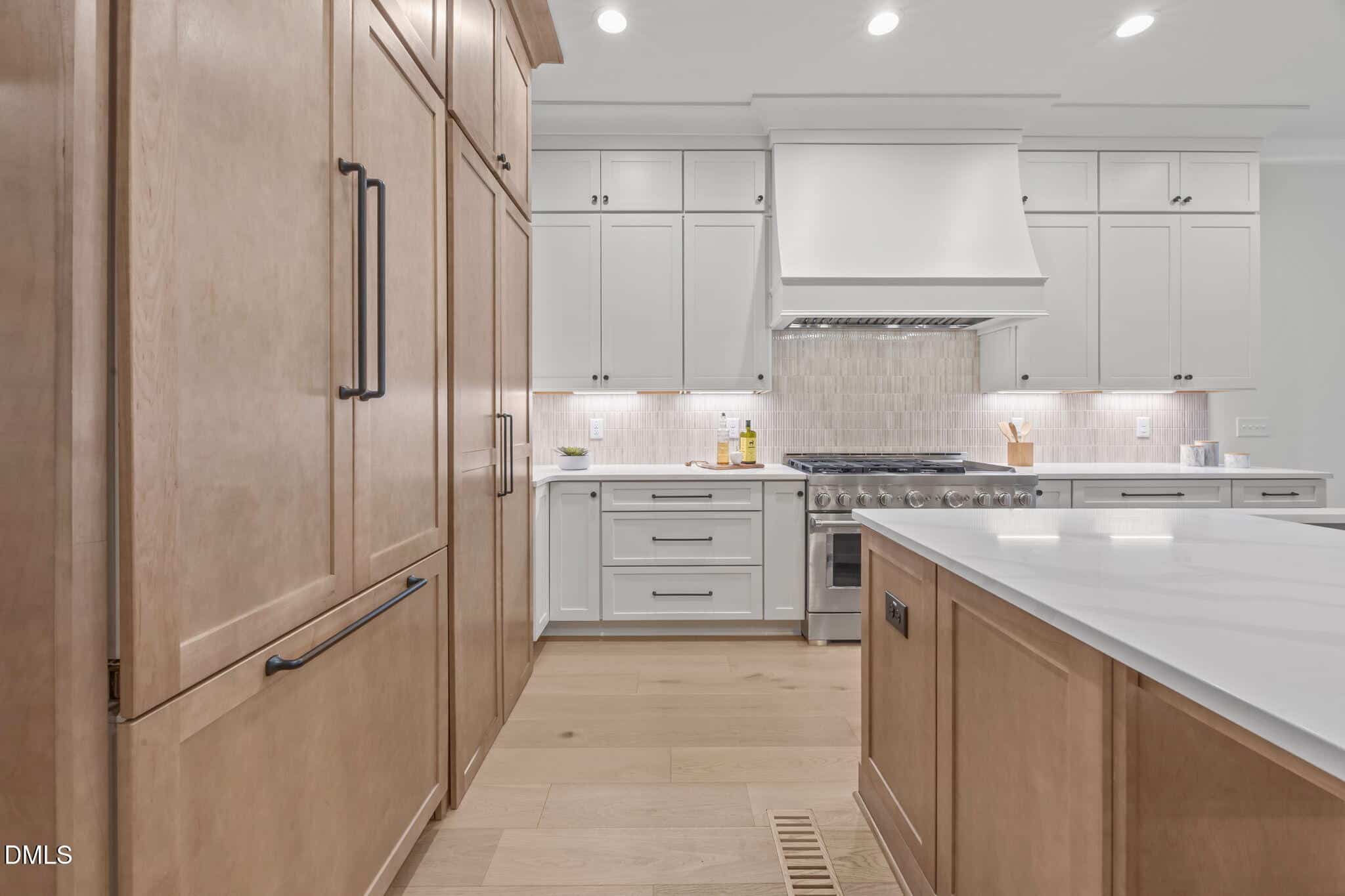 The chef’s kitchen: offers quartz countertops, custom ”bella ivory” painted ceiling-height cabinetry, elegant tile backsplash, ”sahara” stained center island with barstool seating, stainless appliances including 48” professional gas range with dual ovens and cabinet-panel fridge and hidden scullery for designated prep and storage space.