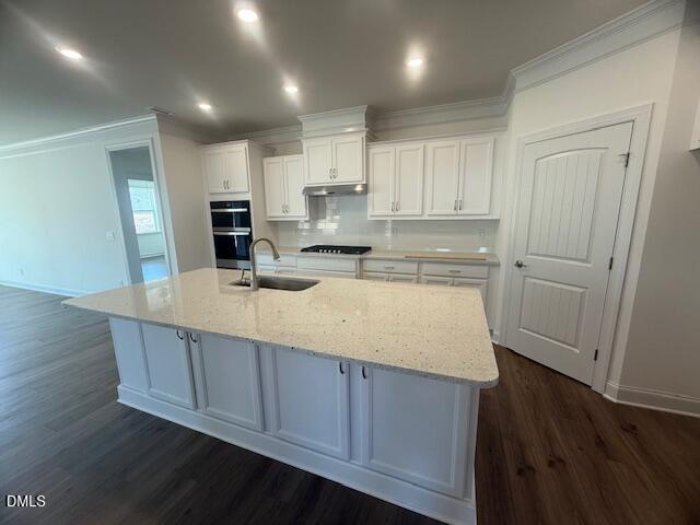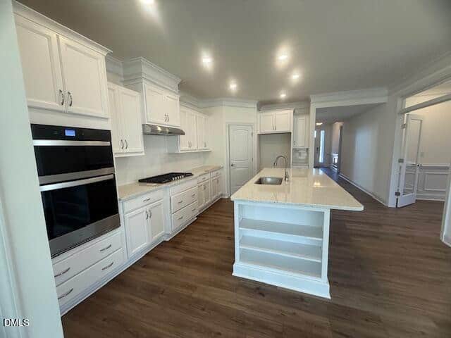 Inside, the open living area features a cozy fireplace in the family room, a large breakfast area, and a designer kitchen with a generous island, white cabinetry, stainless steel appliances, and Level 4 granite countertops. A home office/flex room provides versatility for work or hobbies. The upgraded trim package and luxury vinyl plank flooring throughout the main living spaces add warmth and elegance.