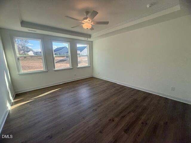 The primary suite is a private retreat with a tray ceiling, ensuite bath featuring a large tiled walk-in shower, dual vanities, water closet, and a spacious walk-in closet with direct access to the laundry room. Two additional bedrooms and a total of three full bathrooms ensure plenty of space for guests and family.