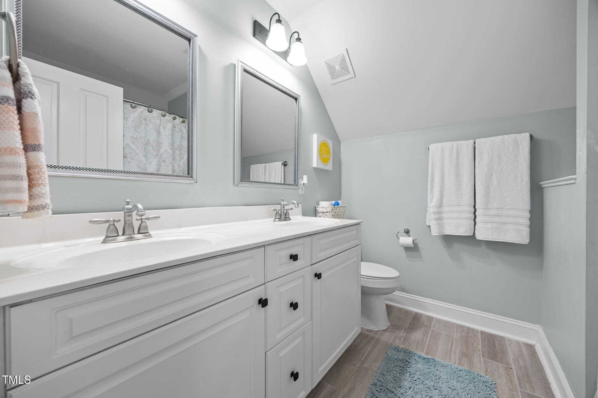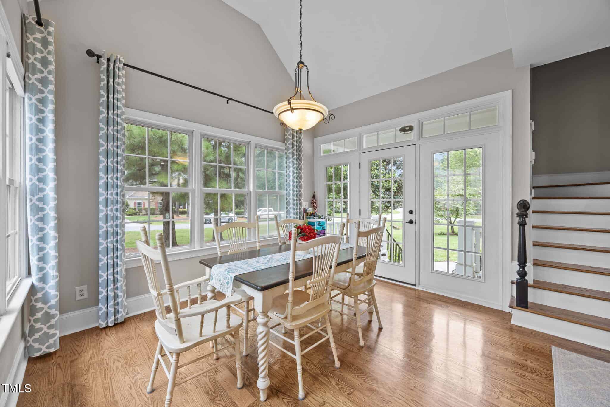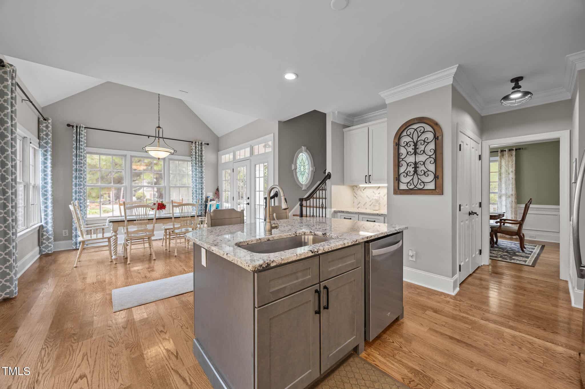 Welcome to 150 River Watch Lane, located in the highly sought-after Rivers Edge community. This beautifully updated 4-bedroom, 2.5-bath home offers approximately 2,500 heated square feet and is nestled on a .92-acre corner homesite. Upon entering, you’ll find site-finished hardwood floors that flow throughout the main living areas, extensive crown molding, and an elegant 12-lite stained wood front door with sidelights and an arched transom above. To the right of the foyer, the formal dining room features a coffered ceiling with crown molding, chair rail with picture frame wainscoting, and a triple window. The vaulted family room is filled with natural light and anchored by a ceiling fan with a light kit. The updated kitchen boasts crisp white shaker cabinets, a center island with contrasting gray cabinetry and barstool seating, granite countertops, a herringbone backsplash, under-cabinet lighting, and a dedicated coffee bar area. Whirlpool stainless-steel appliances include a smoothtop range/oven, built-in microwave, and dishwasher. The first-floor owner’s suite features plush carpet, crown molding, ceiling fan with light kit, and two double-door closets. The spa-style bath includes marble-style tile flooring, a tile-surround soaking tub, a seamless glass-enclosed shower with decorative inserts, a linen closet, water closet, dual vanity with cultured marble countertops, and cherry-stained raised-panel cabinetry. The kitchen opens to a vaulted breakfast room surrounded by windows, with access to the side covered porch—perfect for everyday entry and relaxation. The covered walkway connects to a grilling deck and detached 2-car garage with a finished second floor above with 475 square feet. A turned staircase leads upstairs to a spacious bonus room, two additional bedrooms, and a full bath. Near the Tar River, Rivers Edge is a pool community that offers natural surroundings and a peaceful setting while still providing easy access to local amenities. Just minutes from downtown Youngsville and a short drive to Wake Forest and North Raleigh, you’ll enjoy convenient shopping, dining, and services within reach. Other noteable features: New roof (2020) and, New AC unit (2018) Call today to schedule a private showing!