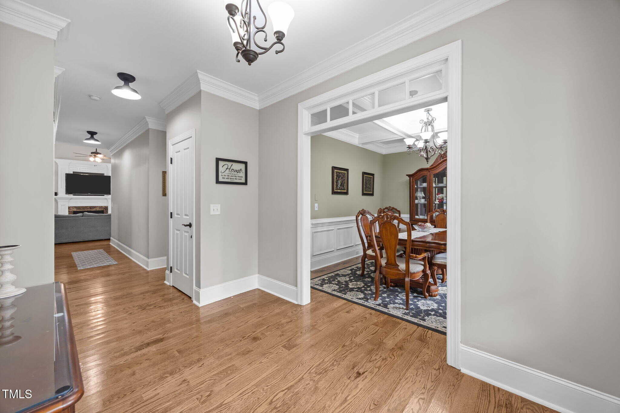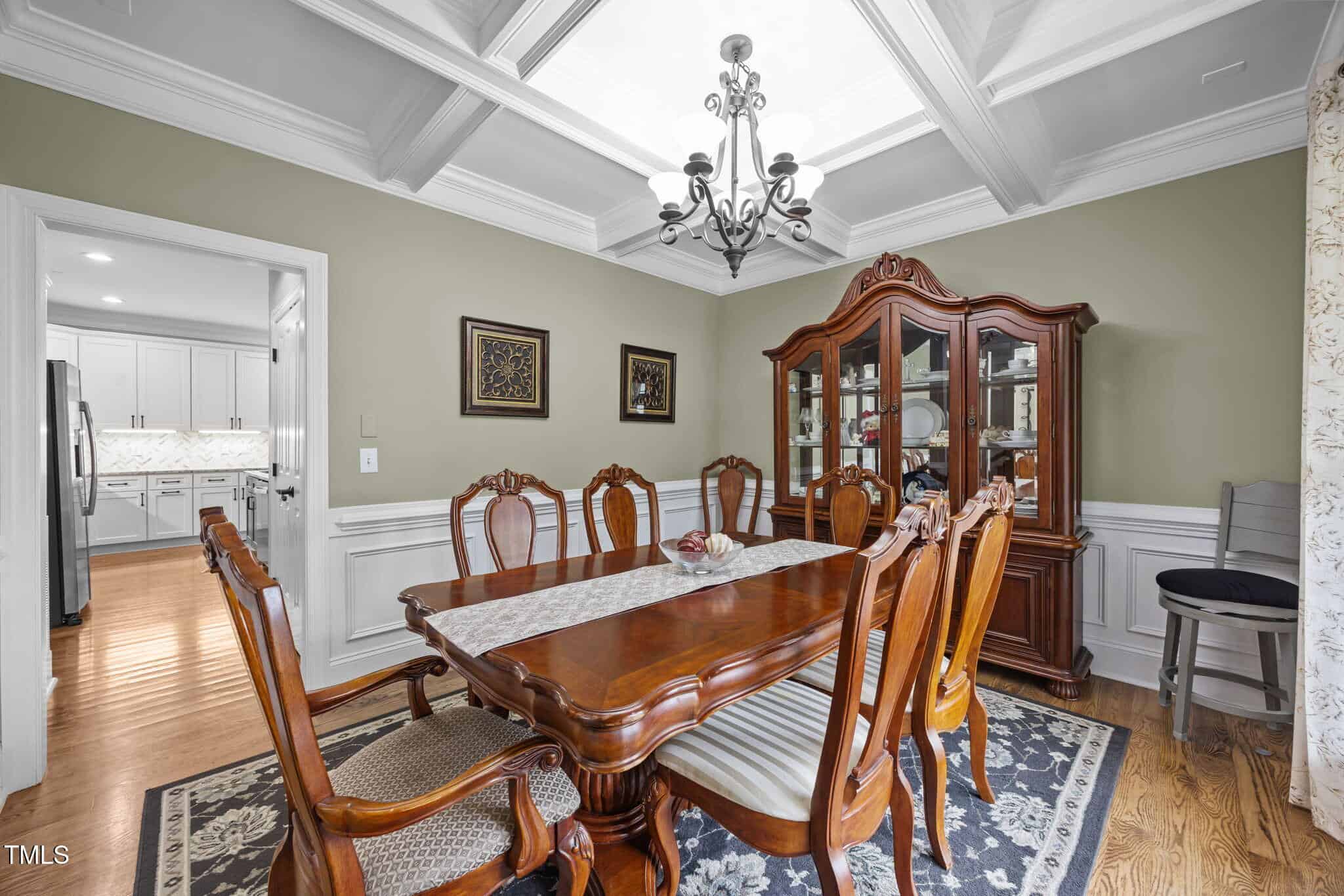 Upon entering, you’ll find site-finished hardwood floors that flow throughout the main living areas, extensive crown molding, and an elegant 12-lite stained wood front door with sidelights and an arched transom above. To the right of the foyer, the formal dining room features a coffered ceiling with crown molding, chair rail with picture frame wainscoting, and a triple window.