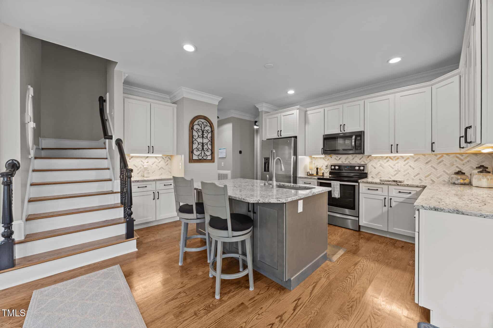 The vaulted family room is filled with natural light and anchored by a ceiling fan with a light kit. The updated kitchen boasts crisp white shaker cabinets, a center island with contrasting gray cabinetry and barstool seating, granite countertops, a herringbone backsplash, under-cabinet lighting, and a dedicated coffee bar area. Whirlpool stainless-steel appliances include a smoothtop range/oven, built-in microwave, and dishwasher.