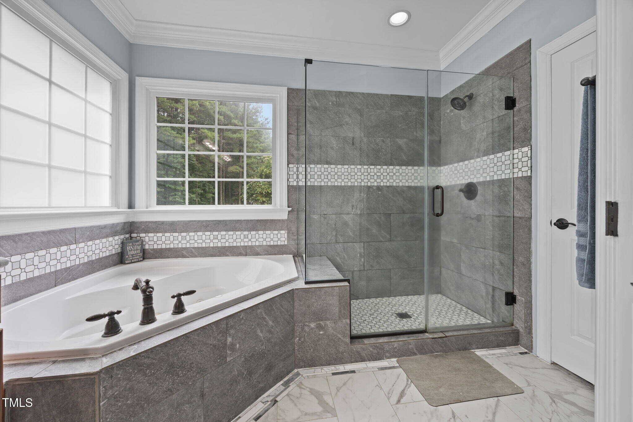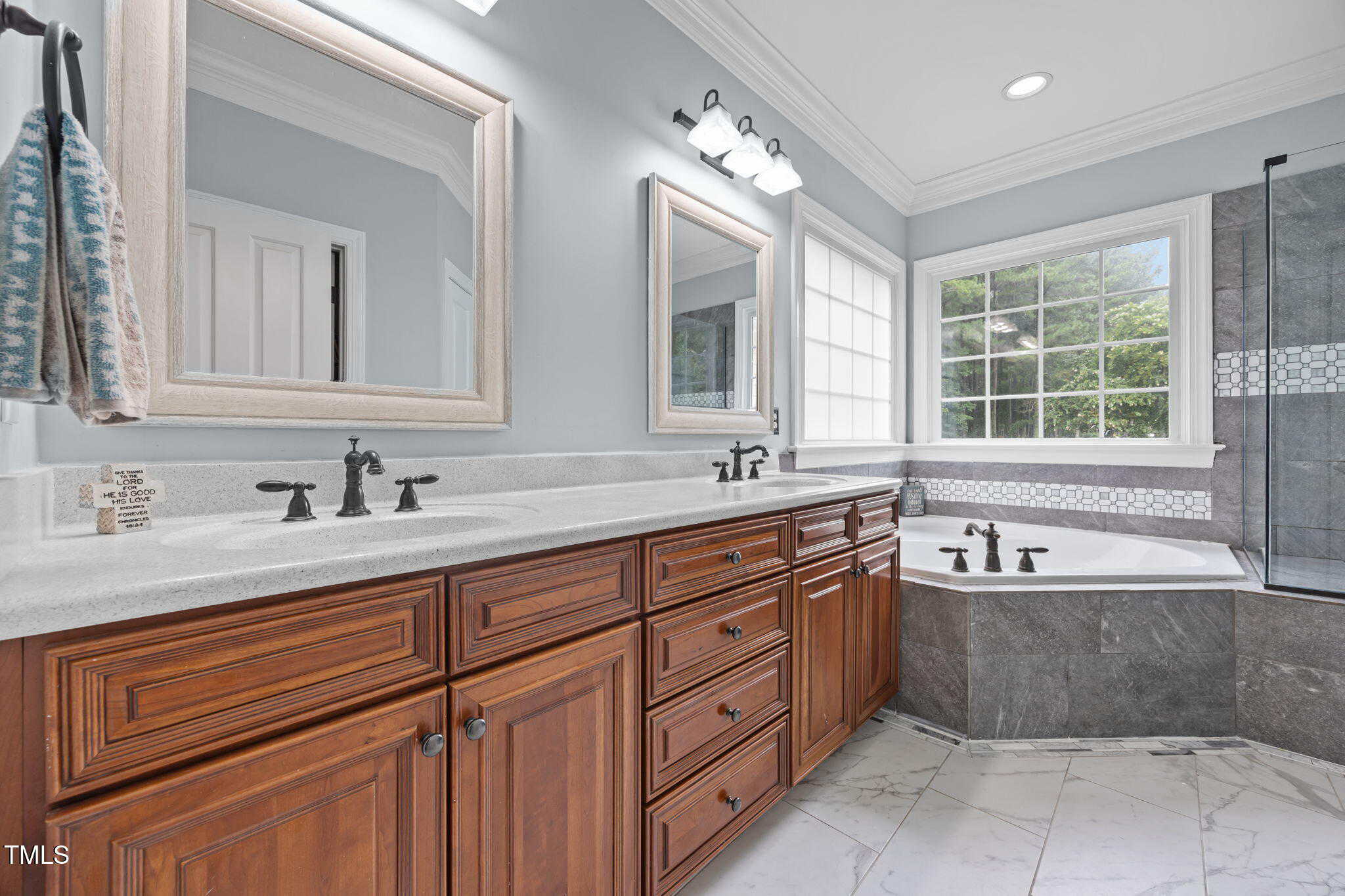 The first-floor owner’s suite features plush carpet, crown molding, ceiling fan with light kit, and two double-door closets. The spa-style bath includes marble-style tile flooring, a tile-surround soaking tub, a seamless glass-enclosed shower with decorative inserts, a linen closet, water closet, dual vanity with cultured marble countertops, and cherry-stained raised-panel cabinetry.