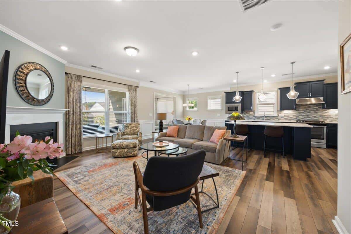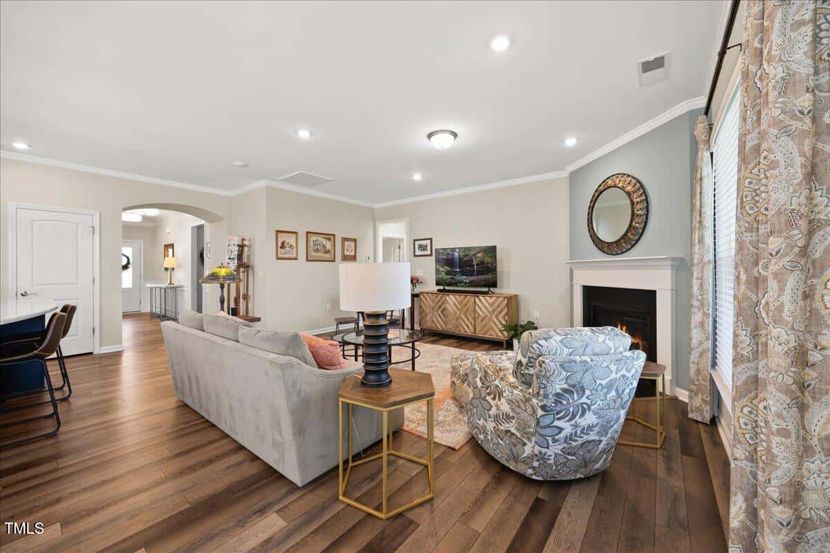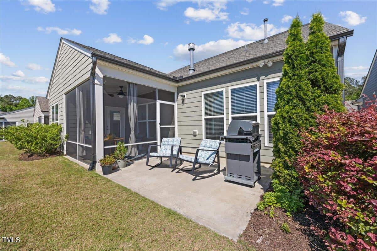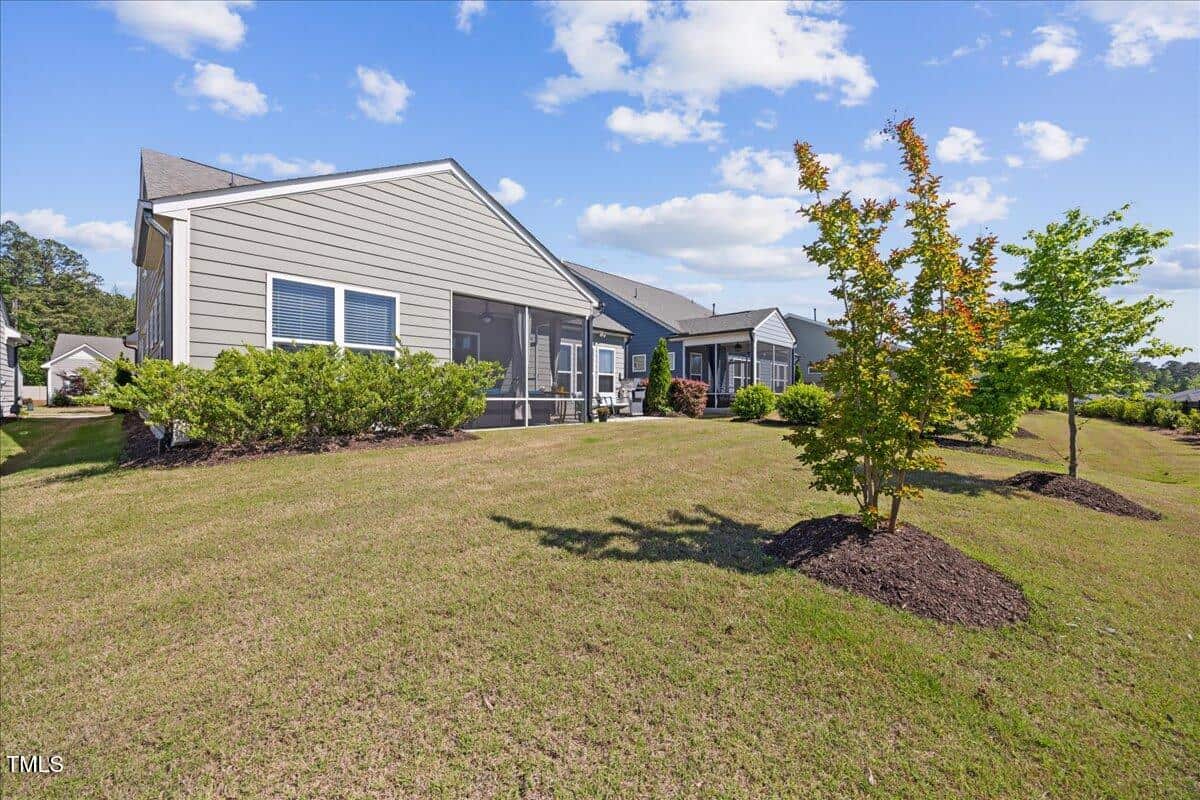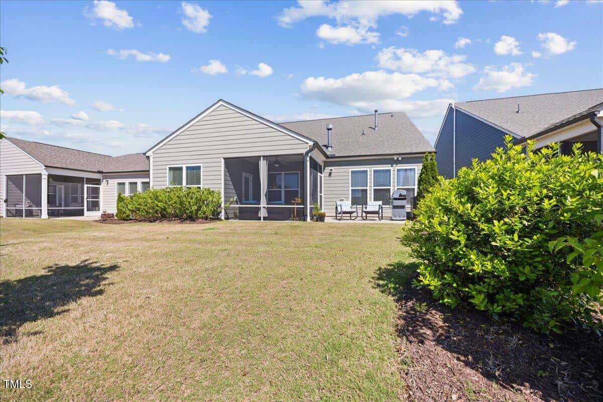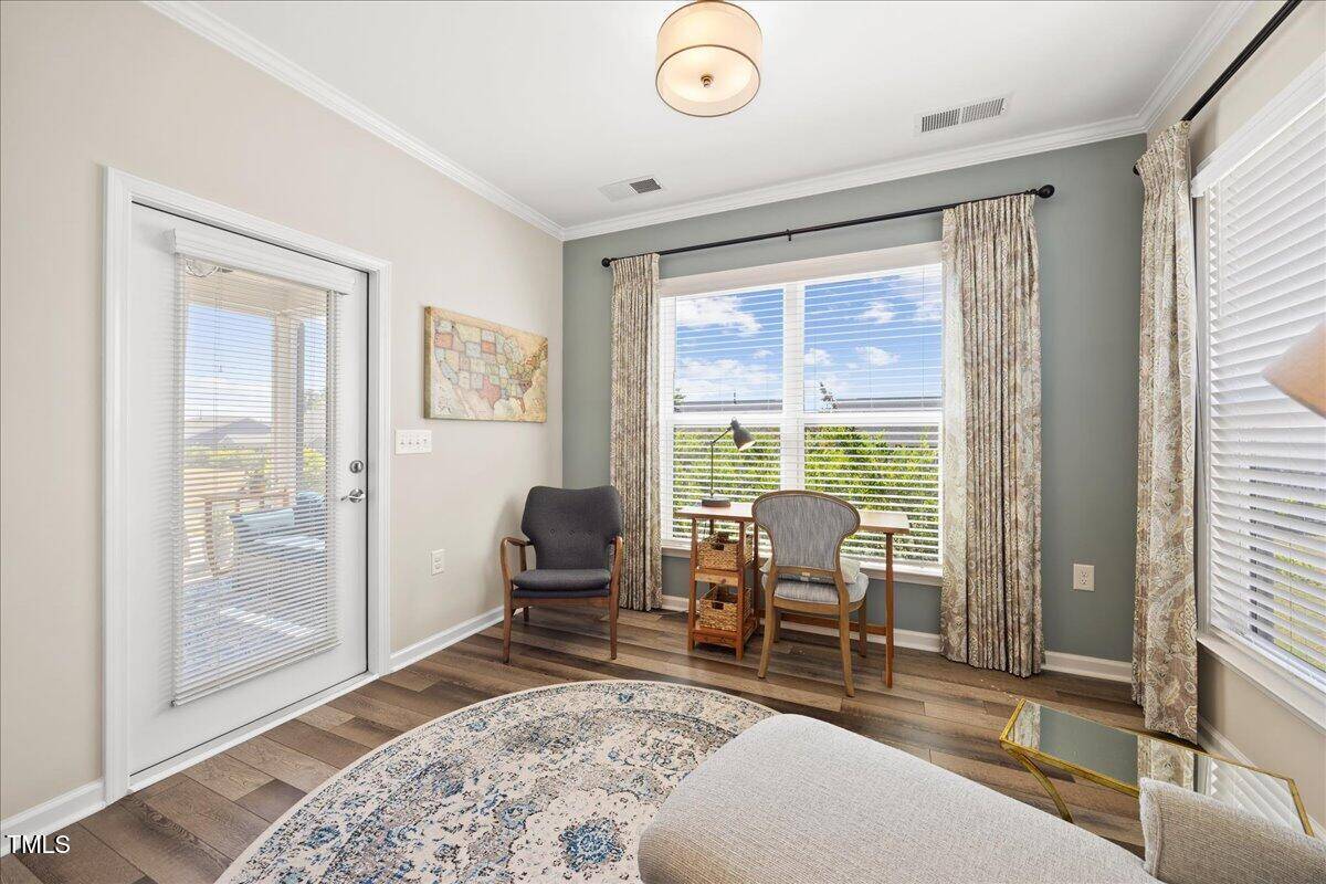 Discover this true 3 bedroom, 3 bath home in the vibrant active adult community of Traditions at Del Webb offering both comfort and flexibility. This home has ”step free” comfort on all main floor areas. Enjoy thoughtfully designed spaces including a loft, private study with French doors, sunroom, lanai and an extended patio. This gorgeous home has upgrades galore! You are greeted by a wide, welcoming foyer with custom trim throughout the entire 1st floor of the home! Buyers who are senitive to allergies or who have pets will enjoy the ease of LVP floors throughout the entire home. The home has a nice size guest suite on the main floor with beautiful designer wallpaper for an elevated look. The full bathroom features a walk-in shower with tile walls & floors. The designated home office has french doors for privacy. Enjoy gorgeous, custom designed window treatments throughout many areas of the home. The large family room is anchored by a pretty corner fireplace. The open floor plan makes cooking & entertaining seamless. The kitchen is a cooks dream with many upgrades! Enjoy stunning white quartz countertops, soft close & dove tailed navy cabinets and drawers, glass tile backsplash, under cabinet lighting, upgraded stainless steel appliances, gas range with custom hood and upgraded pantry shelving. The owner’s suite has a generous layout. This serene retreat offers blackout curtains for restful nights and elegant custom wallpaper that adds a designer touch. The expansive ensuite bath boasts dual vanities, a walk in tiled shower with a glass enclosure, grab bar for safety and a bench. You will be delighted by the large custom closet for ultimate organization. The laundry room offers a work sink, extra cabinets and a folding area. Keep things tidy by utilizing the drop zone area as you enter from the garage. This area features a lovely custom wallpaper back drop. The staircase to the 2nd floor has wood treads & an upgraded open rail iron baluster. Upstairs you will find a loft space that is perfect for a second den or flex area. The 2nd floor also features a good size bedroom and a full bath with a tiled, tub/shower combination. This loft/bedroom area is also perfect for guests to enjoy their own ”wing” of the house! This area also features a nice size, finished walk in storage area that is perfect for suitcases or holiday decor etc. Outside you can curl up to read a book on your screened lanai or enjoy hosting bbq’s with friends on the large, extended patio area. The patio also features a outdoor gas line. This community features a wonderful community center with a large gym, indoor pool, multiple rooms for clubs, pickle ball/tennis courts, walking trails, a community garden, a dog park and sidewalks throughout. Stay as active as you like with exceptional community amenites designed for every lifestyle! Enjoy living within minutes to the cute, historic downtown Wake Forest, plenty of medical facilities, shopping and restaurants. Live comfortably and elegantly in this beautiful home!