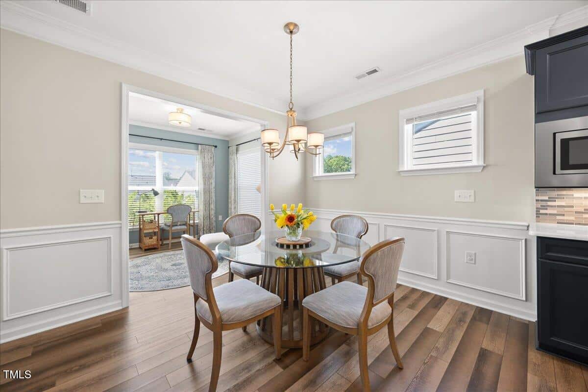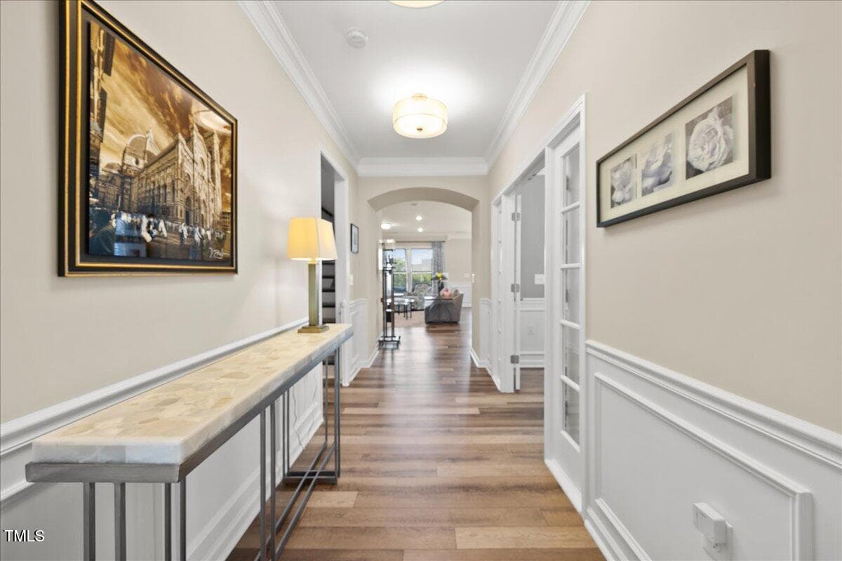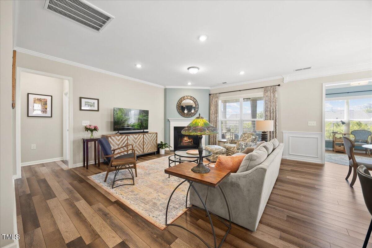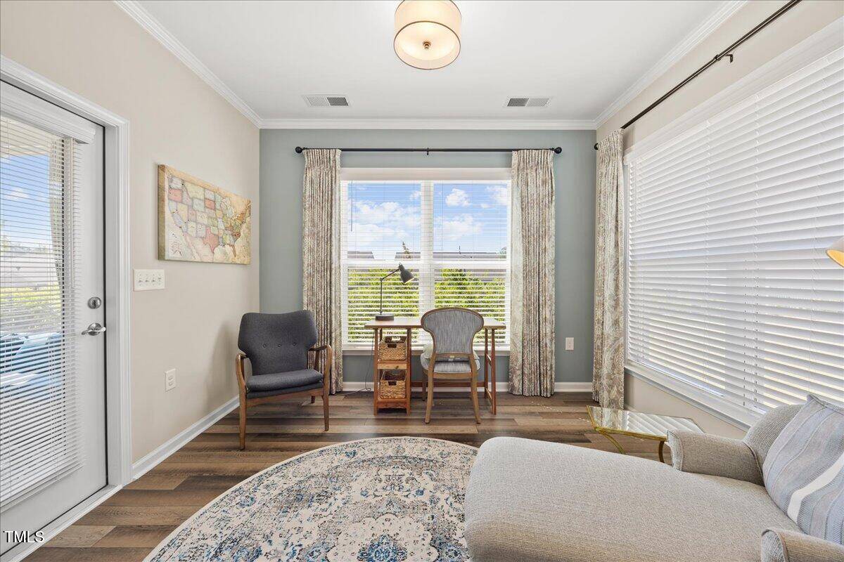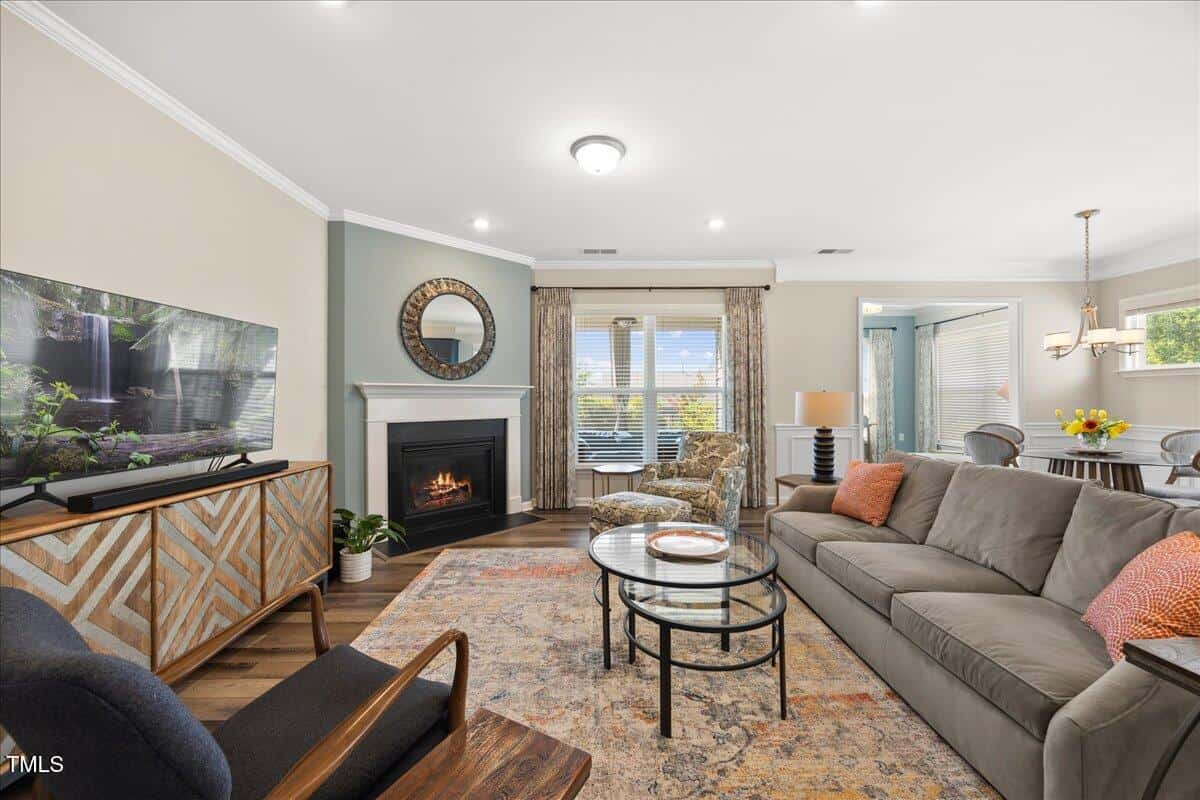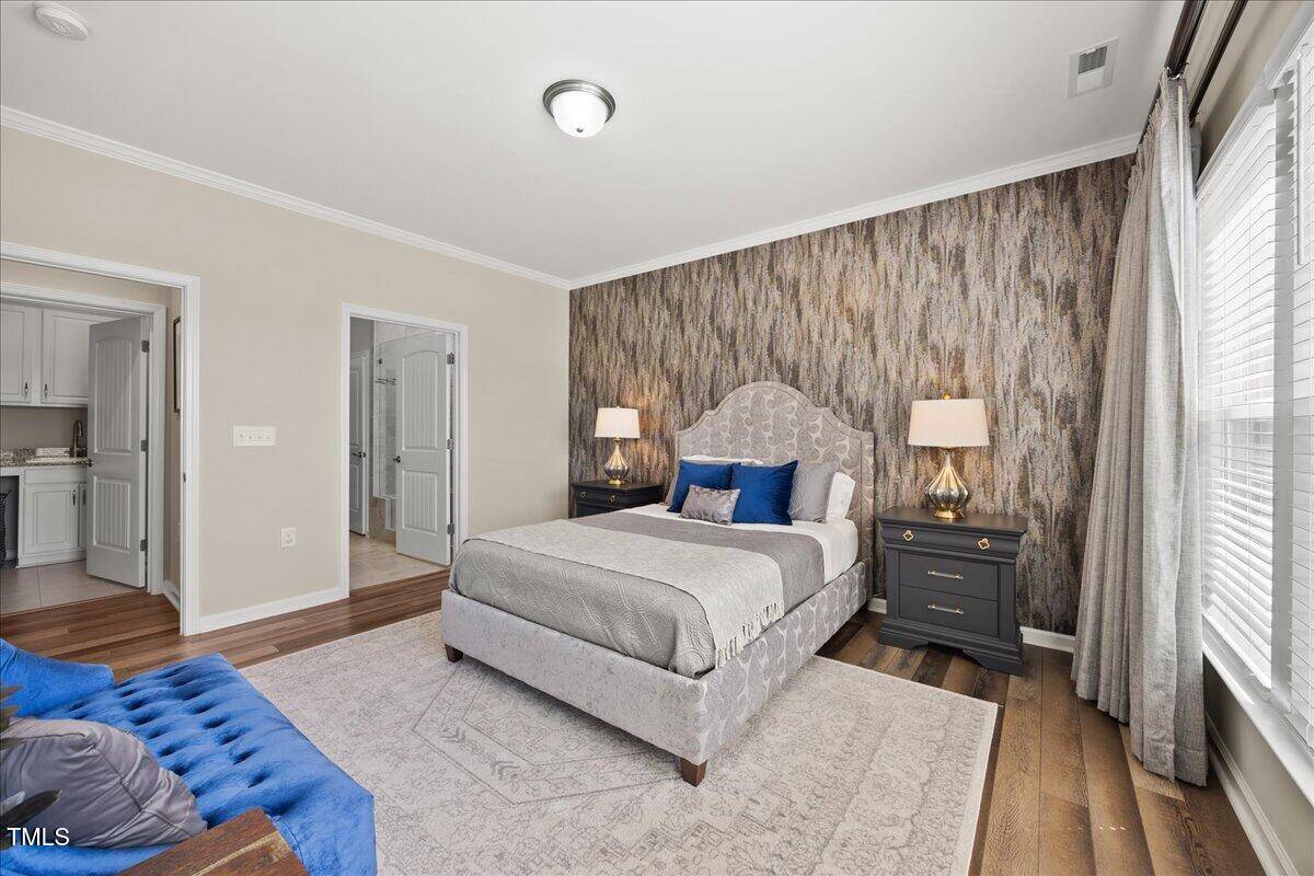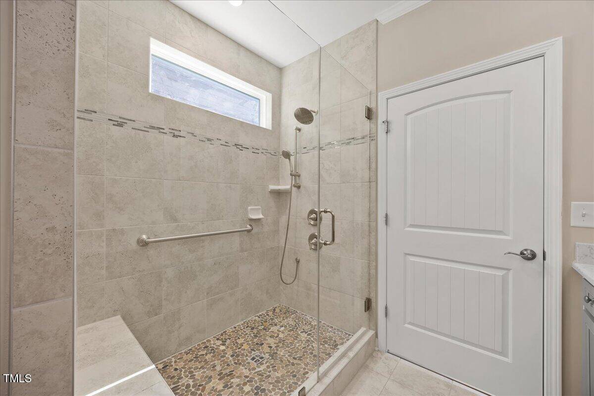 Discover this true 3 bedroom, 3 bath home in the vibrant active adult community of Traditions at Del Webb offering both comfort and flexibility. This home has ”step free” comfort on all main floor areas. Enjoy thoughtfully designed spaces including a loft, private study with French doors, sunroom, lanai and an extended patio. This gorgeous home has upgrades galore! You are greeted by a wide, welcoming foyer with custom trim throughout the entire 1st floor of the home! Buyers who are senitive to allergies or who have pets will enjoy the ease of LVP floors throughout the entire home. The home has a nice size guest suite on the main floor with beautiful designer wallpaper for an elevated look. The full bathroom features a walk-in shower with tile walls & floors. The designated home office has french doors for privacy. Enjoy gorgeous, custom designed window treatments throughout many areas of the home. The large family room is anchored by a pretty corner fireplace. The open floor plan makes cooking & entertaining seamless. The kitchen is a cooks dream with many upgrades! Enjoy stunning white quartz countertops, soft close & dove tailed navy cabinets and drawers, glass tile backsplash, under cabinet lighting, upgraded stainless steel appliances, gas range with custom hood and upgraded pantry shelving. The owner’s suite has a generous layout. This serene retreat offers blackout curtains for restful nights and elegant custom wallpaper that adds a designer touch. The expansive ensuite bath boasts dual vanities, a walk in tiled shower with a glass enclosure, grab bar for safety and a bench. You will be delighted by the large custom closet for ultimate organization. The laundry room offers a work sink, extra cabinets and a folding area. Keep things tidy by utilizing the drop zone area as you enter from the garage. This area features a lovely custom wallpaper back drop. The staircase to the 2nd floor has wood treads & an upgraded open rail iron baluster. Upstairs you will find a loft space that is perfect for a second den or flex area. The 2nd floor also features a good size bedroom and a full bath with a tiled, tub/shower combination. This loft/bedroom area is also perfect for guests to enjoy their own ”wing” of the house! This area also features a nice size, finished walk in storage area that is perfect for suitcases or holiday decor etc. Outside you can curl up to read a book on your screened lanai or enjoy hosting bbq’s with friends on the large, extended patio area. The patio also features a outdoor gas line. This community features a wonderful community center with a large gym, indoor pool, multiple rooms for clubs, pickle ball/tennis courts, walking trails, a community garden, a dog park and sidewalks throughout. Stay as active as you like with exceptional community amenites designed for every lifestyle! Enjoy living within minutes to the cute, historic downtown Wake Forest, plenty of medical facilities, shopping and restaurants. Live comfortably and elegantly in this beautiful home!