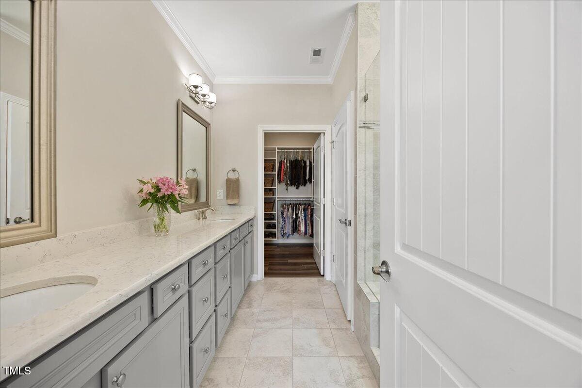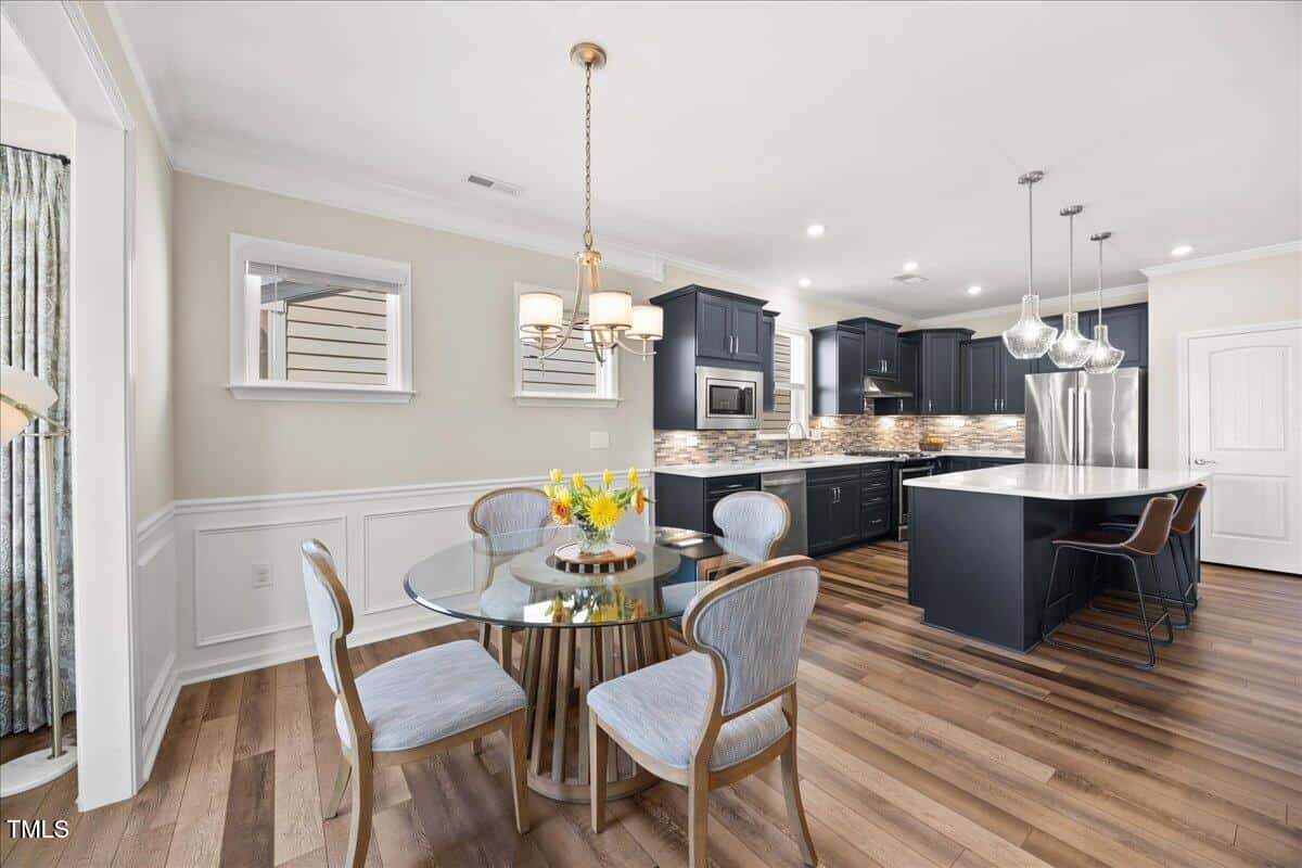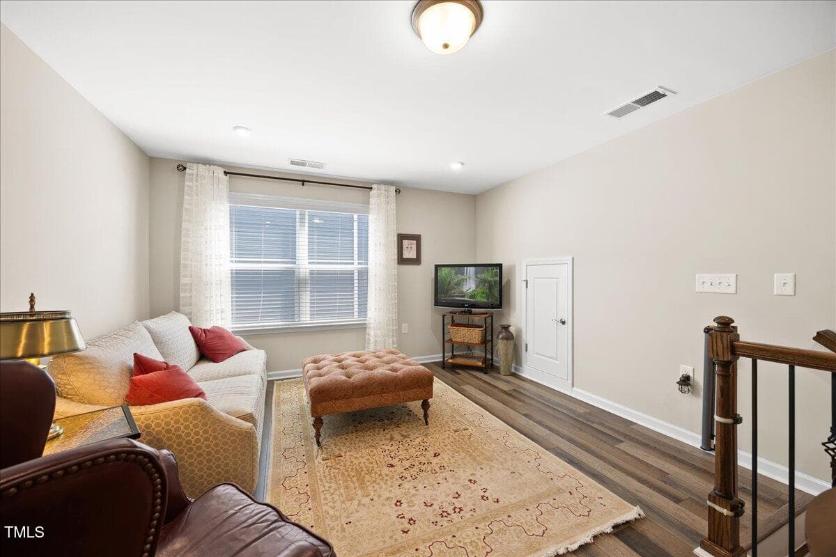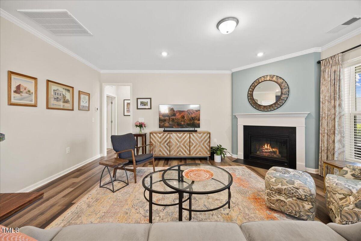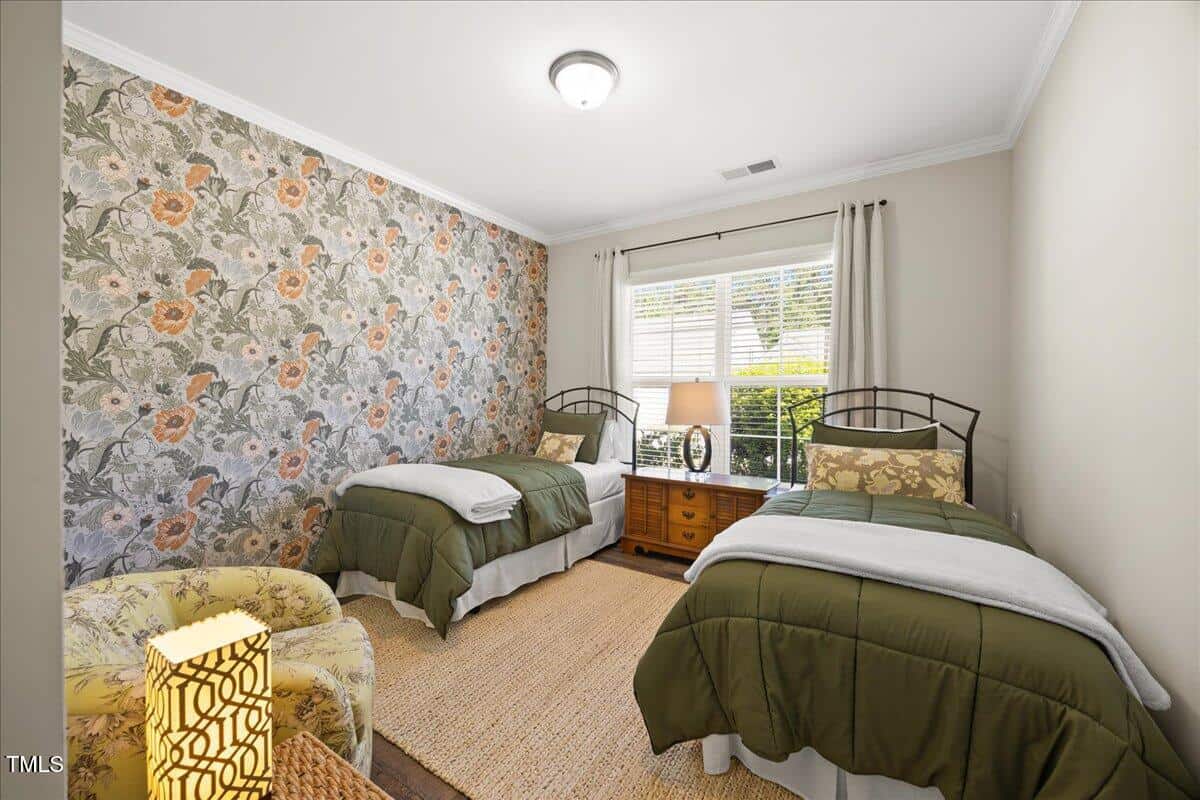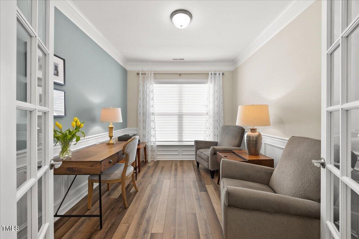 Discover this true 3 bedroom, 3 bath home in the vibrant active adult community of Traditions at Del Webb offering both comfort and flexibility. This home has ”step free” comfort on all main floor areas. Enjoy thoughtfully designed spaces including a loft, private study with French doors, sunroom, lanai and an extended patio. This gorgeous home has upgrades galore! You are greeted by a wide, welcoming foyer with custom trim throughout the entire 1st floor of the home! Buyers who are senitive to allergies or who have pets will enjoy the ease of LVP floors throughout the entire home. The home has a nice size guest suite on the main floor with beautiful designer wallpaper for an elevated look. The full bathroom features a walk-in shower with tile walls & floors. The designated home office has french doors for privacy. Enjoy gorgeous, custom designed window treatments throughout many areas of the home. The large family room is anchored by a pretty corner fireplace. The open floor plan makes cooking & entertaining seamless. The kitchen is a cooks dream with many upgrades! Enjoy stunning white quartz countertops, soft close & dove tailed navy cabinets and drawers, glass tile backsplash, under cabinet lighting, upgraded stainless steel appliances, gas range with custom hood and upgraded pantry shelving. The owner’s suite has a generous layout. This serene retreat offers blackout curtains for restful nights and elegant custom wallpaper that adds a designer touch. The expansive ensuite bath boasts dual vanities, a walk in tiled shower with a glass enclosure, grab bar for safety and a bench. You will be delighted by the large custom closet for ultimate organization. The laundry room offers a work sink, extra cabinets and a folding area. Keep things tidy by utilizing the drop zone area as you enter from the garage. This area features a lovely custom wallpaper back drop. The staircase to the 2nd floor has wood treads & an upgraded open rail iron baluster. Upstairs you will find a loft space that is perfect for a second den or flex area. The 2nd floor also features a good size bedroom and a full bath with a tiled, tub/shower combination. This loft/bedroom area is also perfect for guests to enjoy their own ”wing” of the house! This area also features a nice size, finished walk in storage area that is perfect for suitcases or holiday decor etc. Outside you can curl up to read a book on your screened lanai or enjoy hosting bbq’s with friends on the large, extended patio area. The patio also features a outdoor gas line. This community features a wonderful community center with a large gym, indoor pool, multiple rooms for clubs, pickle ball/tennis courts, walking trails, a community garden, a dog park and sidewalks throughout. Stay as active as you like with exceptional community amenites designed for every lifestyle! Enjoy living within minutes to the cute, historic downtown Wake Forest, plenty of medical facilities, shopping and restaurants. Live comfortably and elegantly in this beautiful home!
