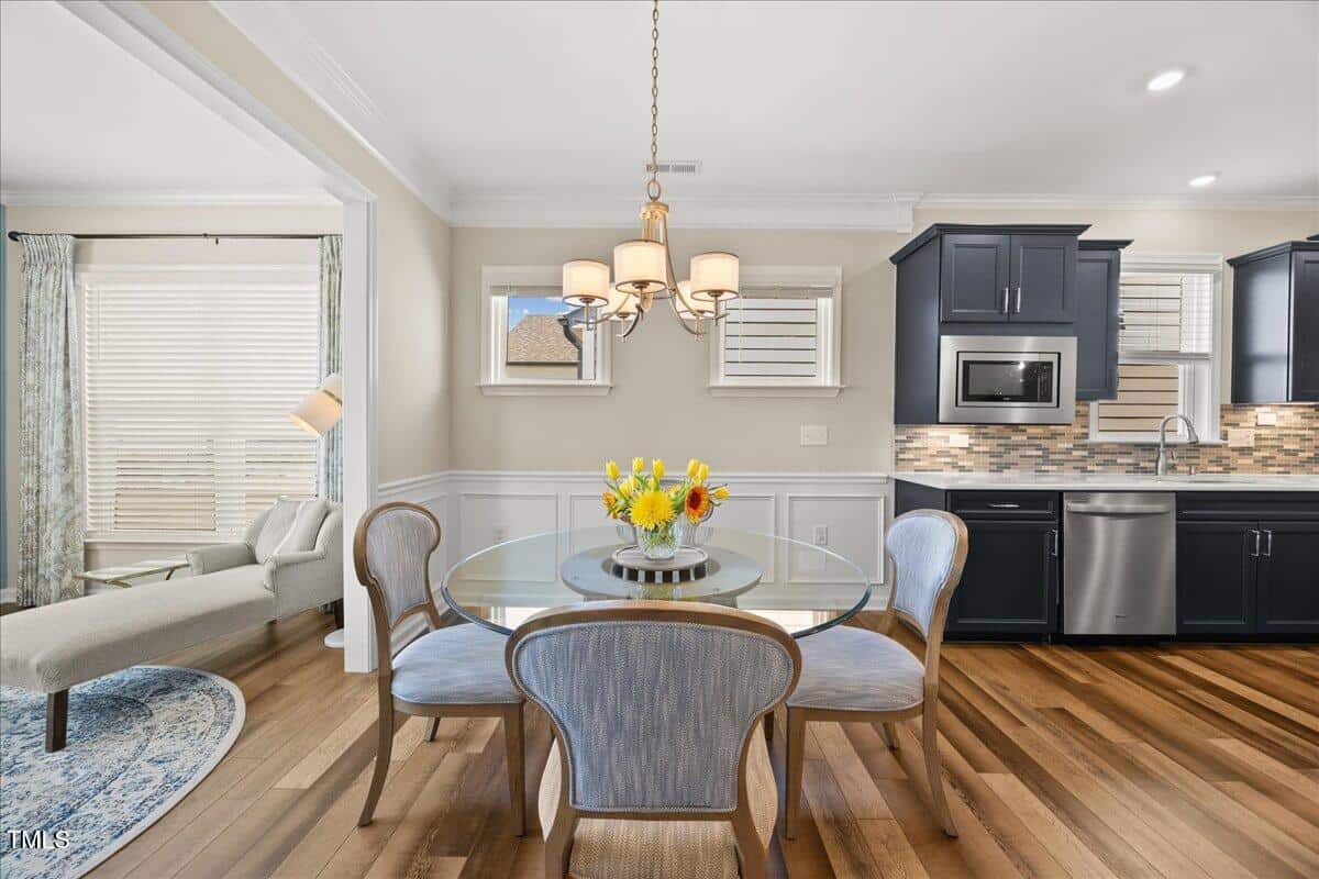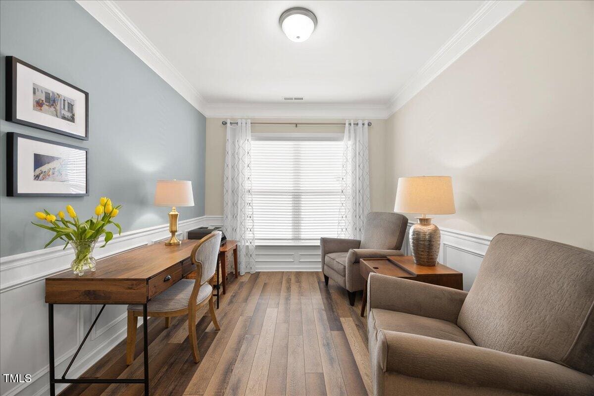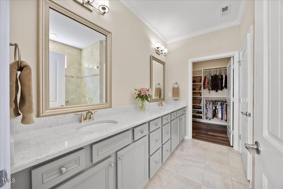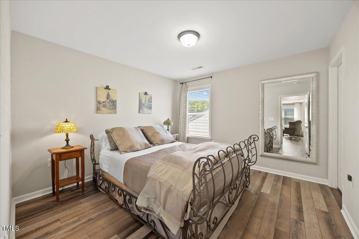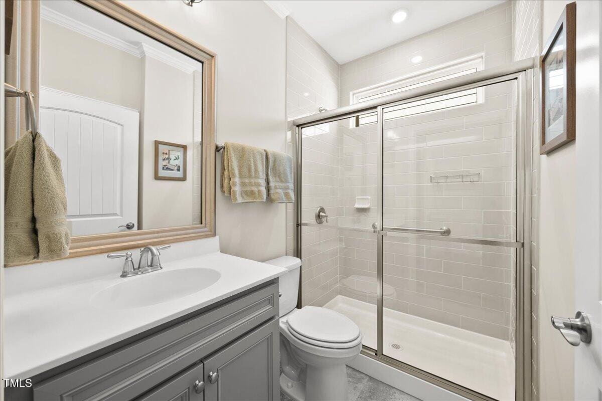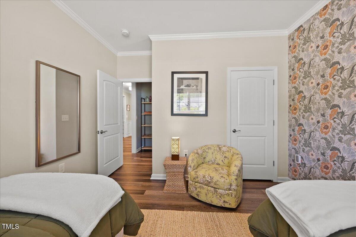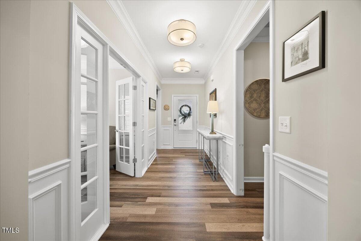 Discover this true 3 bedroom, 3 bath home in the vibrant active adult community of Traditions at Del Webb offering both comfort and flexibility. This home has ”step free” comfort on all main floor areas. Enjoy thoughtfully designed spaces including a loft, private study with French doors, sunroom, lanai and an extended patio. This gorgeous home has upgrades galore! You are greeted by a wide, welcoming foyer with custom trim throughout the entire 1st floor of the home! Buyers who are senitive to allergies or who have pets will enjoy the ease of LVP floors throughout the entire home. The home has a nice size guest suite on the main floor with beautiful designer wallpaper for an elevated look. The full bathroom features a walk-in shower with tile walls & floors. The designated home office has french doors for privacy. Enjoy gorgeous, custom designed window treatments throughout many areas of the home. The large family room is anchored by a pretty corner fireplace. The open floor plan makes cooking & entertaining seamless. The kitchen is a cooks dream with many upgrades! Enjoy stunning white quartz countertops, soft close & dove tailed navy cabinets and drawers, glass tile backsplash, under cabinet lighting, upgraded stainless steel appliances, gas range with custom hood and upgraded pantry shelving. The owner’s suite has a generous layout. This serene retreat offers blackout curtains for restful nights and elegant custom wallpaper that adds a designer touch. The expansive ensuite bath boasts dual vanities, a walk in tiled shower with a glass enclosure, grab bar for safety and a bench. You will be delighted by the large custom closet for ultimate organization. The laundry room offers a work sink, extra cabinets and a folding area. Keep things tidy by utilizing the drop zone area as you enter from the garage. This area features a lovely custom wallpaper back drop. The staircase to the 2nd floor has wood treads & an upgraded open rail iron baluster. Upstairs you will find a loft space that is perfect for a second den or flex area. The 2nd floor also features a good size bedroom and a full bath with a tiled, tub/shower combination. This loft/bedroom area is also perfect for guests to enjoy their own ”wing” of the house! This area also features a nice size, finished walk in storage area that is perfect for suitcases or holiday decor etc. Outside you can curl up to read a book on your screened lanai or enjoy hosting bbq’s with friends on the large, extended patio area. The patio also features a outdoor gas line. This community features a wonderful community center with a large gym, indoor pool, multiple rooms for clubs, pickle ball/tennis courts, walking trails, a community garden, a dog park and sidewalks throughout. Stay as active as you like with exceptional community amenites designed for every lifestyle! Enjoy living within minutes to the cute, historic downtown Wake Forest, plenty of medical facilities, shopping and restaurants. Live comfortably and elegantly in this beautiful home!