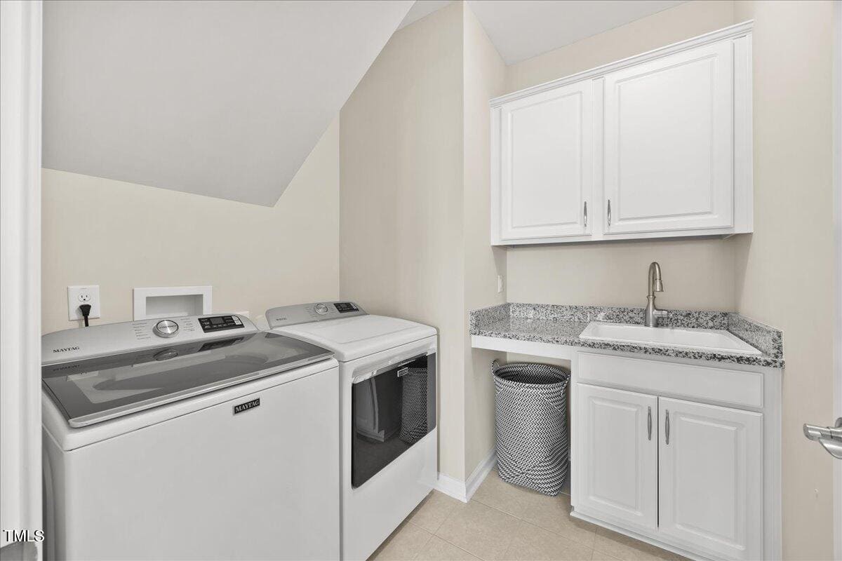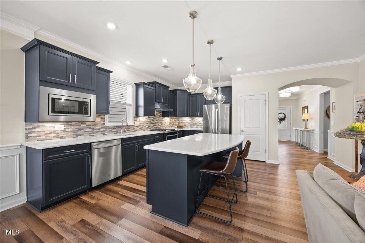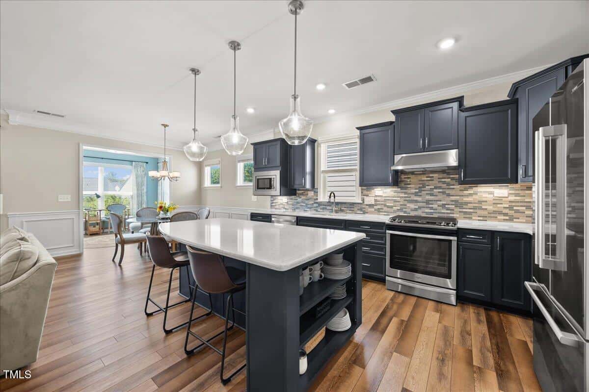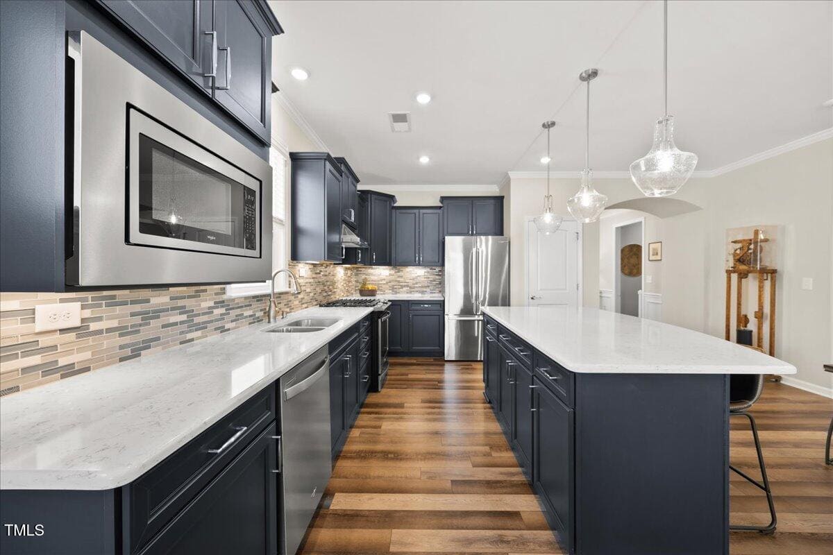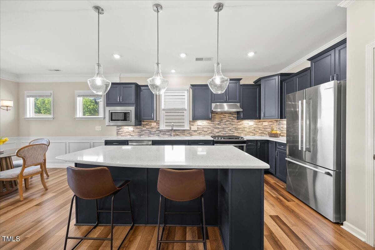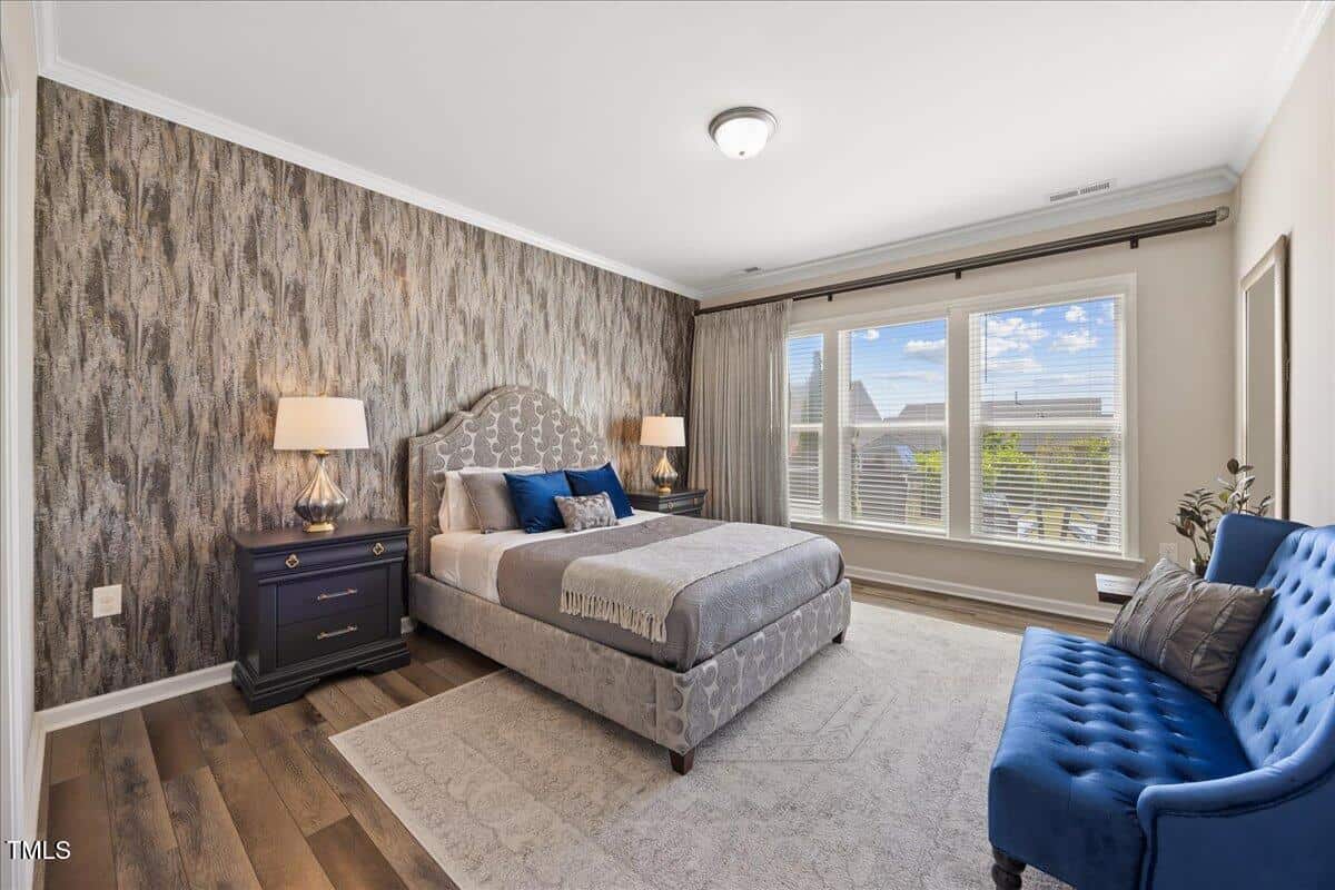 The kitchen is a cooks dream with many upgrades! Enjoy stunning white quartz countertops, soft close & dove tailed navy cabinets and drawers, glass tile backsplash, under cabinet lighting, upgraded stainless steel appliances, gas range with custom hood and upgraded pantry shelving. The owner’s suite has a generous layout. This serene retreat offers blackout curtains for restful nights and elegant custom wallpaper that adds a designer touch. The expansive ensuite bath boasts dual vanities, a walk in tiled shower with a glass enclosure, grab bar for safety and a bench. You will be delighted by the large custom closet for ultimate organization. The laundry room offers a work sink, extra cabinets and a folding area. Keep things tidy by utilizing the drop zone area as you enter from the garage. This area features a lovely custom wallpaper back drop.