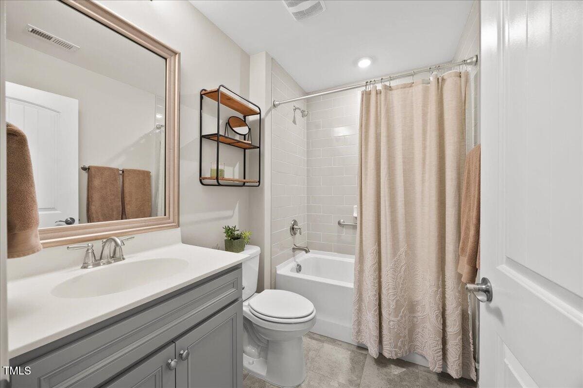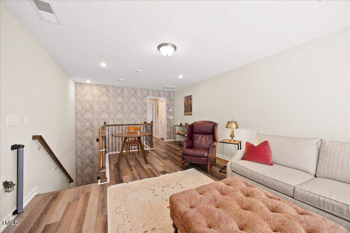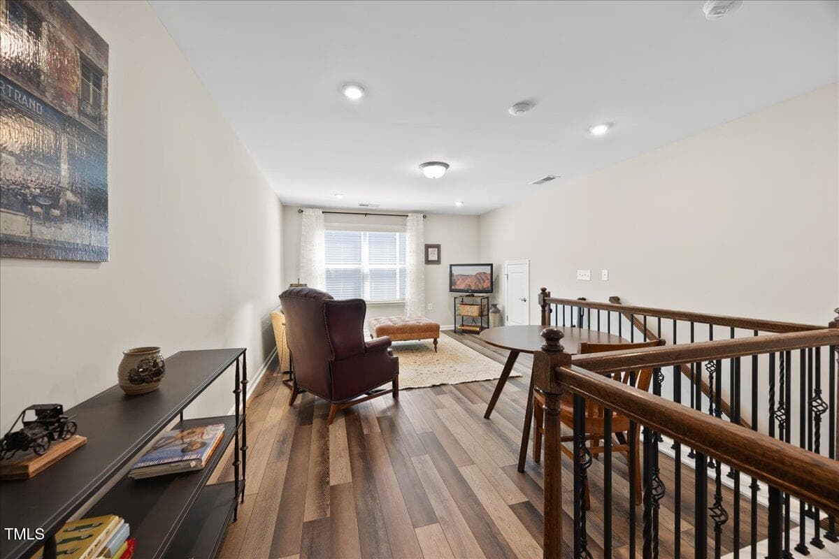 The staircase to the 2nd floor has wood treads & an upgraded open rail iron baluster. Upstairs you will find a loft space that is perfect for a second den or flex area. The 2nd floor also features a good size bedroom and a full bath with a tiled, tub/shower combination. This loft/bedroom area is also perfect for guests to enjoy their own ”wing” of the house! This area also features a nice size, finished walk in storage area that is perfect for suitcases or holiday decor etc.