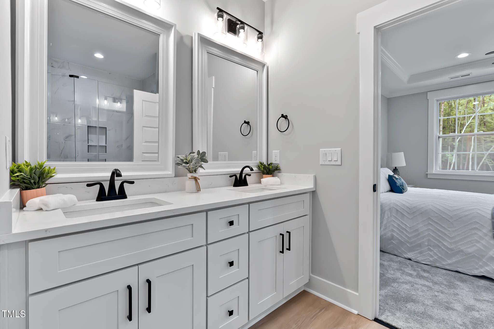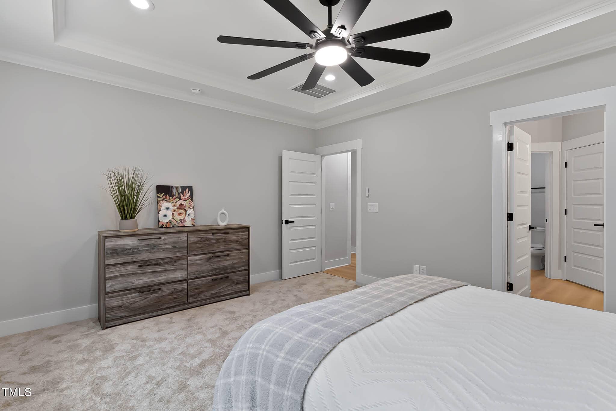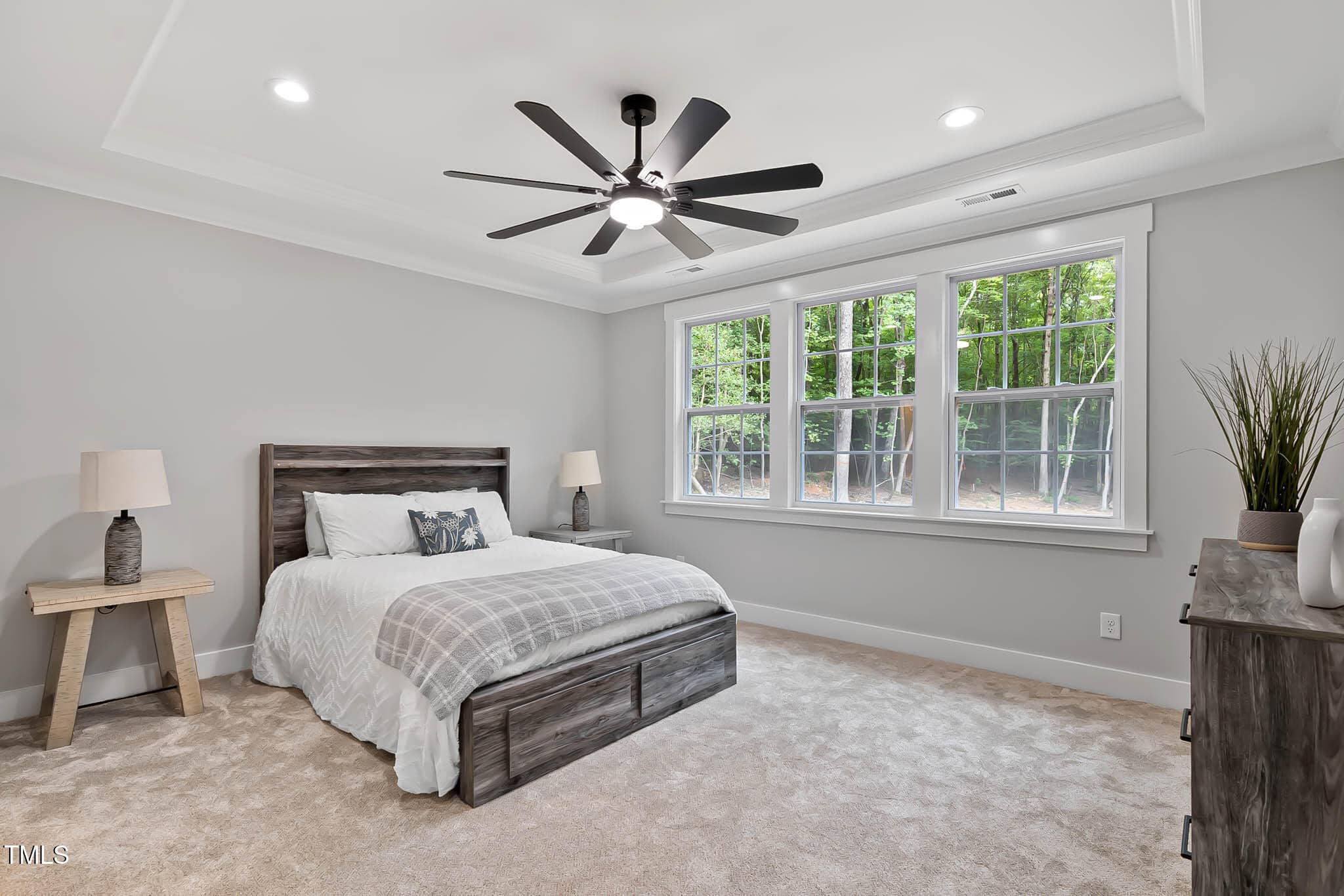 Open the door to the secluded primary bedroom with tray ceiling, walk-in closet, primary bathroom with dual-sink vanity, large tiled luxe shower with seat, and private water closet. The secondary bedrooms feature ample closets and shared hall bath. Gorgeous quartz slabs adorn all countertops throughout.