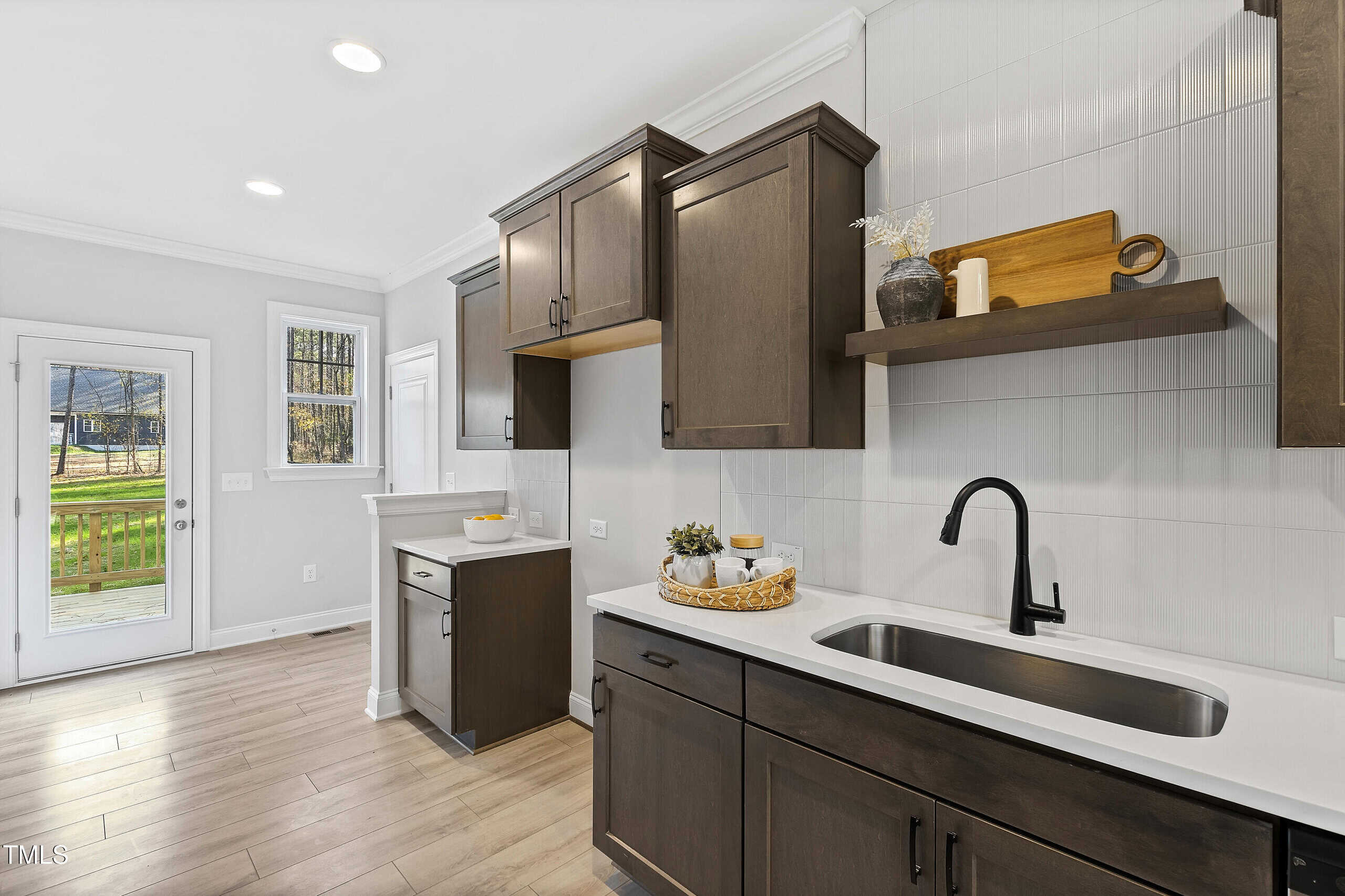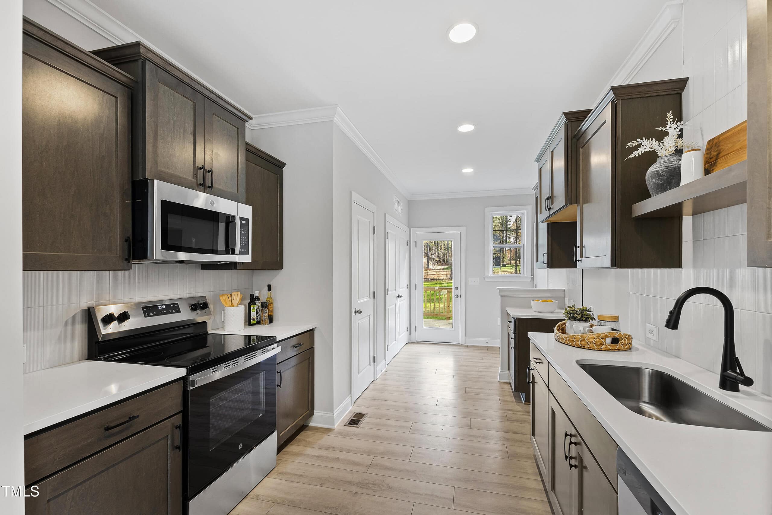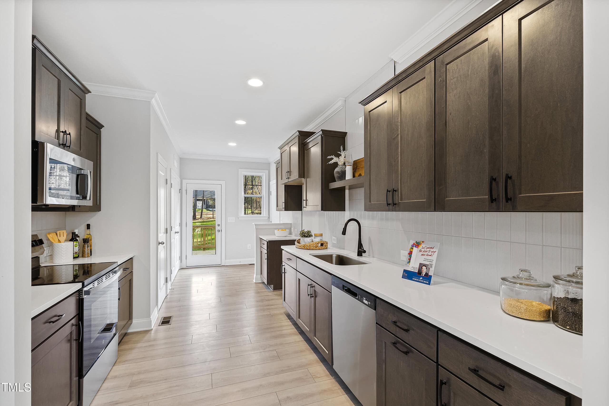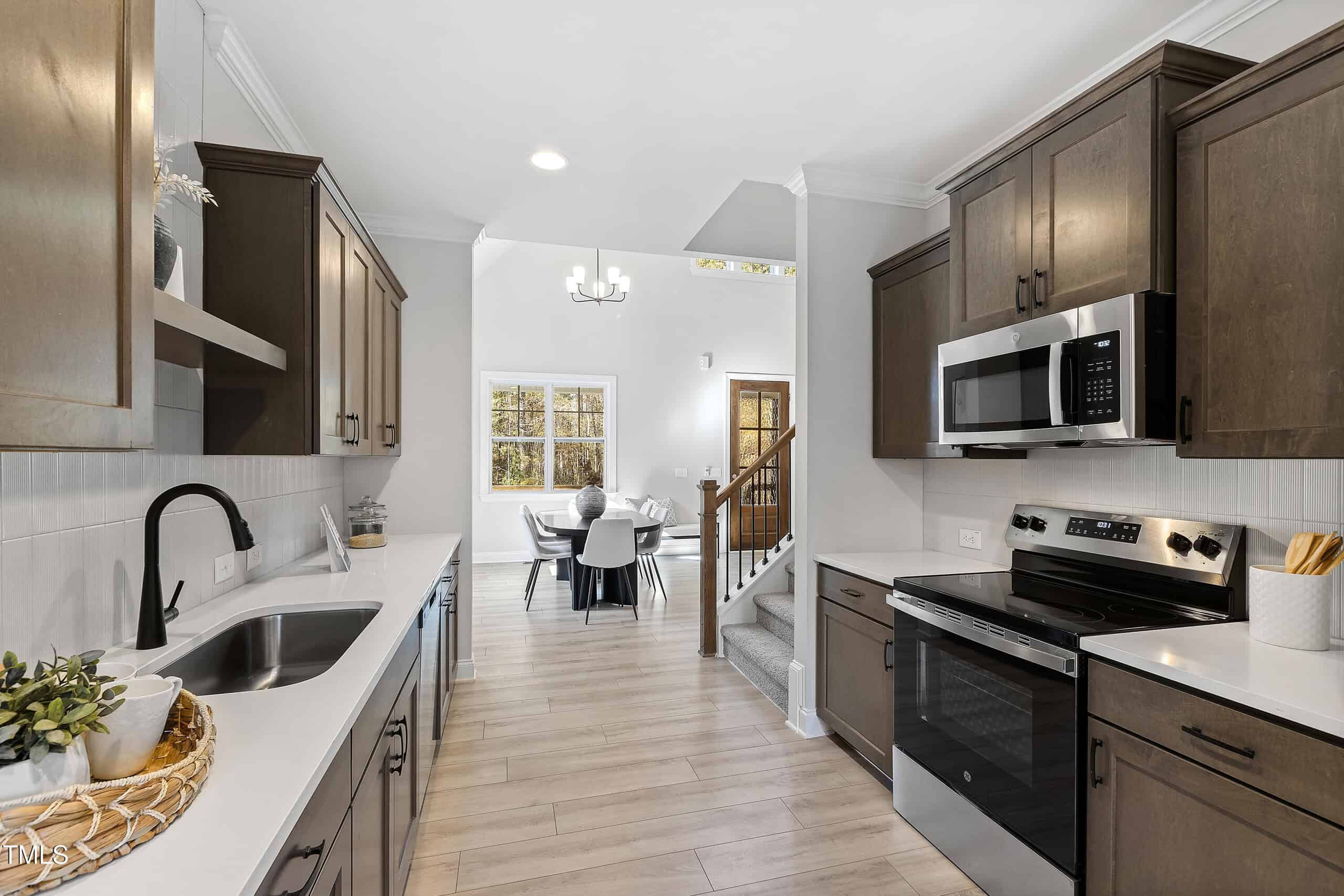 Kit: Cstm ”Ash” Painted Cabs, ”Miami White” Quartz Ctops, ”Euphora Pearl” Linear 3×12 Vertical Tile Backsplash, Dbl Trash Cabinet, Single Bowl Sink w/Pull Out Faucet, Crown, Recessed Lighting, Walk in Pantry & SS Appliances!