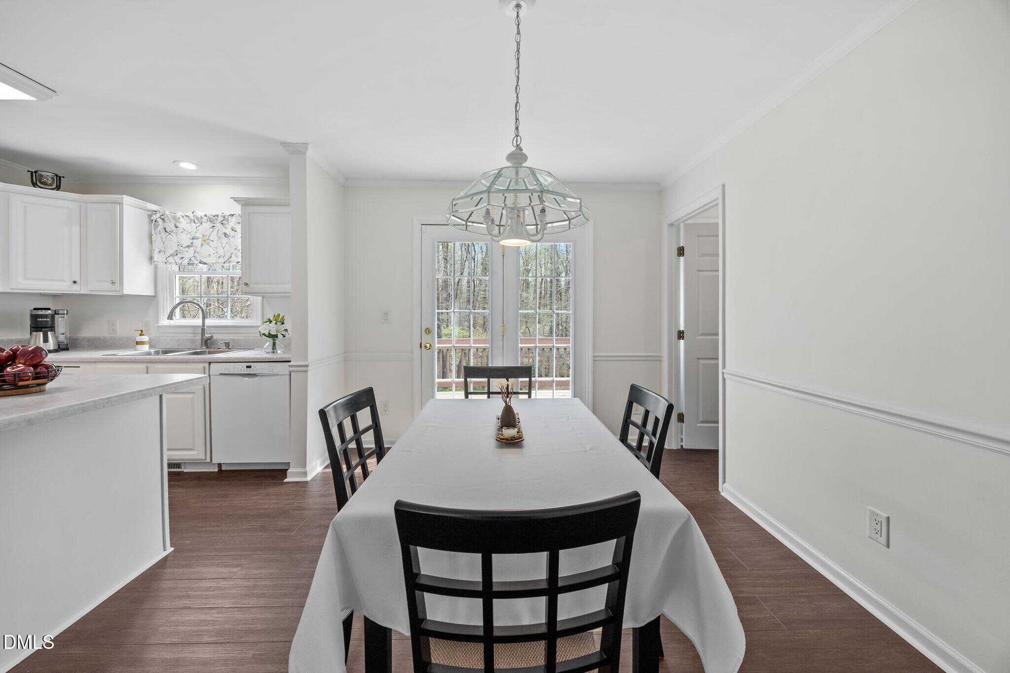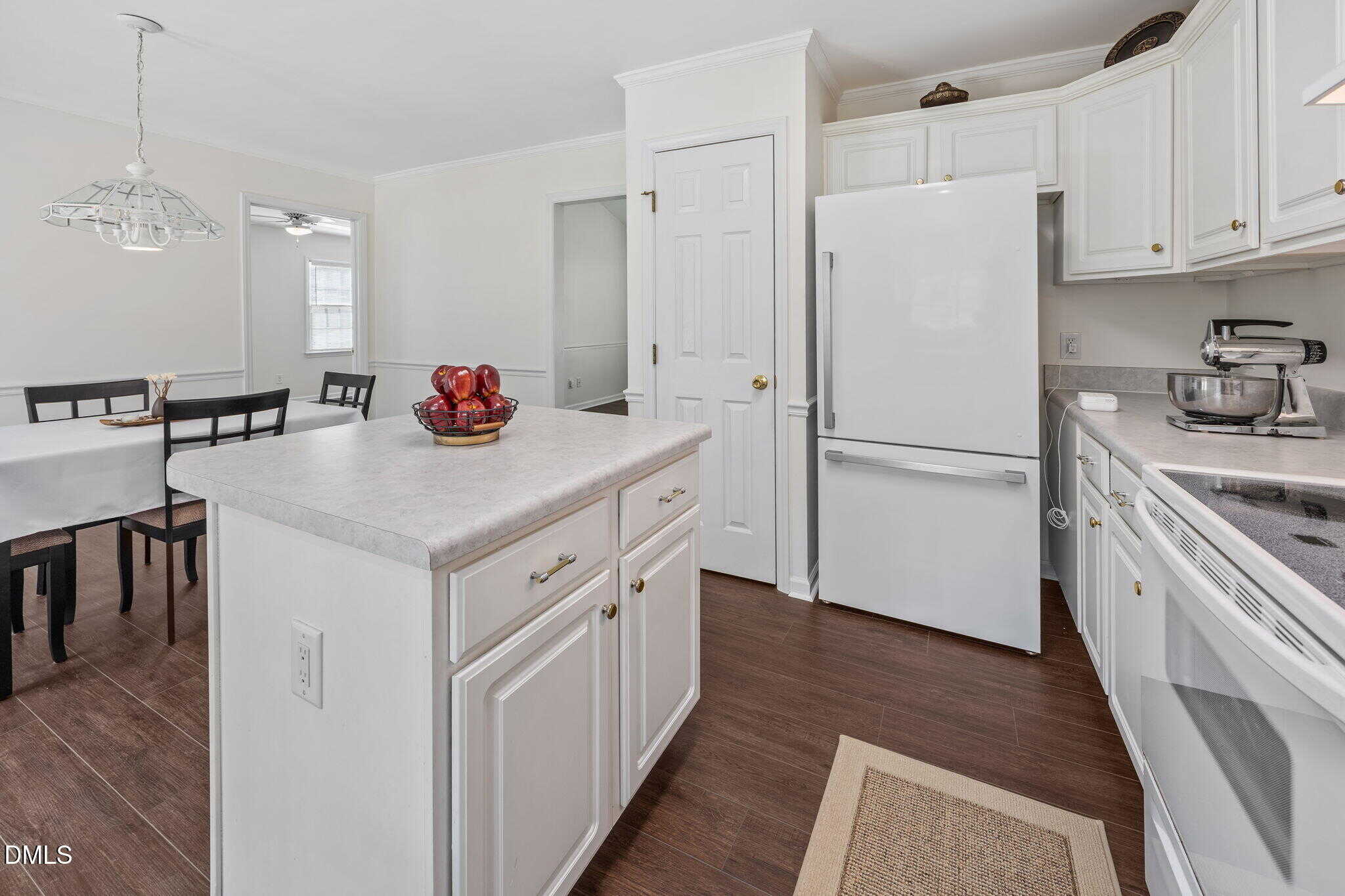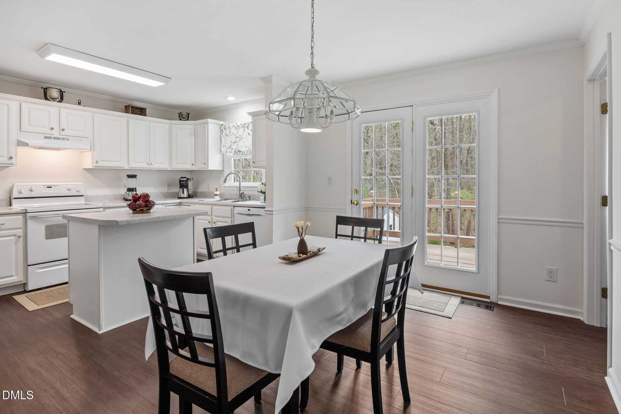 The bright and airy kitchen showcases white cabinetry with crown trim, marble-inspired countertops, white appliances, and detailed trim work including crown molding and chair rail. The adjoining dining area features an updated chandelier along with crown molding and chair rail for added charm.