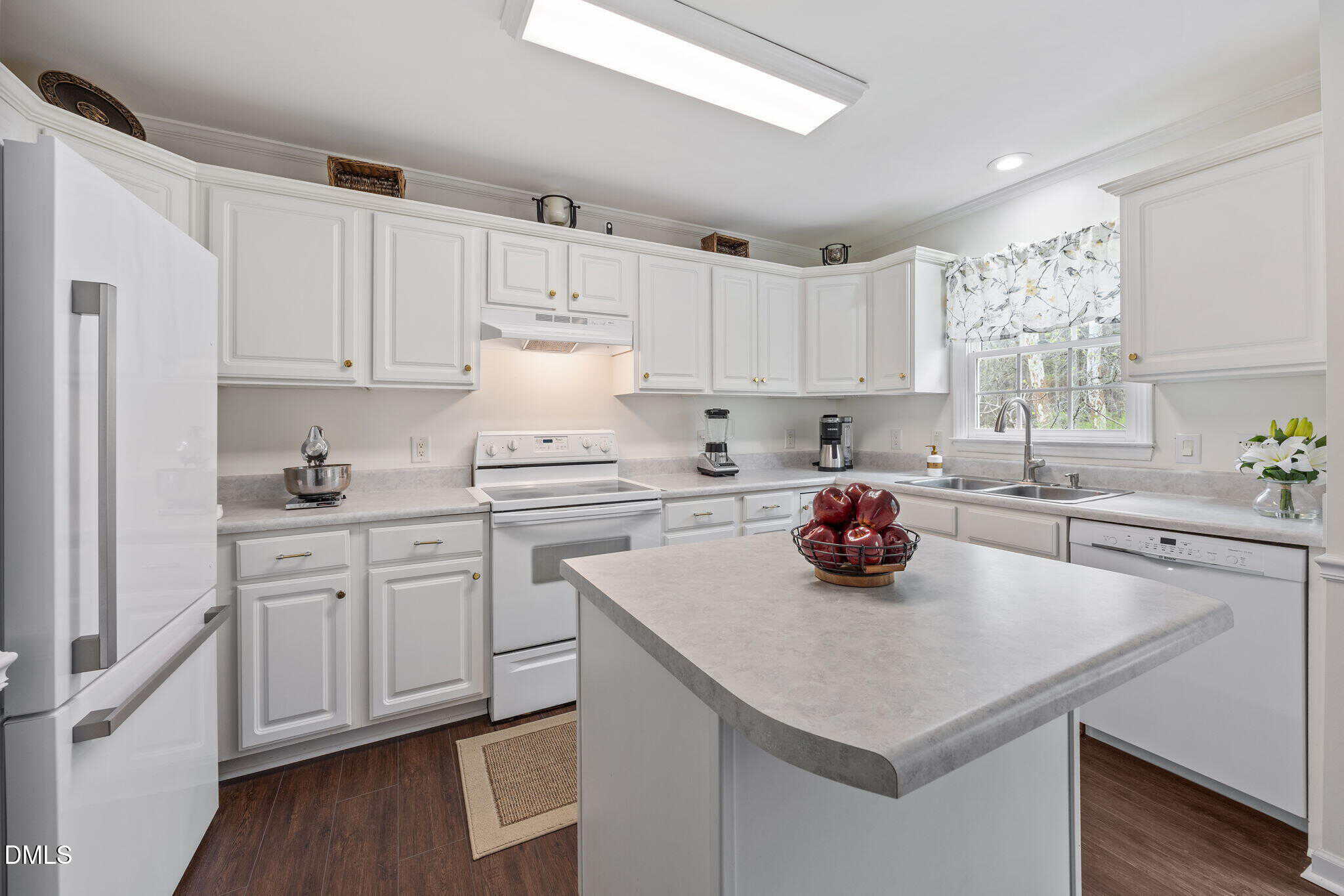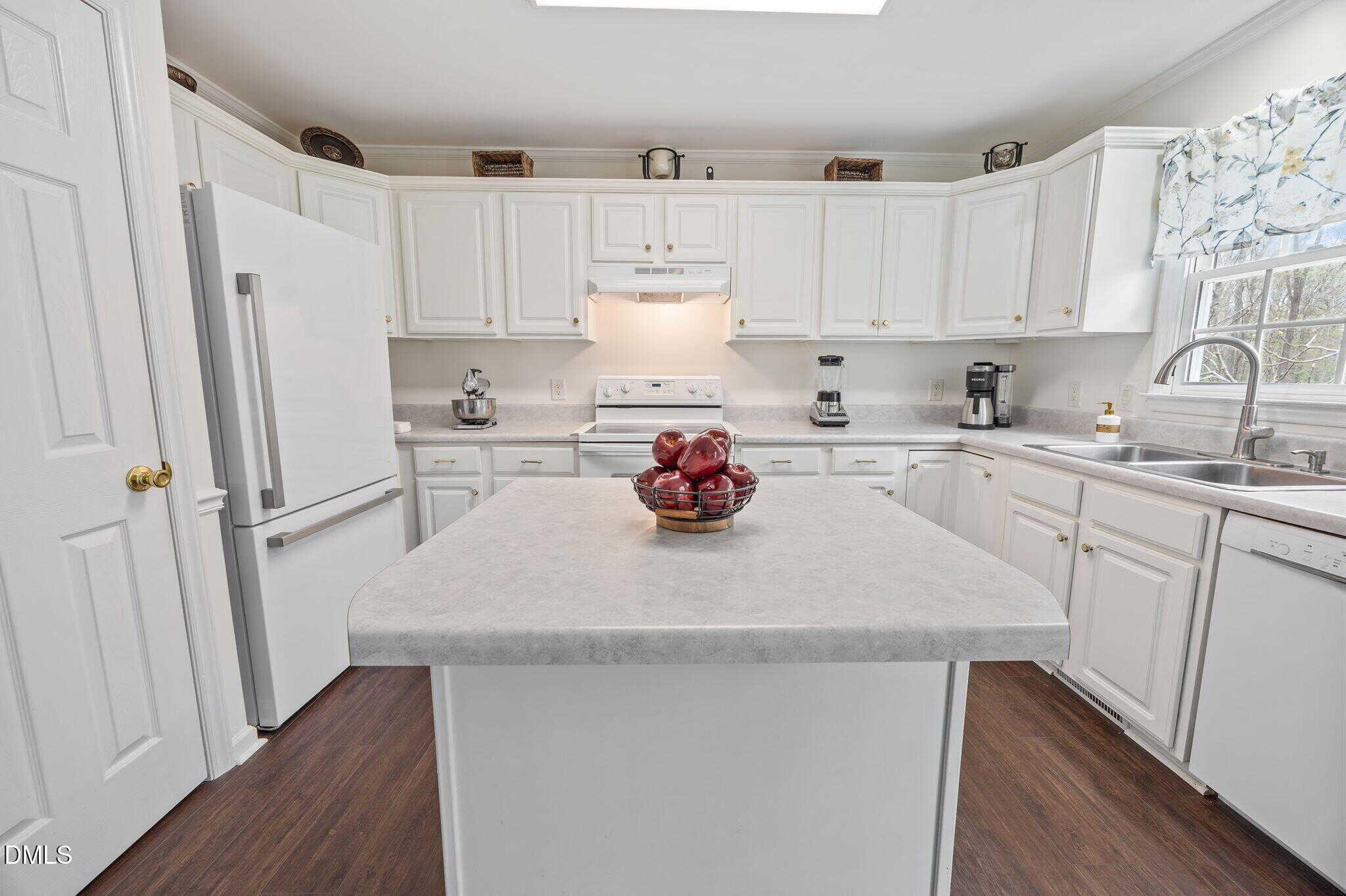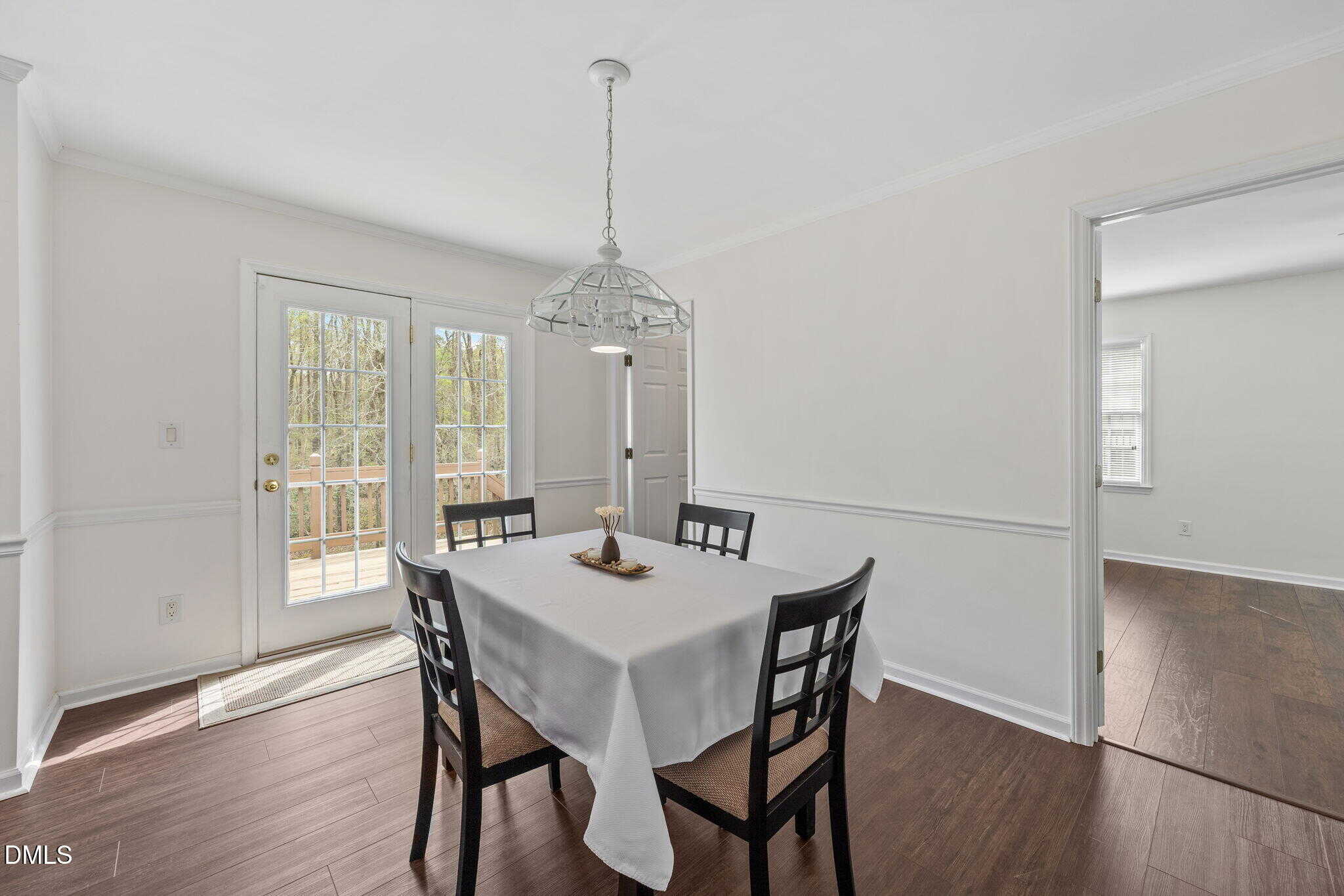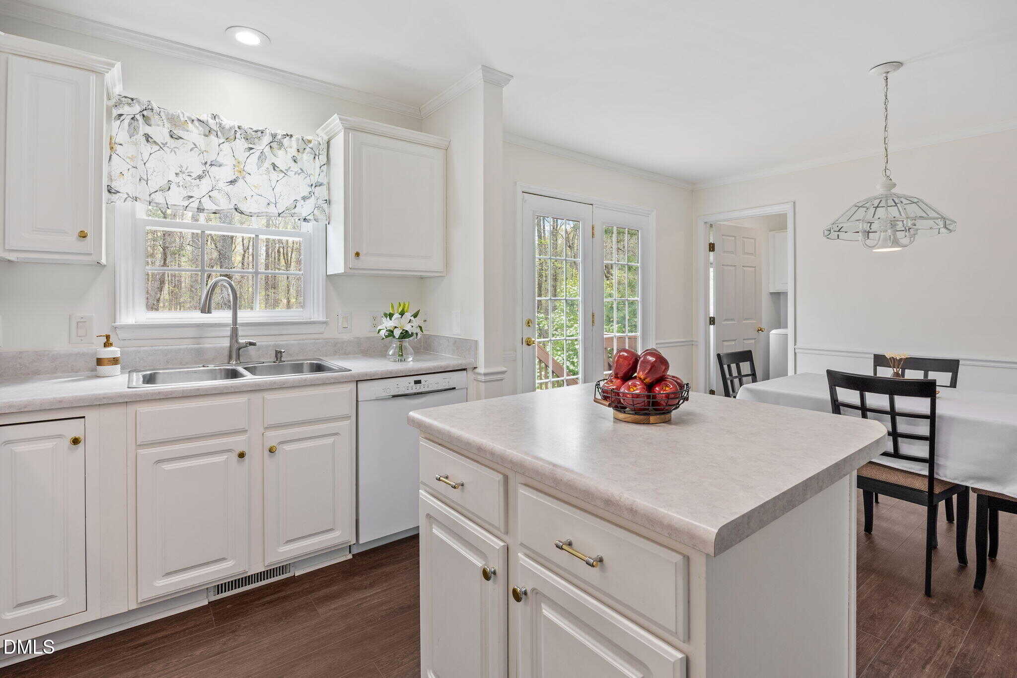 The bright and airy kitchen showcases white cabinetry with crown trim, marble-inspired countertops, white appliances, and detailed trim work including crown molding and chair rail. The adjoining dining area features an updated chandelier along with crown molding and chair rail for added charm.