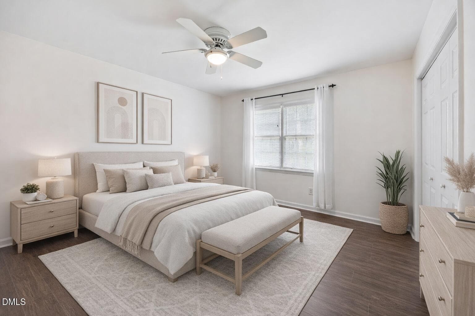 A laundry room just off the kitchen offers wall-to-wall storage cabinets for excellent functionality, and the refrigerator, washer, and dryer are all included.