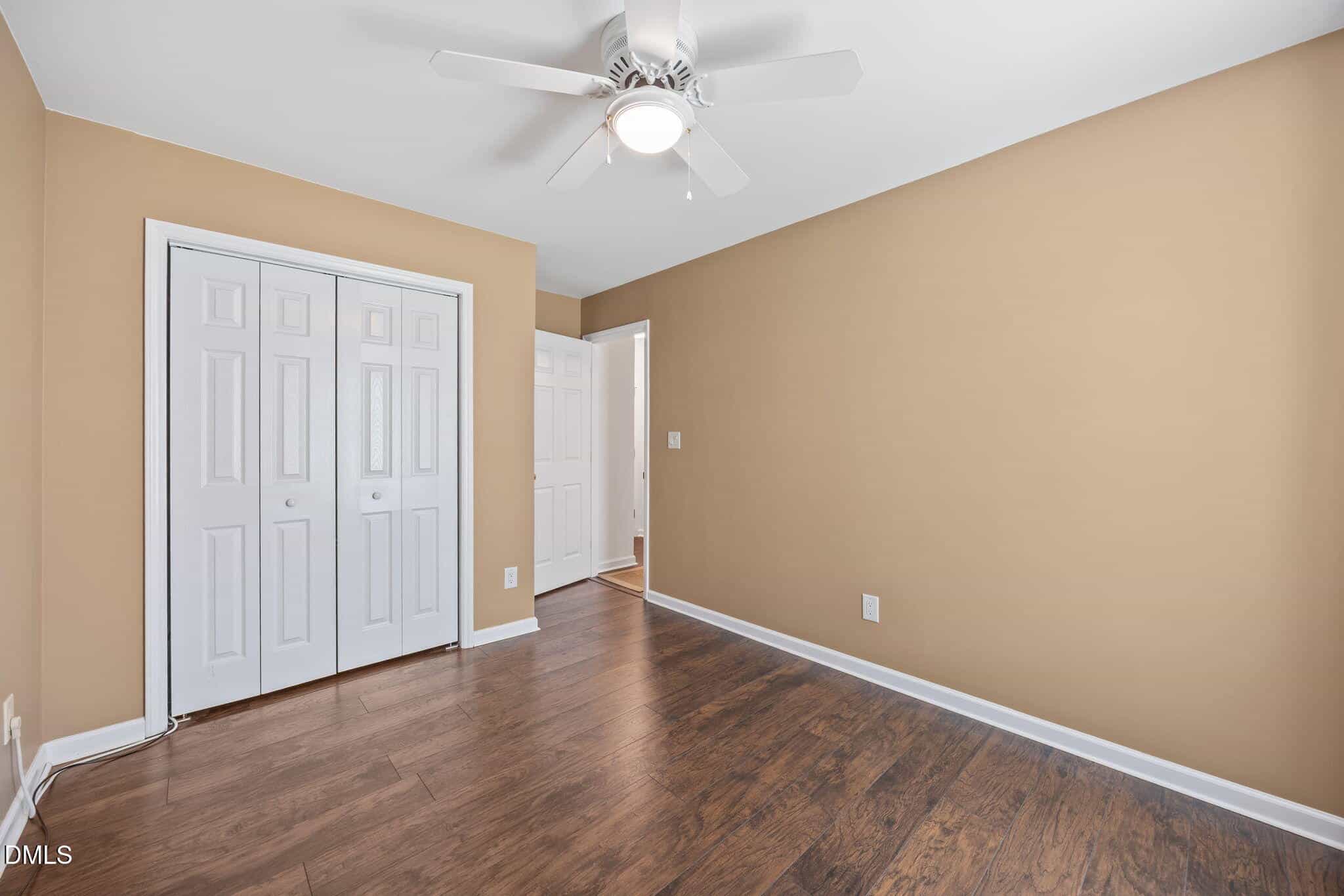 The spacious owner’s suite includes an updated ceiling fan with light and a walk-in closet with wood shelving. The en-suite bath features white cabinetry, cultured marble countertops, brushed nickel fixtures, and a walk-in shower.