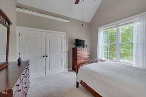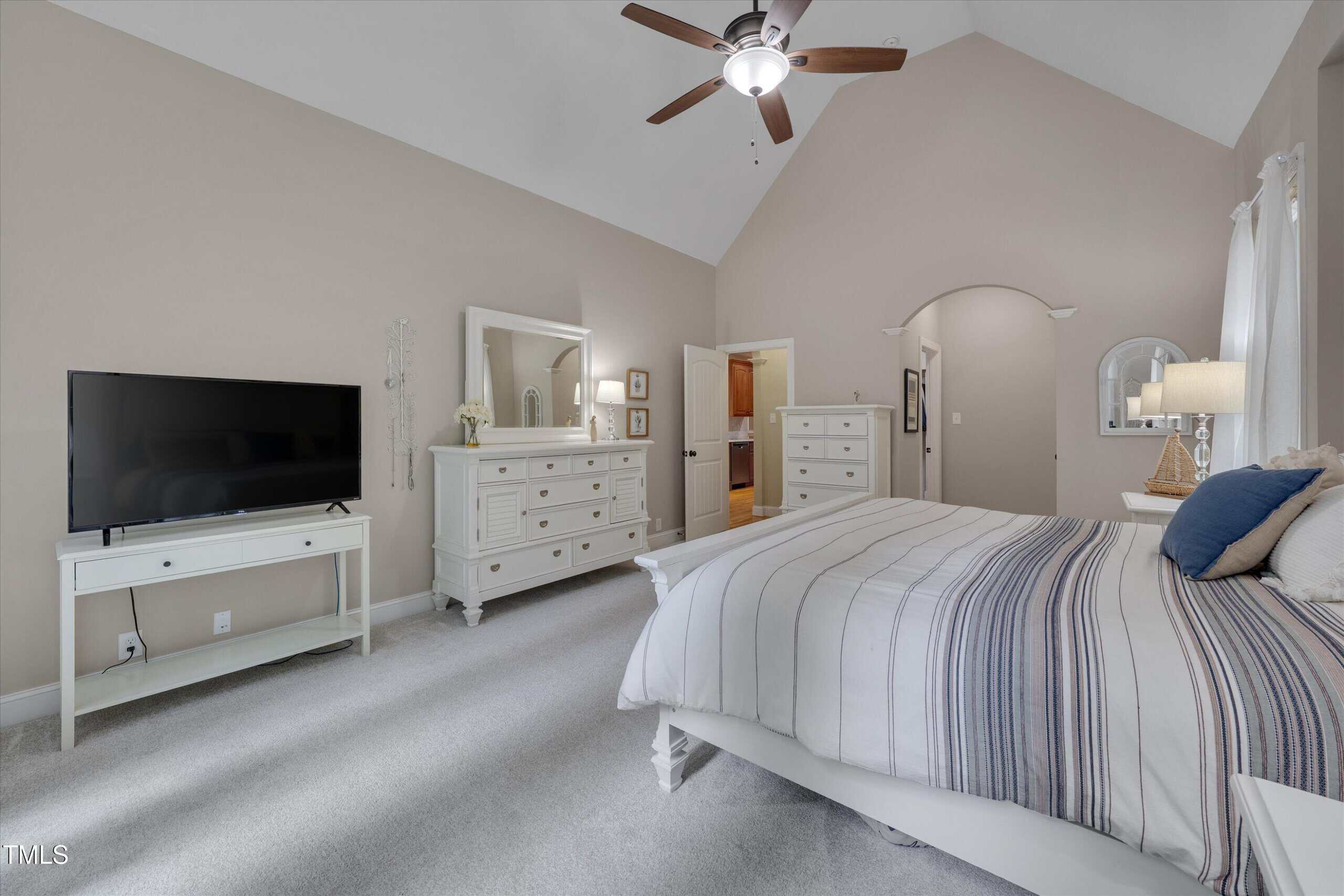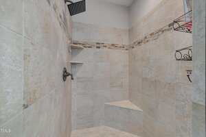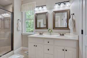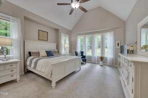 Two spacious guest bedrooms share a full baths, while the third guest bedroom has it’s own bath and would be perfect for elderly parents or a teenage kid. The primary suite is a true sanctuary with vaulted ceilings, a bay window, abundant natural light, walk-in closet with wooden shelving, and a spa-like bath with dual vanities, walk-in shower, linen closet, and private toilet room.