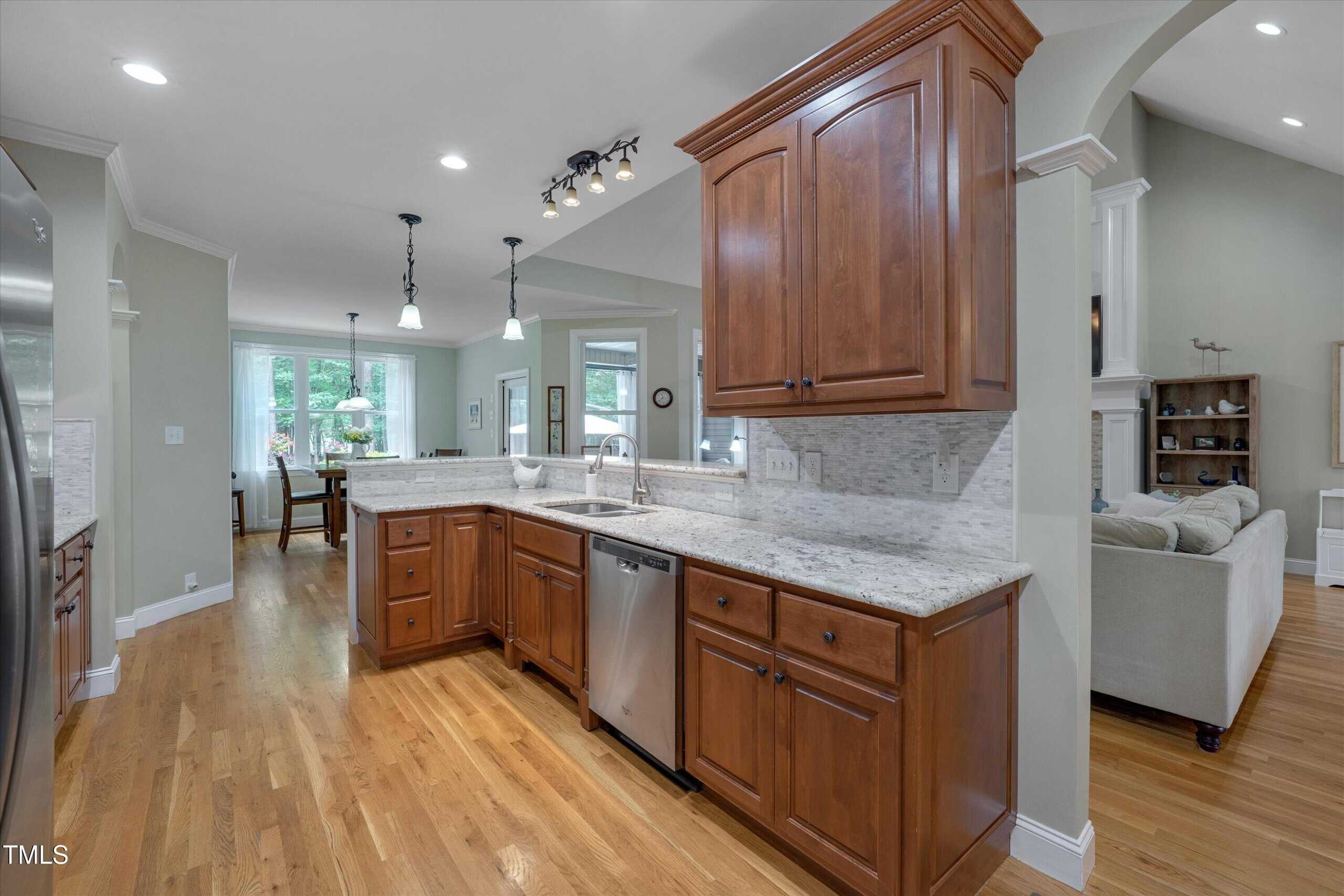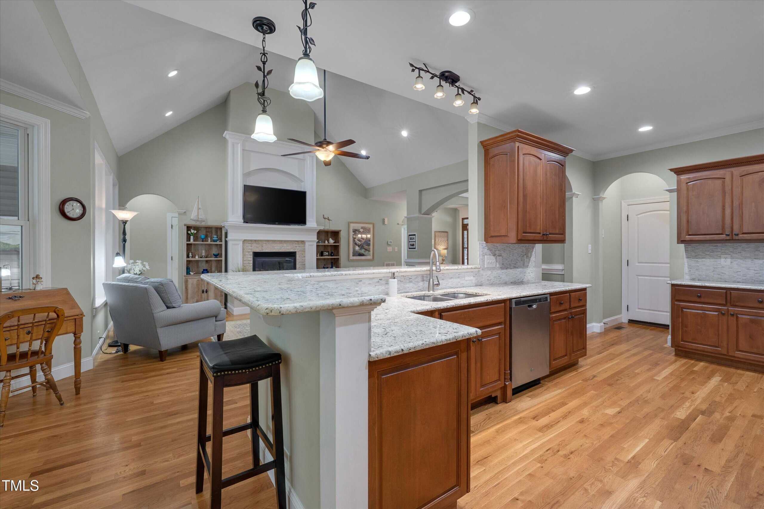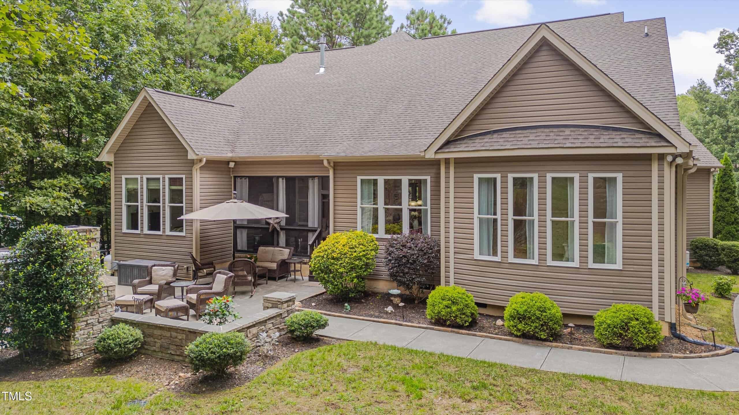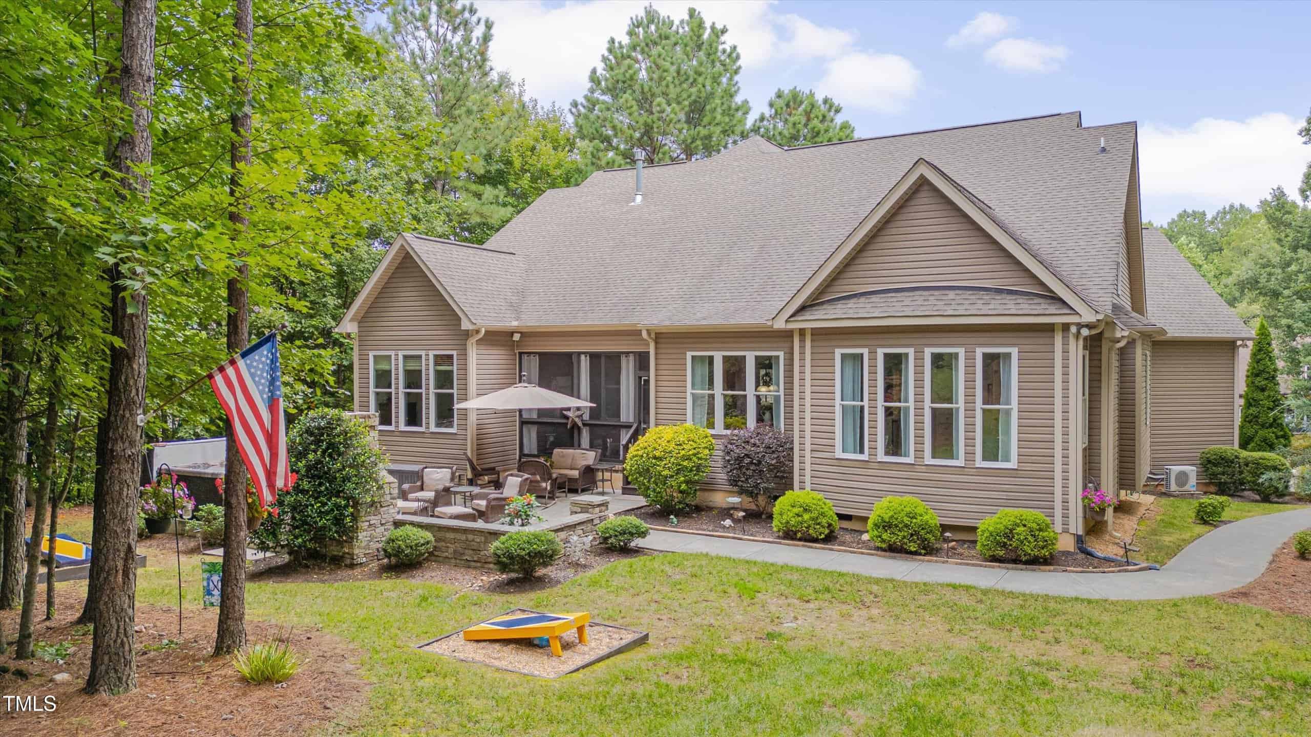 Lucky for you, the buyer got cold feet and this home is back on the market! Discover comfort, style, and thoughtful details in this beautifully maintained ranch with four bedrooms on the first floor. The main living area boasts gleaming hardwood floors, while bedrooms and the bonus feature soft carpet and bathrooms are finished with durable tile. The family room welcomes you with a propane fireplace, vaulted ceilings, recessed lighting, ceiling fan, and rich trim work. Enjoy gatherings with family and friends in the elegant dining room with its custom tray ceiling. The kitchen is a chef’s delight, featuring stainless steel appliances (including refrigerator), granite counters, tile backsplash, a lazy Susan, generous cabinetry, and a large pantry—plus a sunny breakfast area overlooking the amazing backyard. The laundry room includes shelves, and the washer and dryer convey. Two spacious guest bedrooms share a full baths, while the third guest bedroom has it’s own bath and would be perfect for elderly parents or a teenage kid. The primary suite is a true sanctuary with vaulted ceilings, a bay window, abundant natural light, walk-in closet with wooden shelving, and a spa-like bath with dual vanities, walk-in shower, linen closet, and private toilet room. The unfinished attic offers room for additional finished space, while the inviting bonus room—complete with a mini split, mini bar, built-in speakers, and a cozy window seat—makes the perfect retreat. Step outside to a screened porch with ceiling fan, or relax on the patio by the stone fireplace and hot tub, surrounded by a beautiful, private backyard with a drive-in storage shed—no homes behind you for extra privacy. This yard is every family’s dream. The covered front porch also features a ceiling fan, perfect for unwinding. Additional highlights include a 2-car garage with opener, a long driveway, and a walk-in crawlspace with water heater. The concrete walkway from the drive way to the back porch allows someone with mobility issues to enter the home without climbing the steps to the front door. This home blends function, charm, and room to grow—ready for you to move right in! With this home you get the best of two worlds … a small quiet neighborhood tucked away from hectic city life just 30 minutes from Raleigh.
