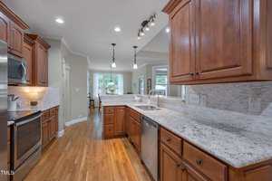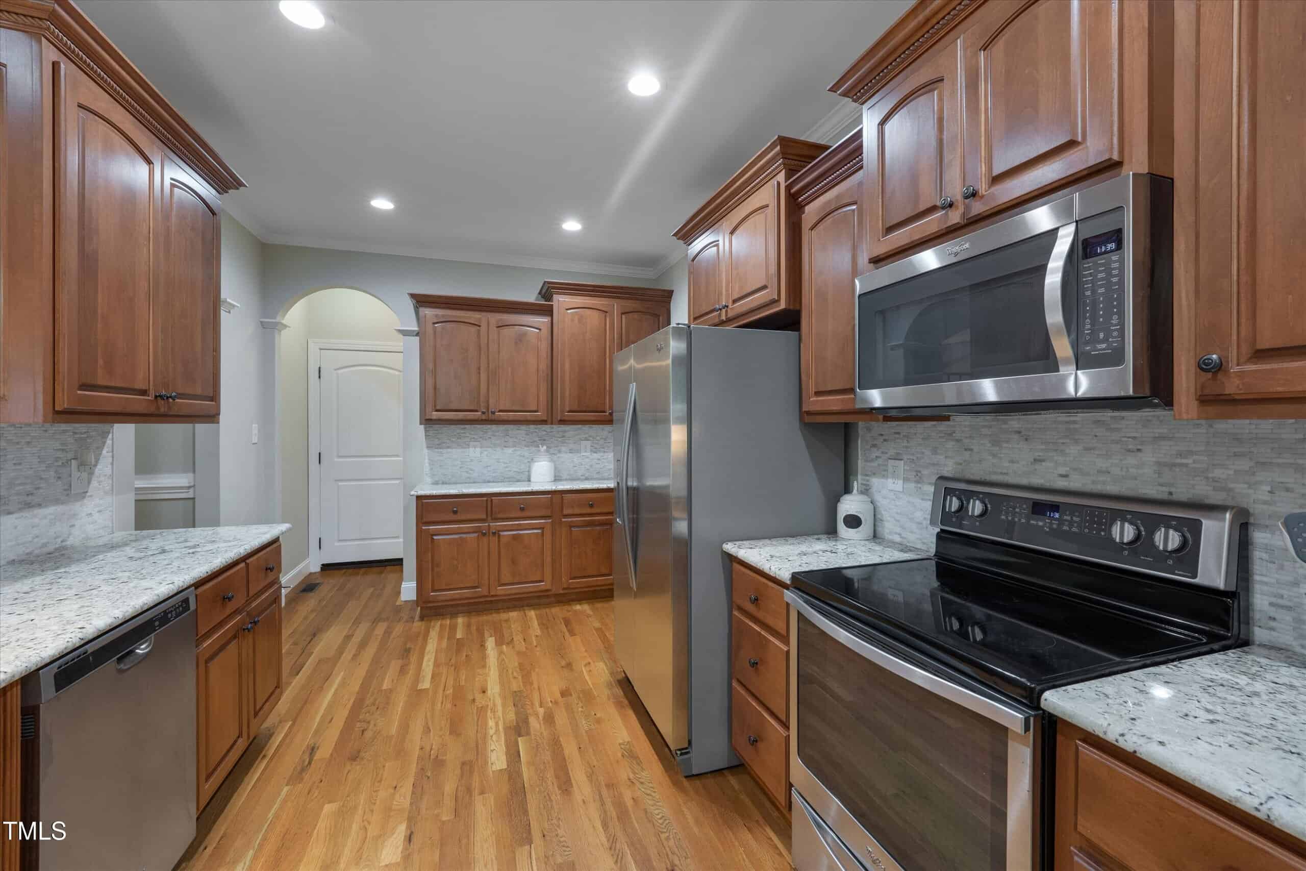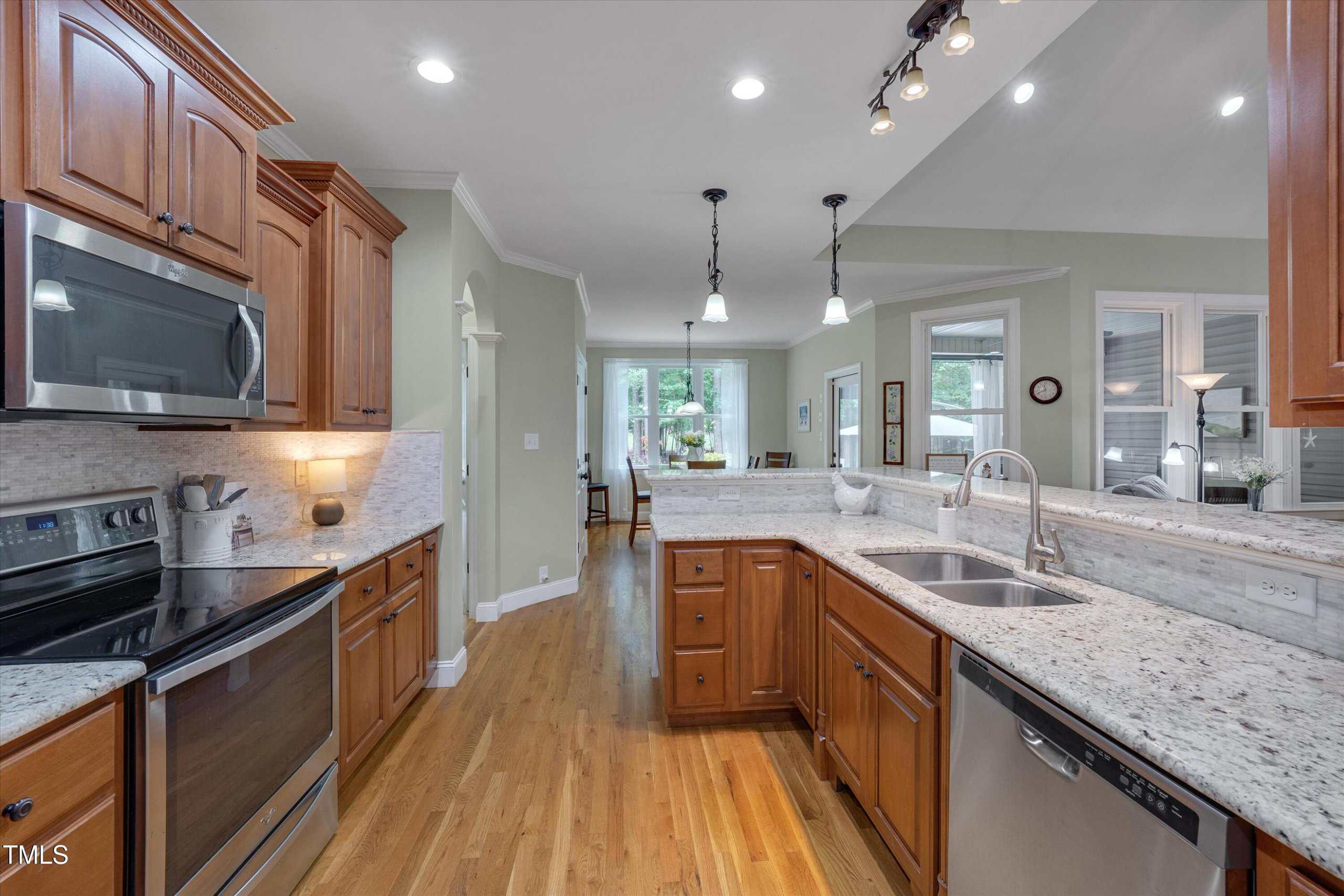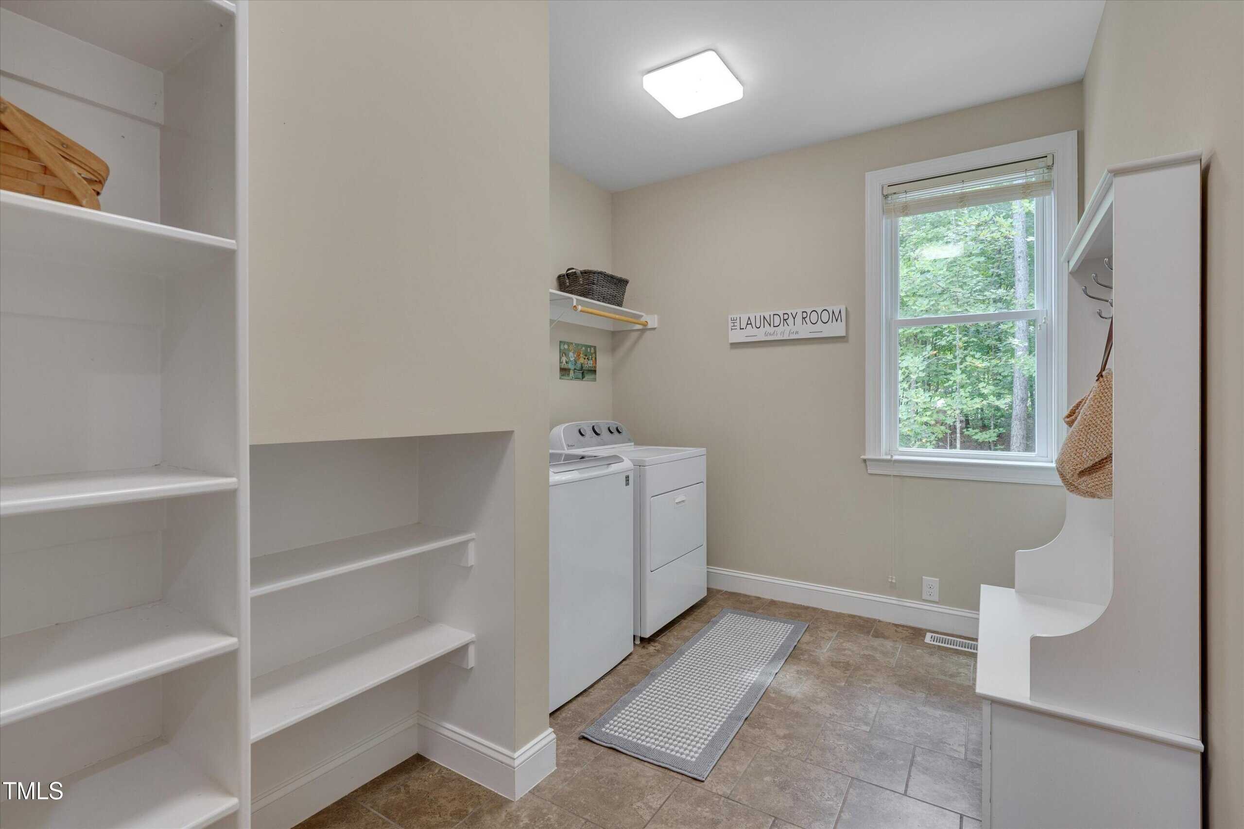 The kitchen is a chef’s delight, featuring stainless steel appliances (including refrigerator), granite counters, tile backsplash, a lazy Susan, generous cabinetry, and a large pantry—plus a sunny breakfast area overlooking the amazing backyard. The laundry room includes shelves, and the washer and dryer convey.