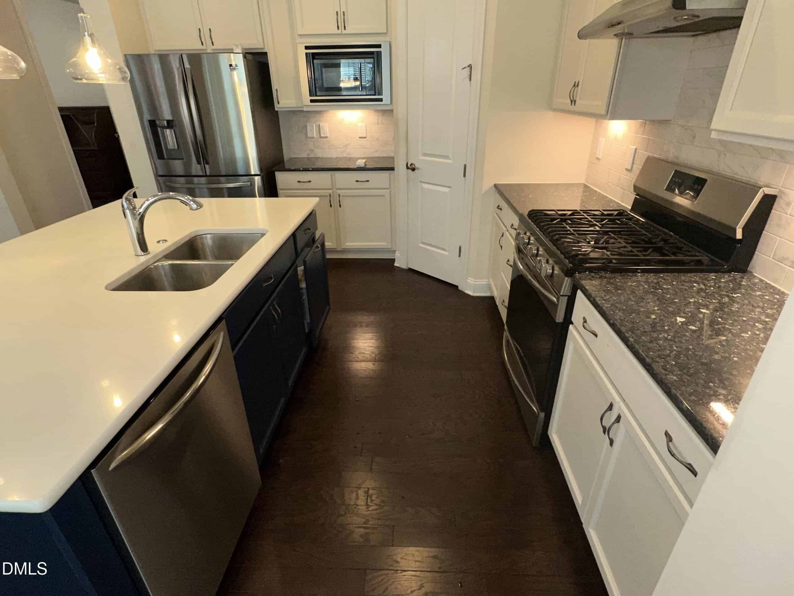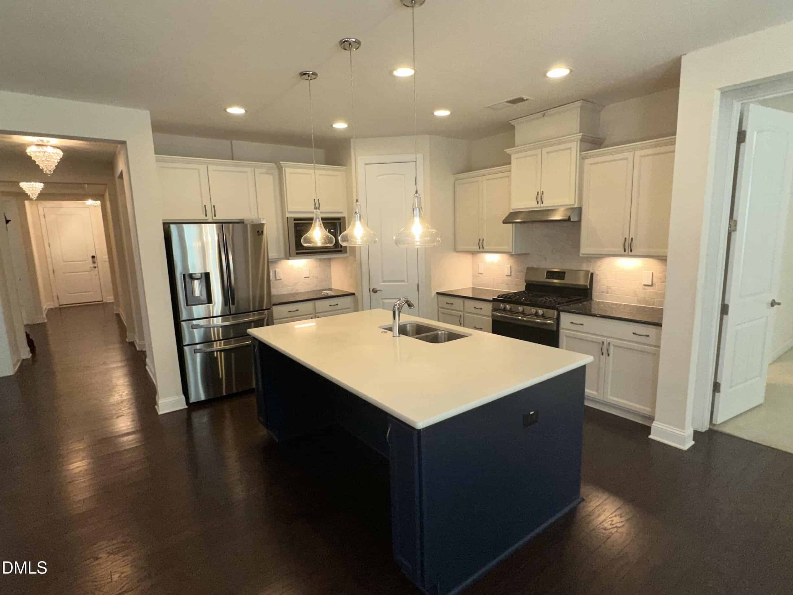 The well-appointed kitchen is a true centerpiece, featuring stainless steel appliances, a large solid-surface island, and ample space for gathering with family and friends. Whether you’re hosting or enjoying a quiet night in, this layout delivers both functionality and style.