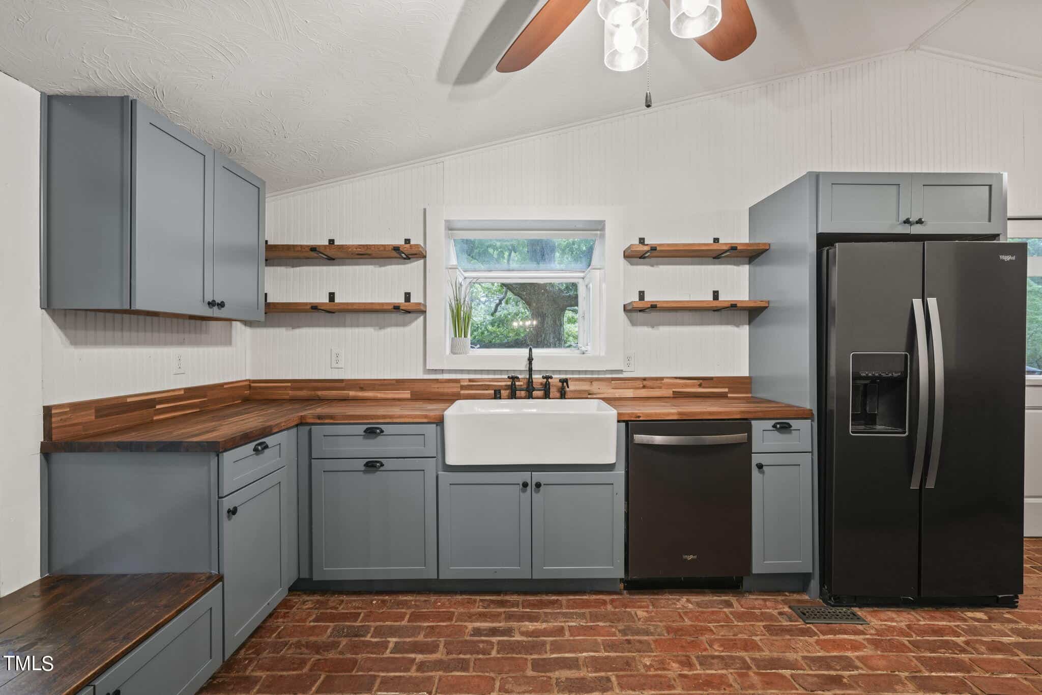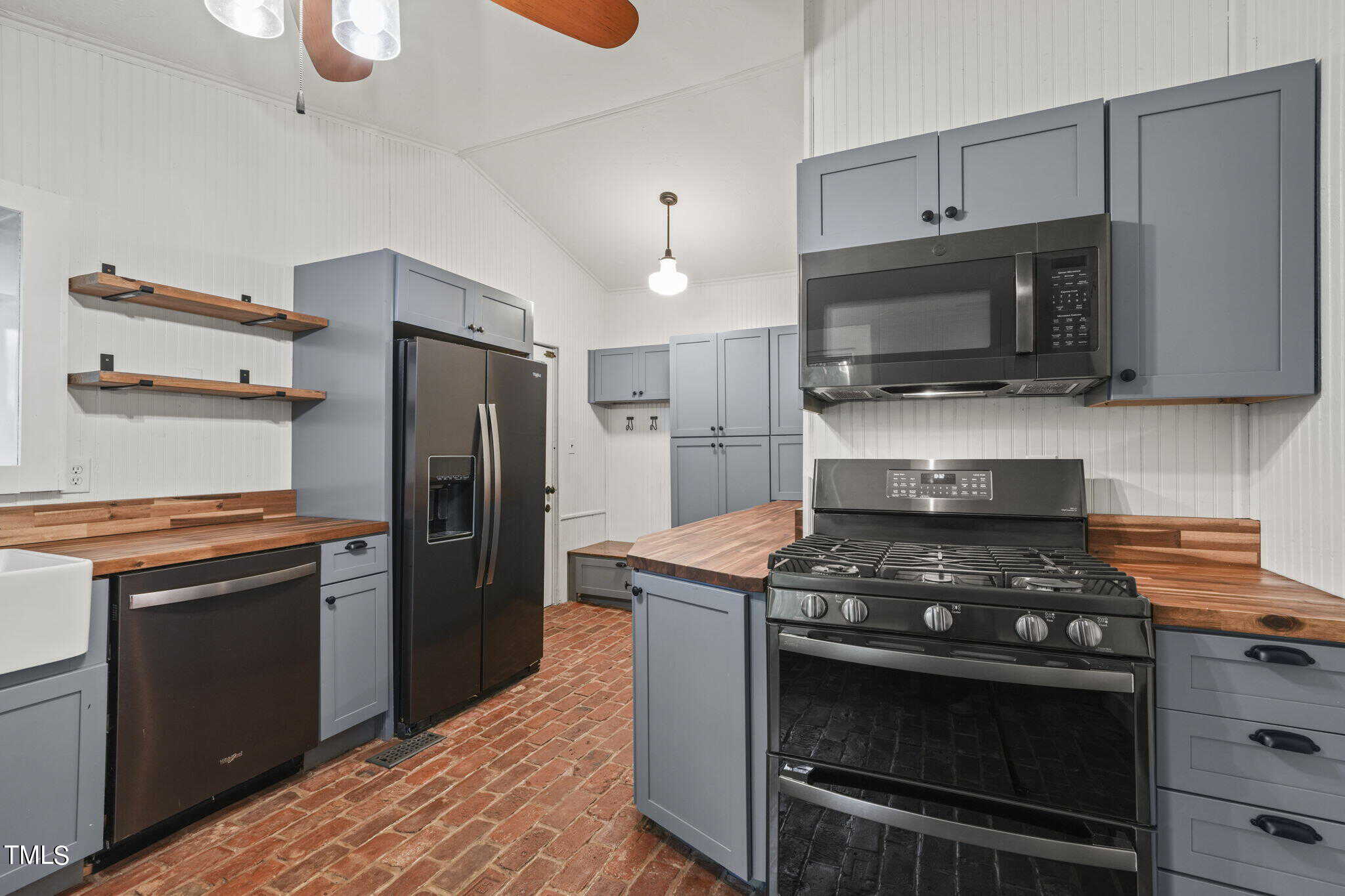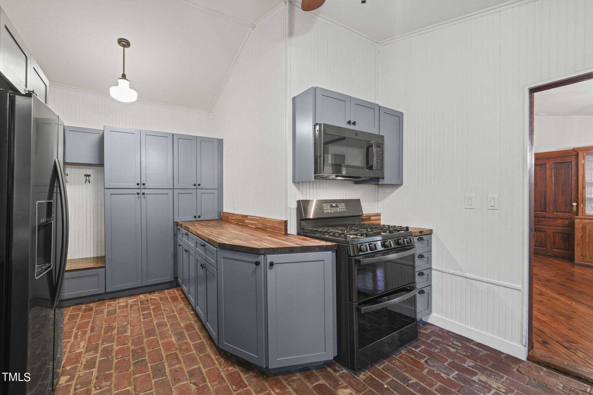 The dining room has a large bay window with built-in seat as well as built-in closets and china cabinet. Get inspired in the well laid-out kitchen that showcases a ton of recently installed countertops and cabinets that have soft-close drawers and doors. Enjoy looking out over the pond while standing at the large farm sink and garden window where you can grow your fresh cooking herbs. Cook for all of your friends and family in the newer freestanding double oven with gas range. One of the amazing design features is the brick floor that passes through the kitchen and to the door that leads out to the screened back porch.