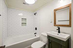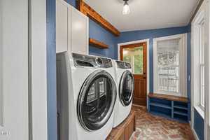 There is a second full bathroom with tile floors and a tile-surround walk-in shower on the main floor along with a separate laundry room with herringbone pattern laid brick floors. Note, the brick floors in the kitchen and laundry room are reclaimed from New England textile mills with manufacturing dates between 1890 and 1920. Upstairs is a small loft perfect for a pocket office, two additional bedrooms and a full bath with tile surround tub/ shower combo.
