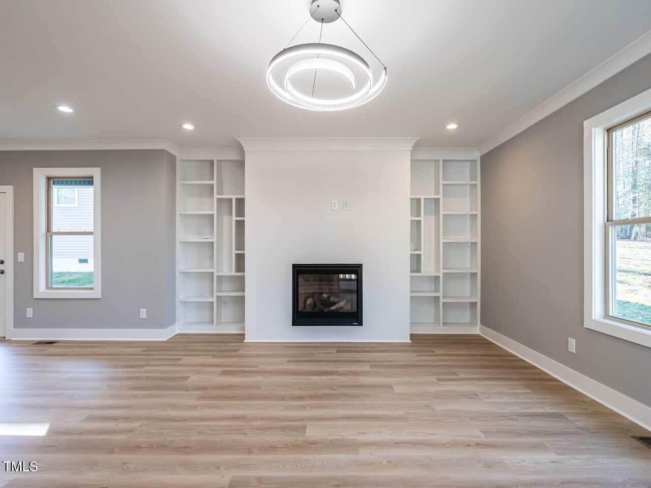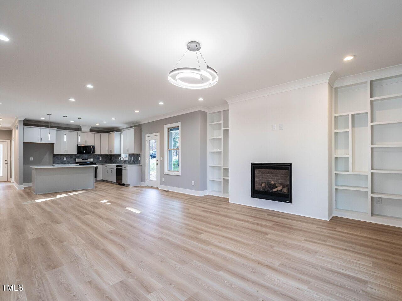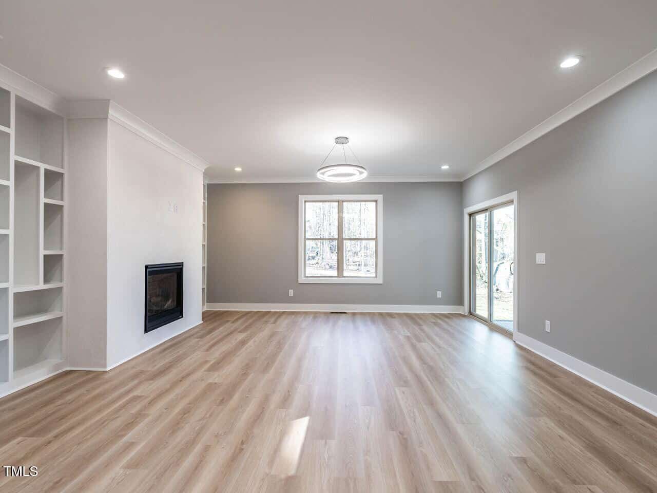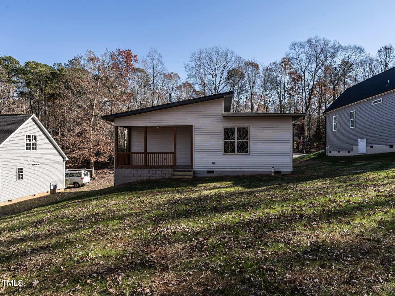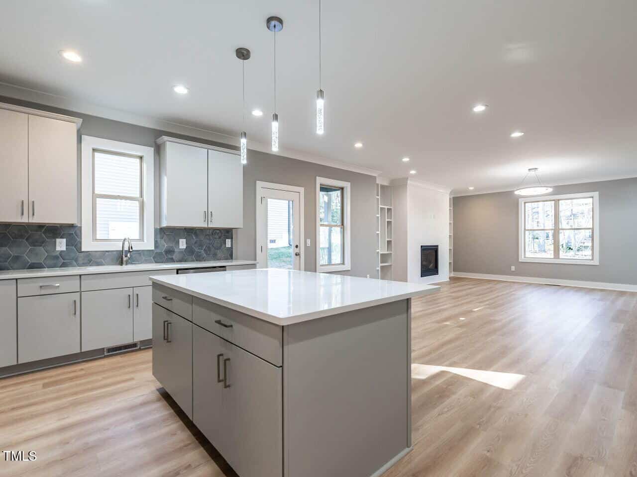 Classic Mid Century modern Ranch design by Lilium Homes. Open floor plan with large kitchen with center island, gas range & large pantry. Family room has built in shelves surrounding the gas fireplace and opens to large covered porch overlooking level back yard. LVL floors everywhere but bedrooms. Custom built closets and trim work throughout home. Spacious primary suite offers his and hers closets, zero entry shower w/double vanity. This plan has a side friend door for convenience. Builder offering a 10 Year Limited Warranty.