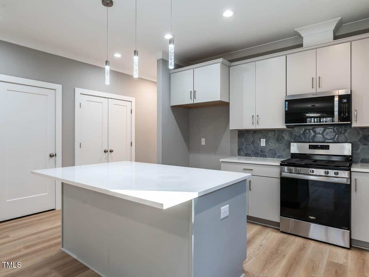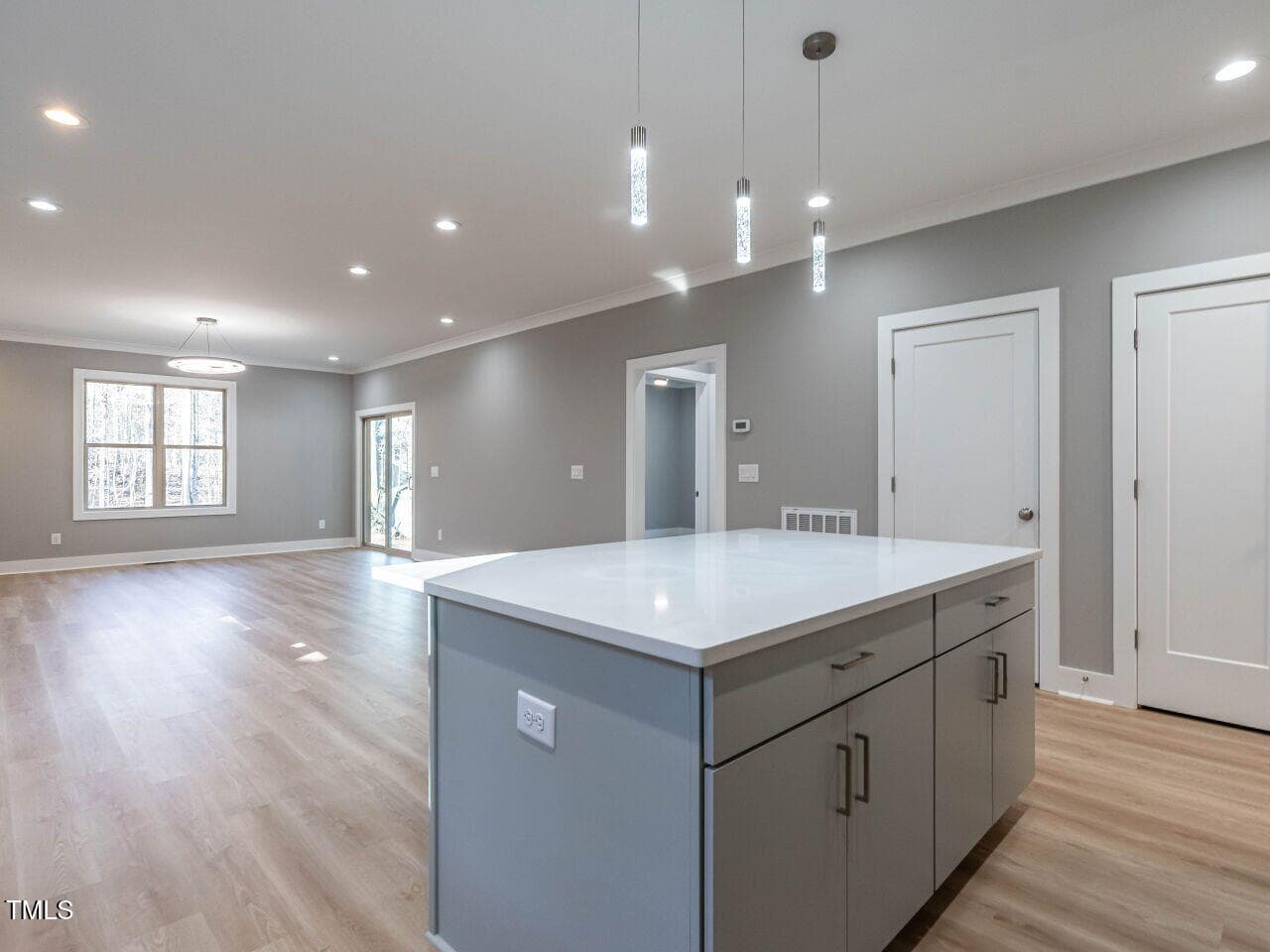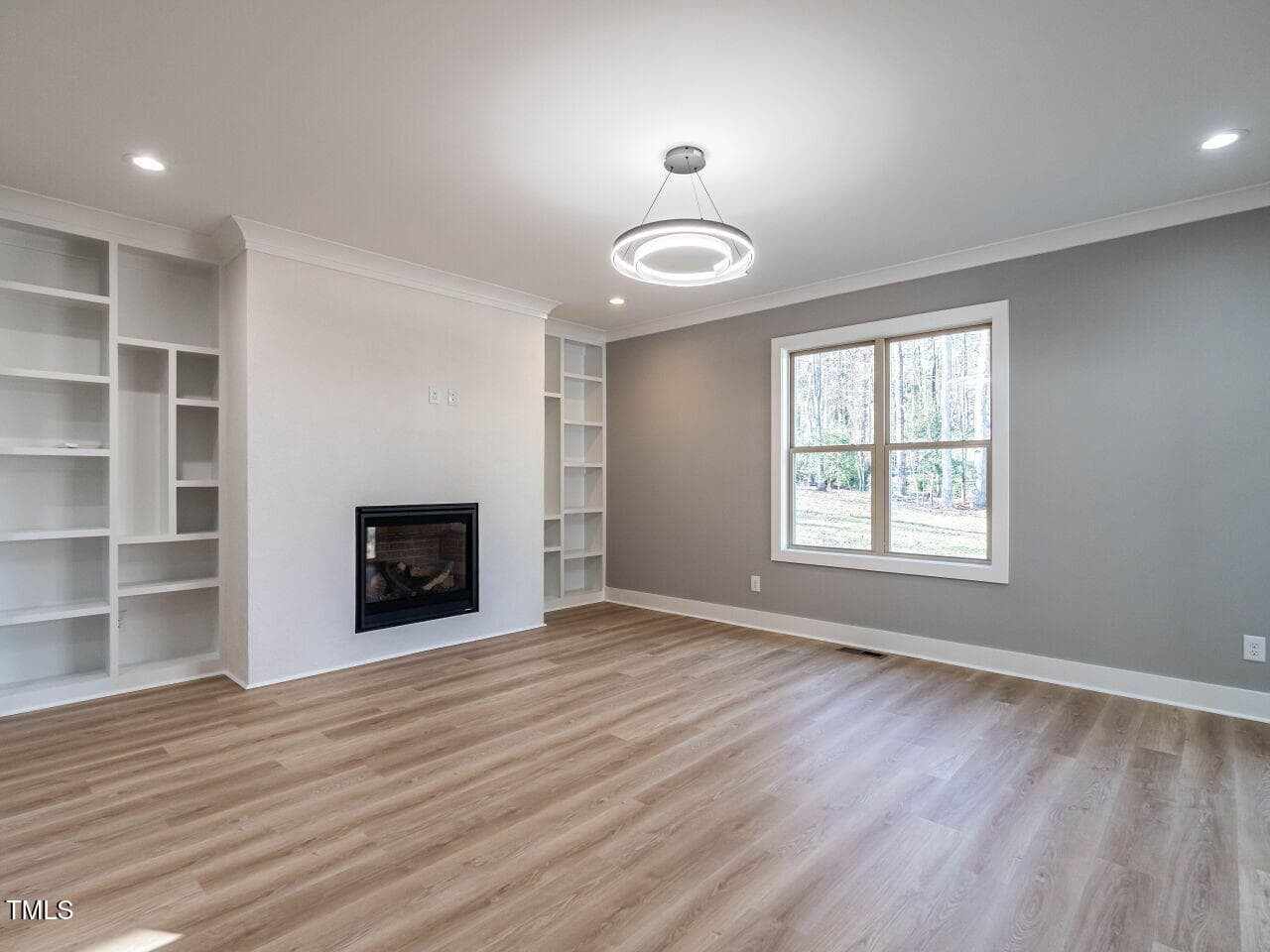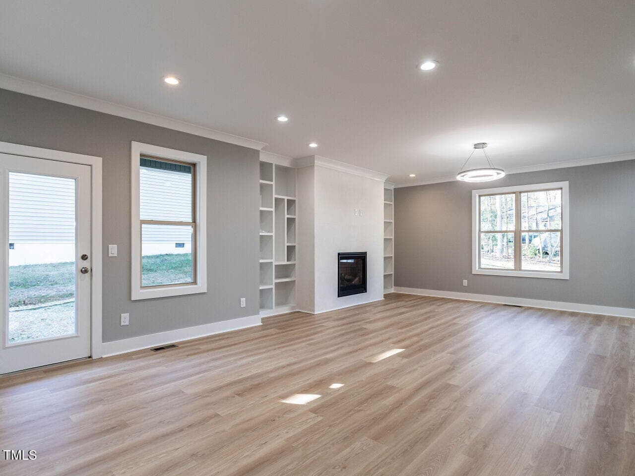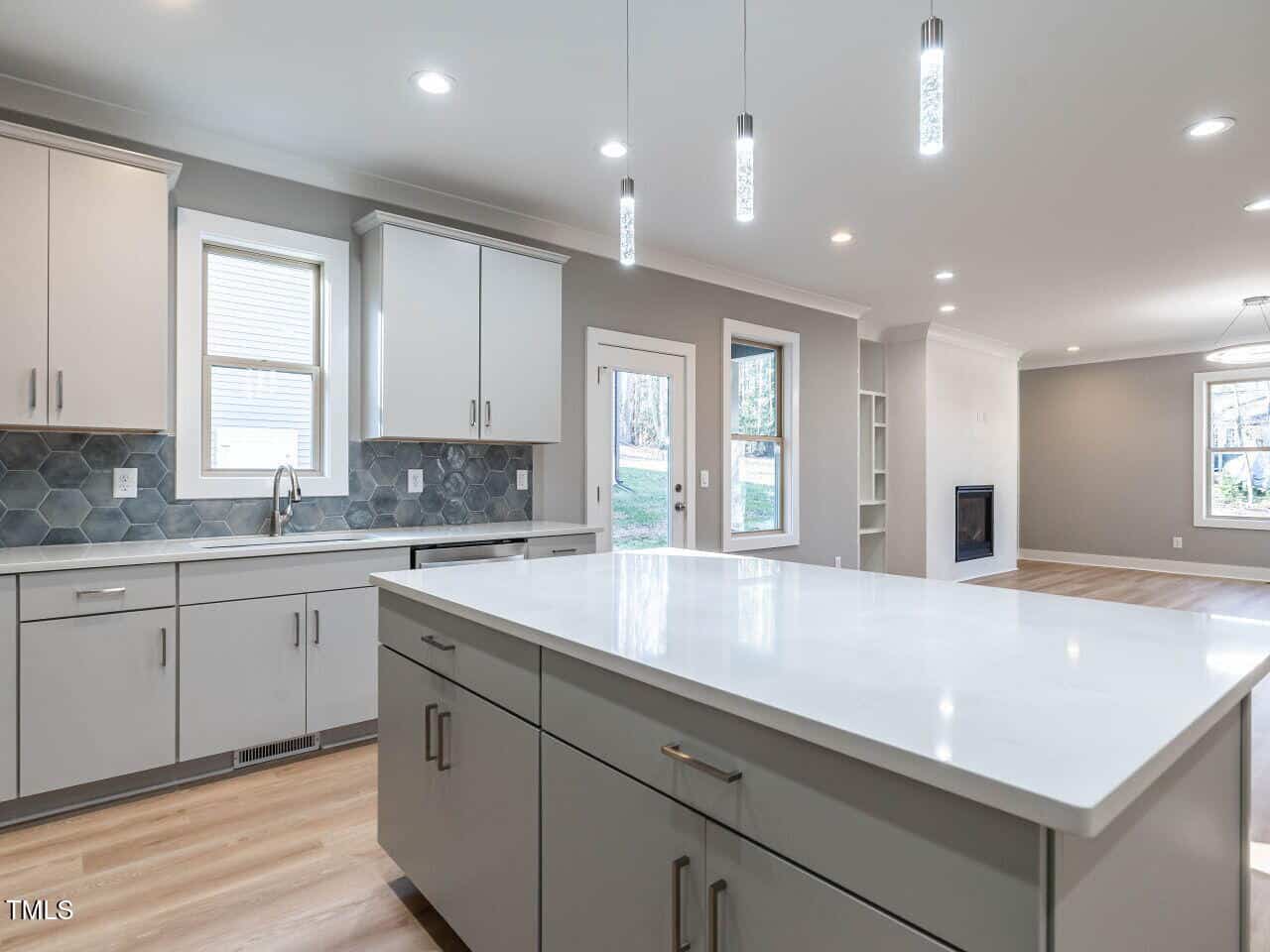 Classic Mid Century modern Ranch design by Lilium Homes. Open floor plan with large kitchen with center island, gas range & large pantry. Family room has built in shelves surrounding the gas fireplace and opens to large covered porch overlooking level back yard. LVL floors everywhere but bedrooms. Custom built closets and trim work throughout home. Spacious primary suite offers his and hers closets, zero entry shower w/double vanity. This plan has a side friend door for convenience. Builder offering a 10 Year Limited Warranty.