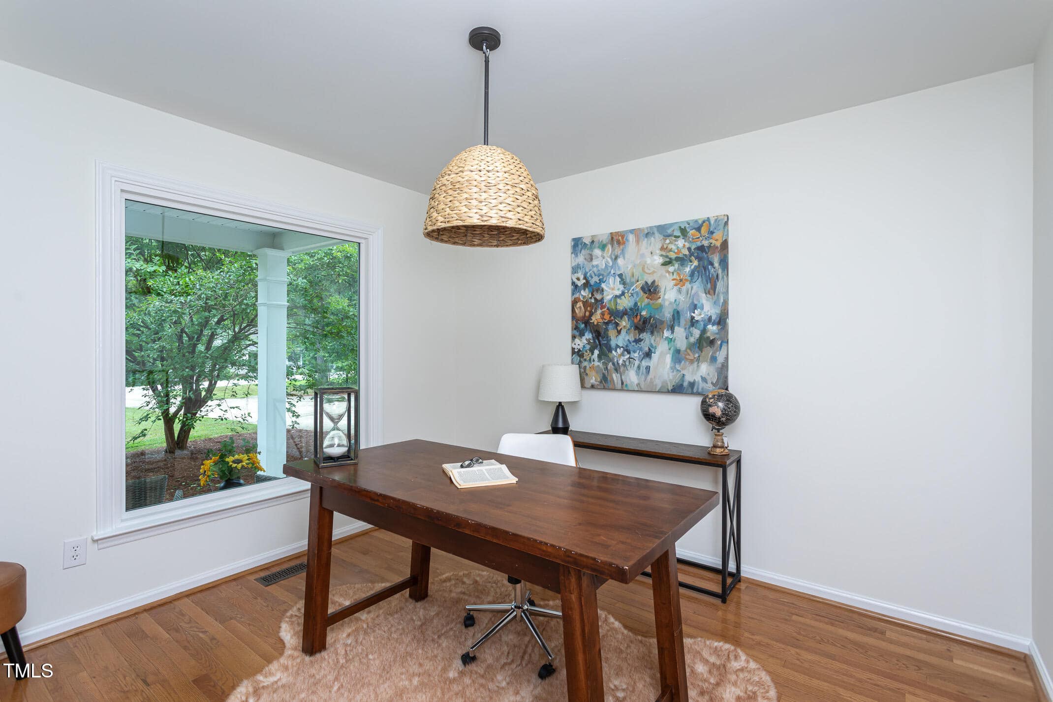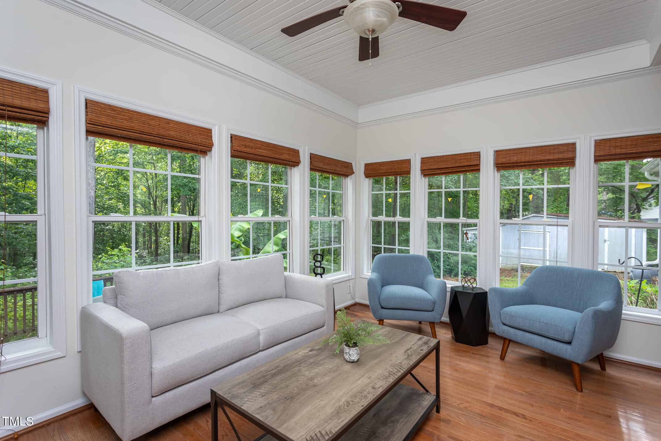 Formerly a formal dining room, the room at the front is separated from the rest of the spaces, ideal for a home office, play space, music room or study. The kitchen delivers plenty of counter space and includes a dining area that has a beautiful view and easy access to the living room and the sunroom. The sunroom, full of windows has built-in bookshelves and creates a cozy secondary space to relax and enjoy friends and family.