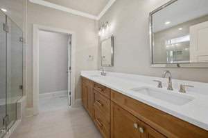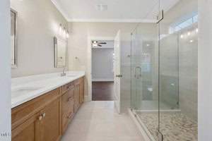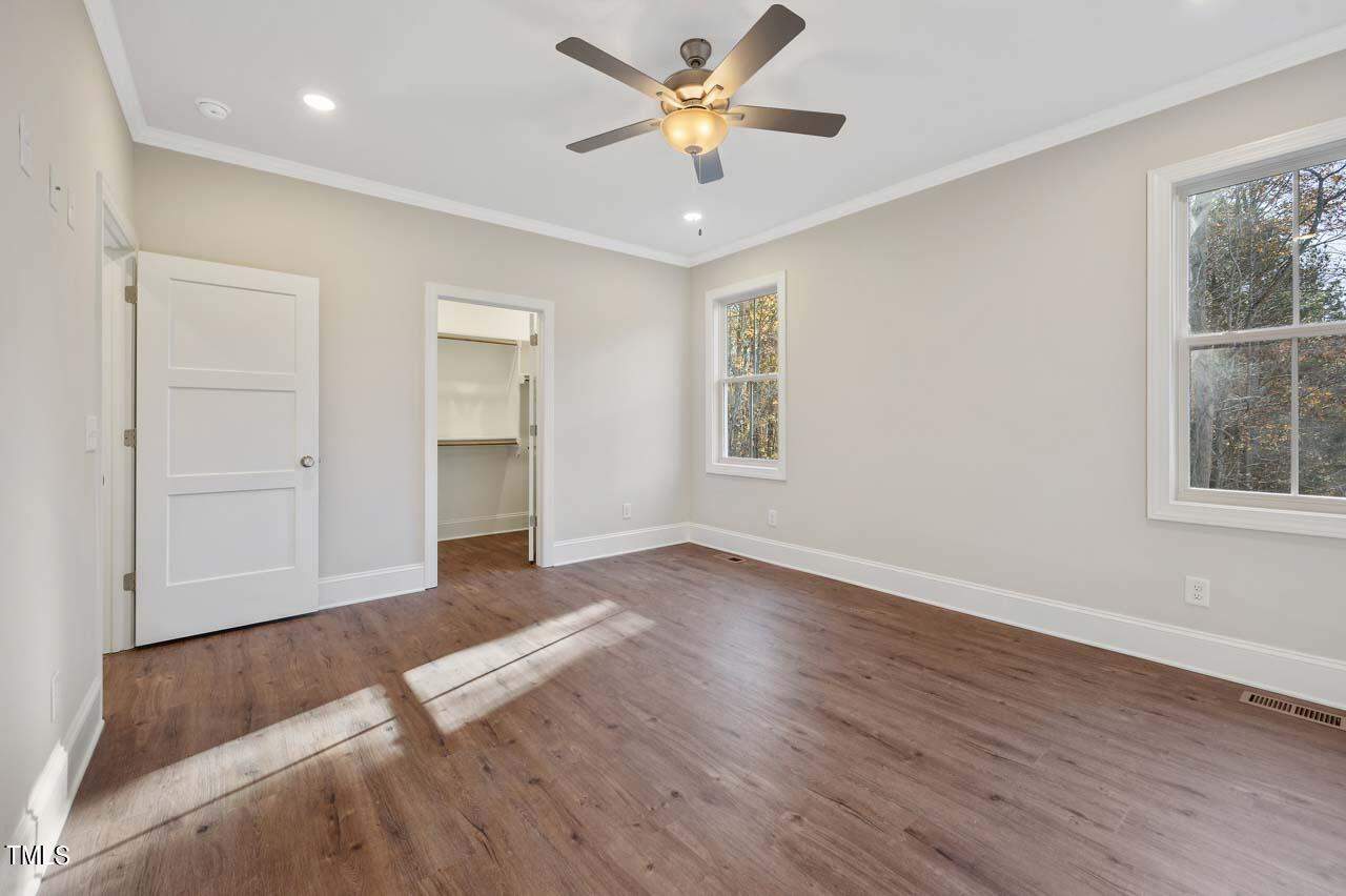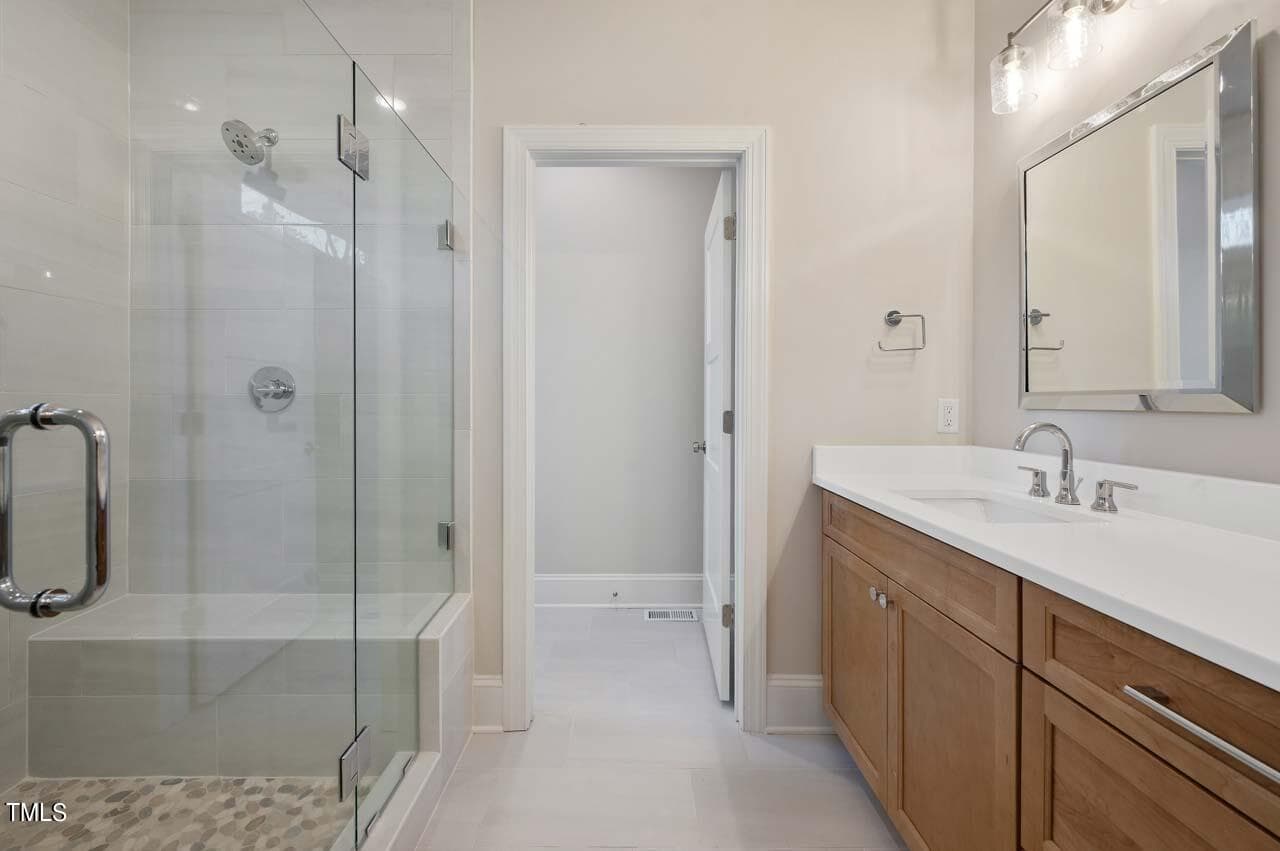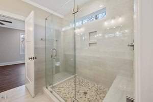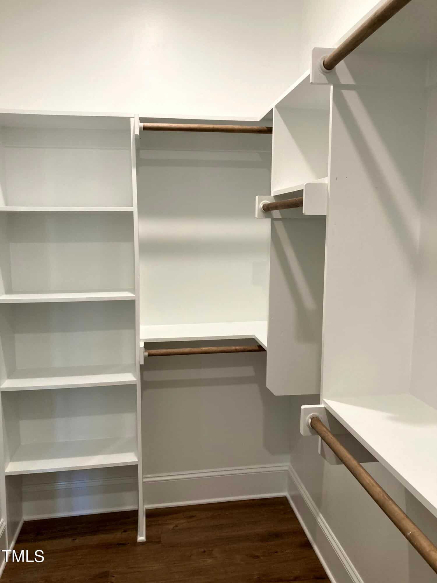 1st floor main bedroom and walk-in closet (with solid shelving and built-ins) has LVP flooring. The gorgeous ensuite bath has a 9′ 2-sink quartz -top vanity (with tons of storage cabinets/drawers), beautiful ceramic tiled floor, and an oversized floor to ceiling gorgeous tiled shower with built-in nooks and bench, and frameless glass shower enclosure, plus a transom window. Private roomy water closet includes a linen closet for even more storage.